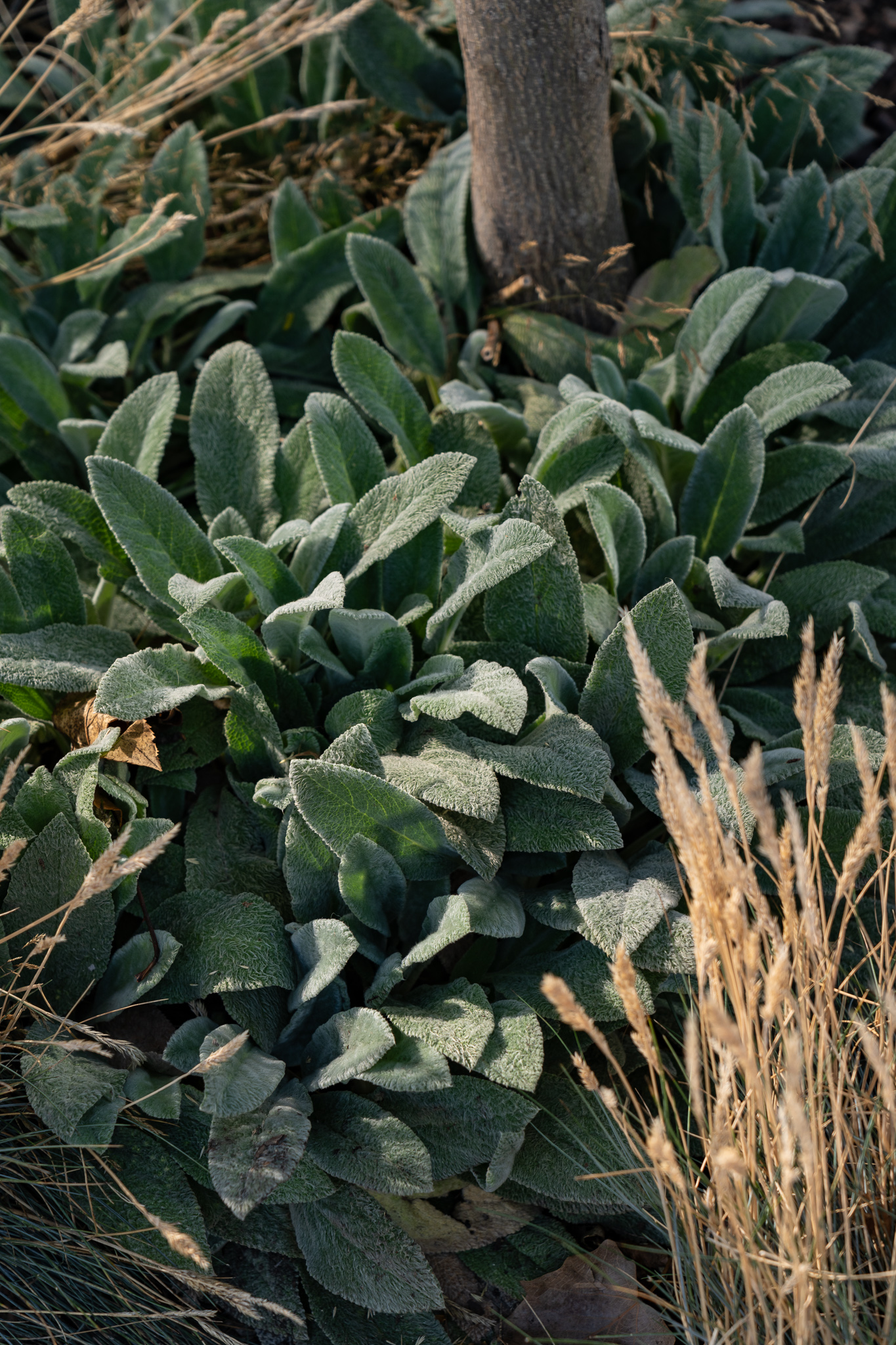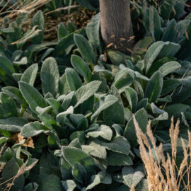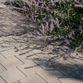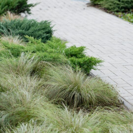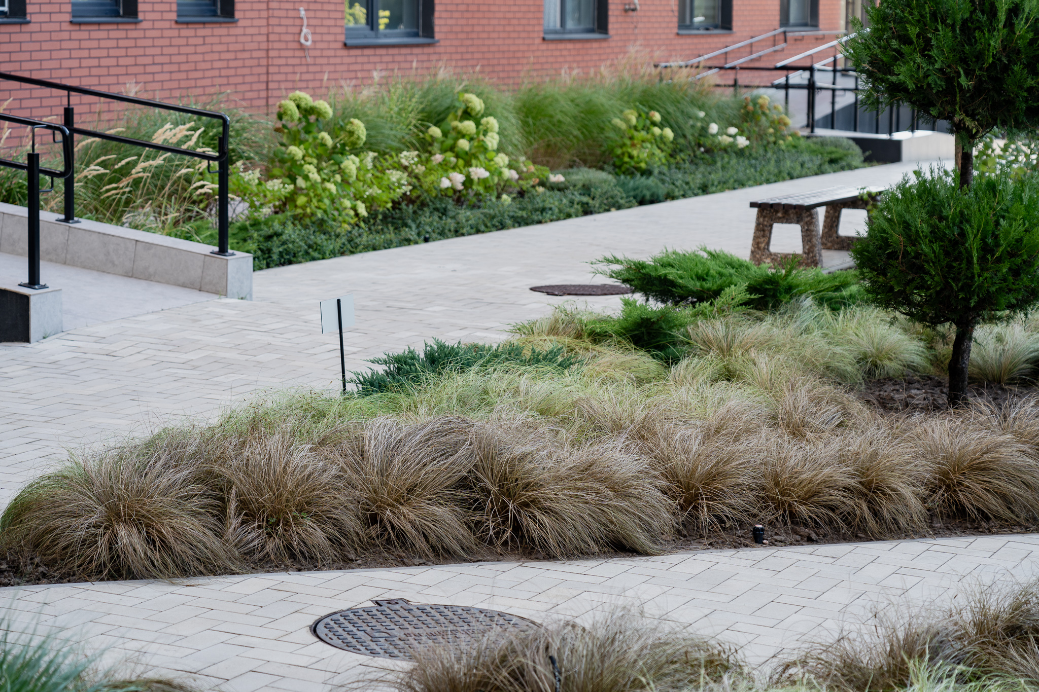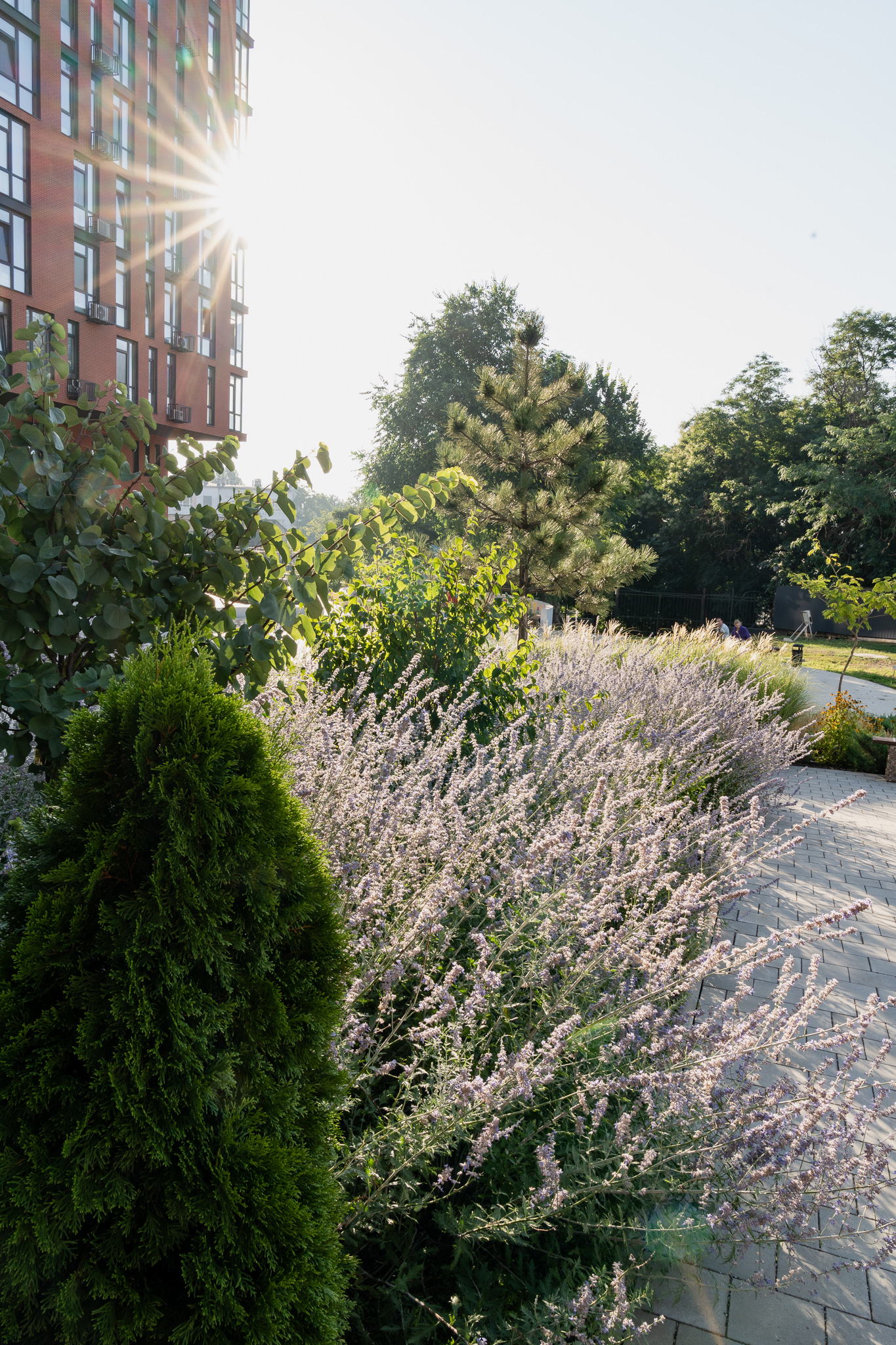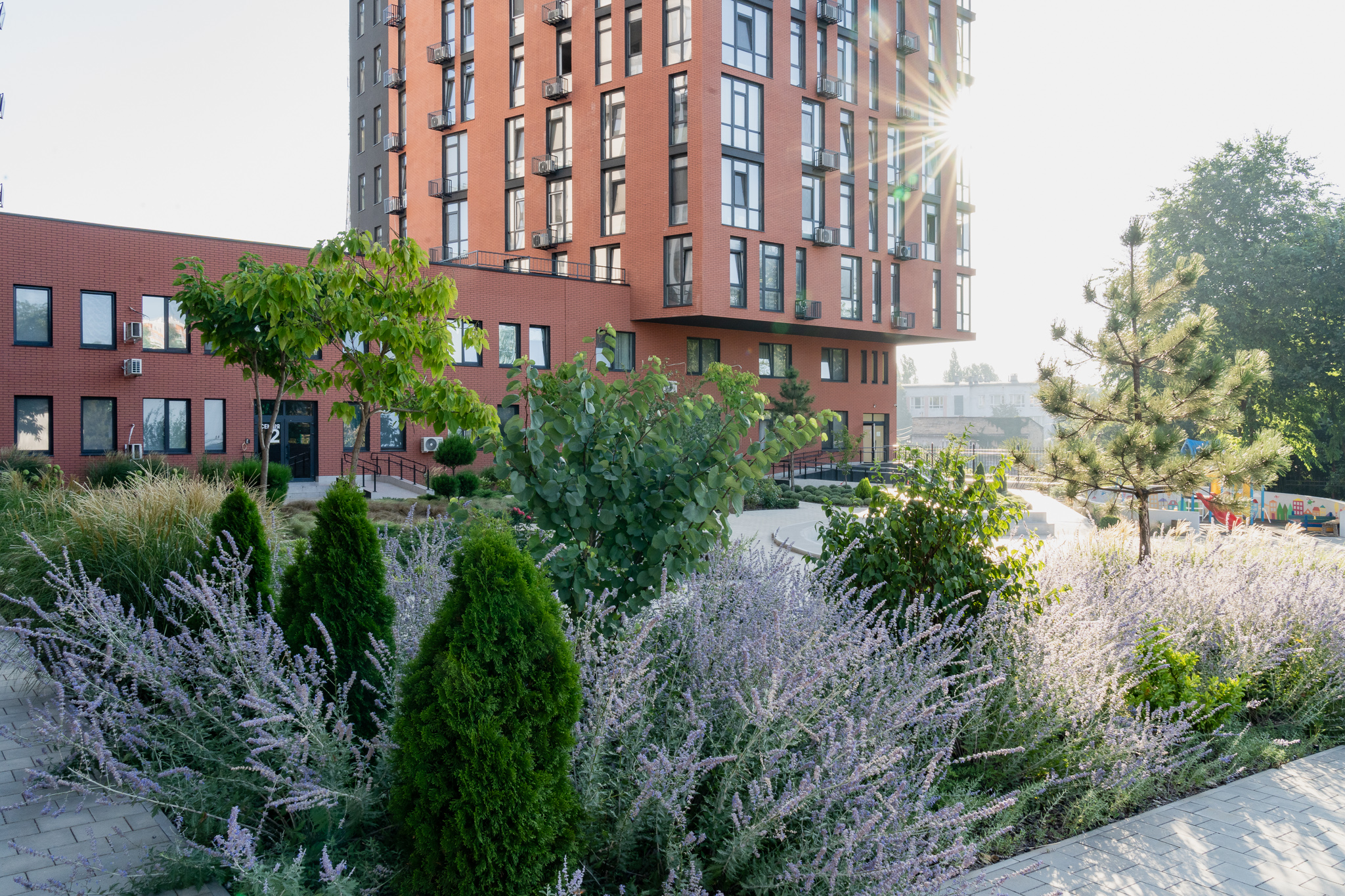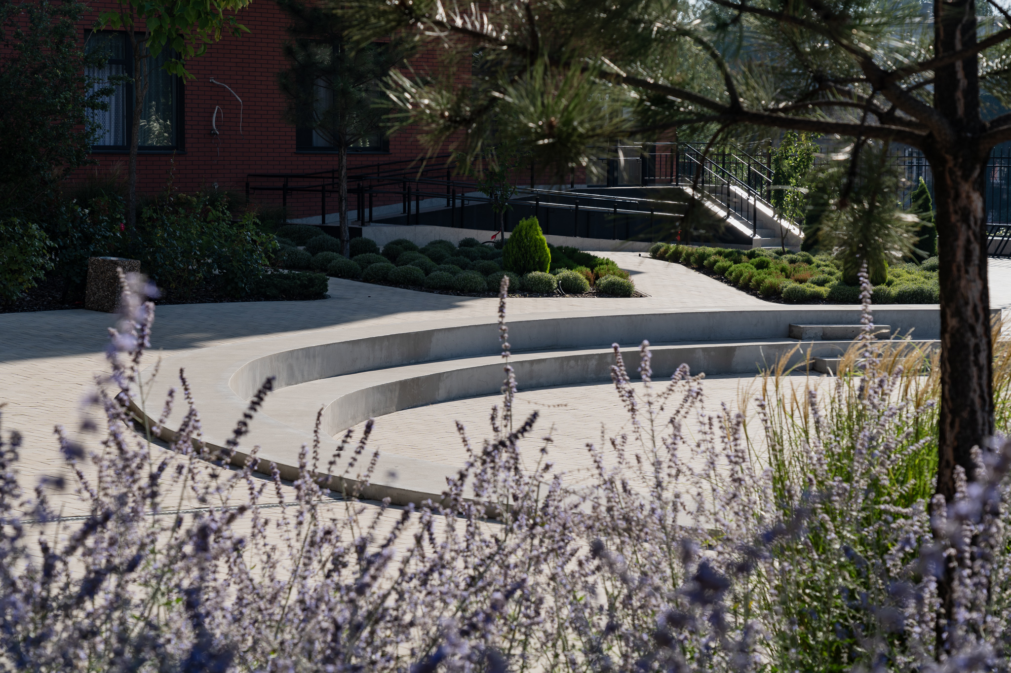 У клумбах, що примикають до будинку, висаджені масивами лаванда, санталіна та троянди, які квітнуть усе літо, створюючи великі яскраві плями та наповнюючи двір чудовим ароматом. Біля входу розташовані дві симетричні клумби з вічнозеленими стриженими формами та осоками, що радують мешканців цілий рік.