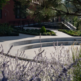 Відкритий просторий сад, велика територія якого розрахована на пасивний відпочинок, тому його спроєктували сучасним, малодоглядним та запланували і галявину для ігор, і ландшафтні композиції з різними групами чагарників та злакових, що висаджені дзеркально аби доповнити симметричне розташування клумб на плато.