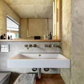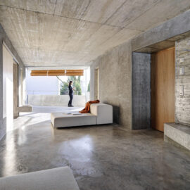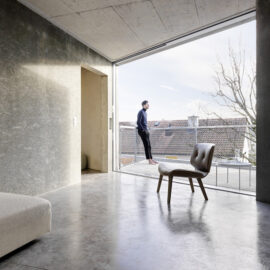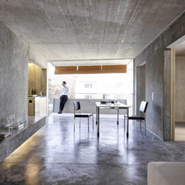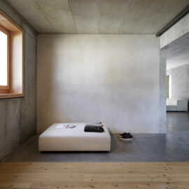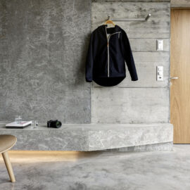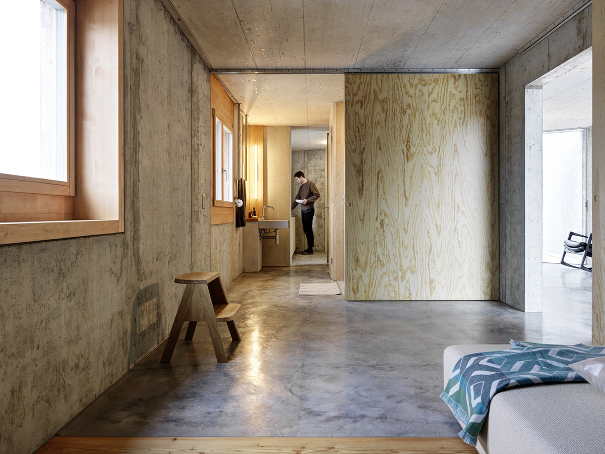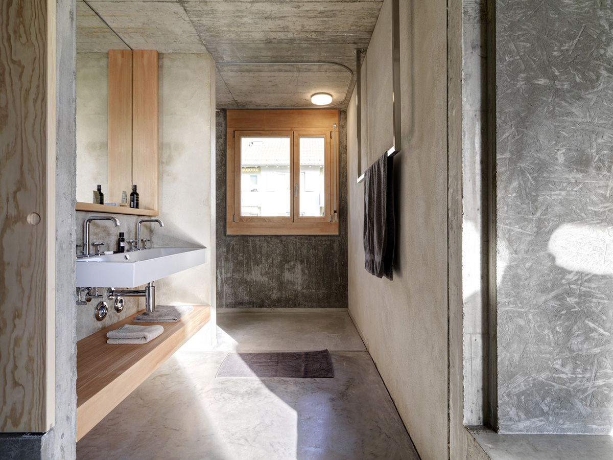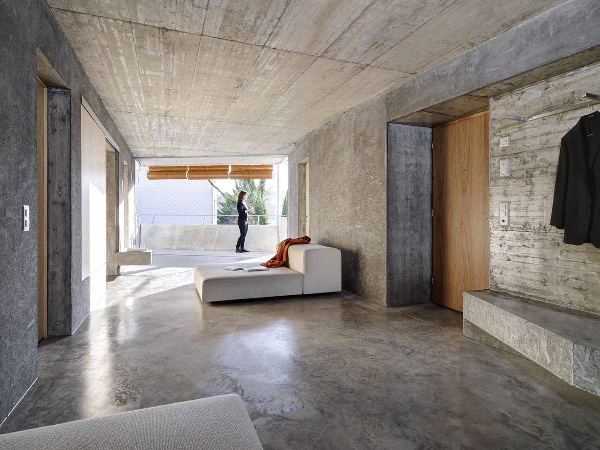 Вся электрическая проводка и сантехнические трубы встроены в стены, бытовая техника скрыта в нишах, а создание консолей и скамеек из архитектурного бетона, избавляет жильцов от необходимости загромождать комнаты мебелью. Фрагментарное использование деревянных покрытий в спальнях и деревянные жалюзи на окнах привносят в интерьер теплую ноту. Используя разные виды опалубки архитекторы поиграли с текстурами бетонных стен.
