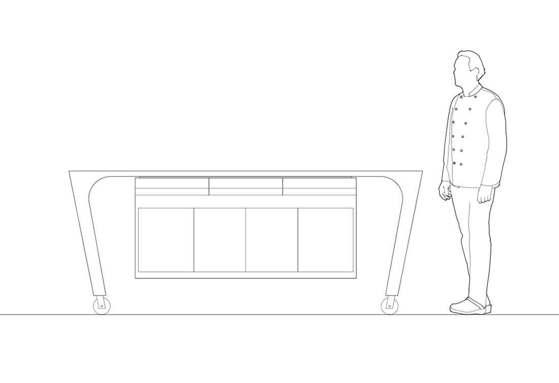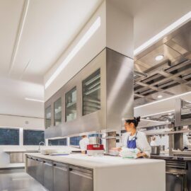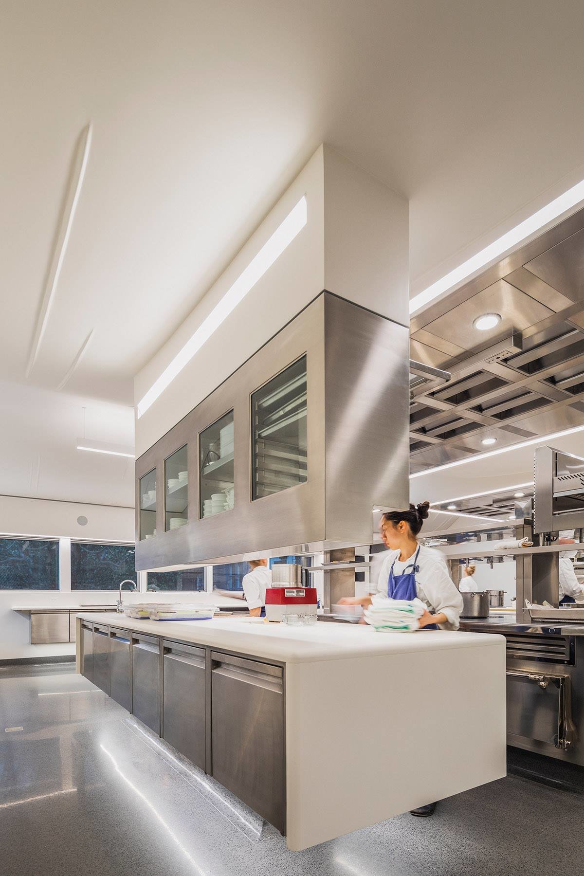 Интерьер кухни разработан в лучших традициях Snøhetta – эстетика и функциональность максимально сбалансированы. Изгибы белоснежного потолка, выполненного из армированного гипса и напоминающего мягко разворачиваемую через стол скатерть, разработаны с целью максимально снизить звуковые вибрации в пространстве и улучшить акустические качества открытой кухни. Ее так же укомплектовали сделанными на заказ рабочими столами и новой дровяной печью.