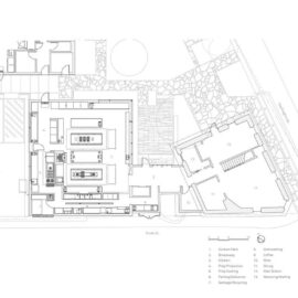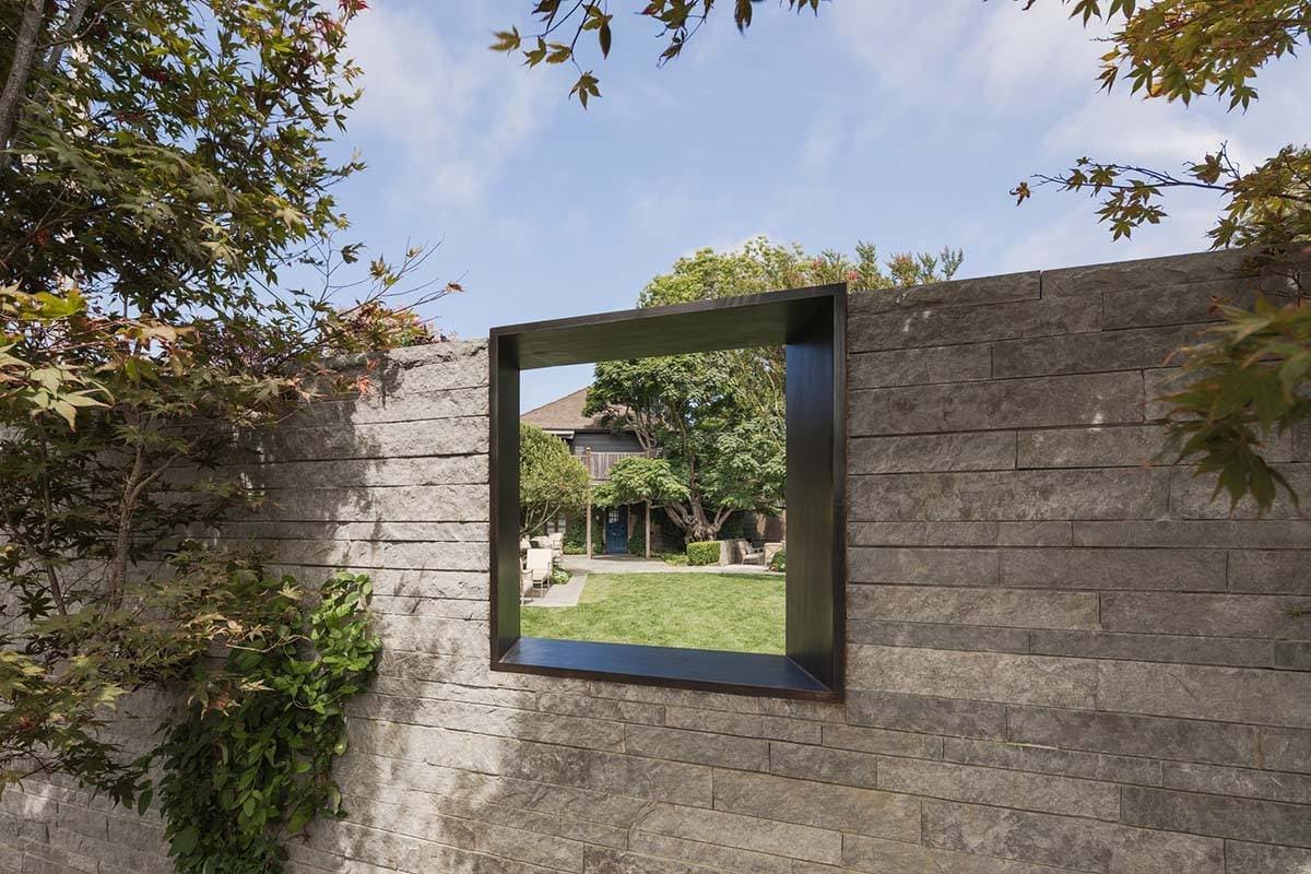 Архитекторы организовали высокое, отделанное базальтом, ограждение вокруг двора ресторана. Особенностью структуры являются 2 небольших проема, оформленных деревянными рамами. Сквозь них прохожим видны самые выгодные ракурсы оригинальной исторической постройки. Перепланировка коснулась и зеленого пространства – строение теперь окружают клумбы и рощица японских кленов. Широкие газоны, предусмотренные архитекторами, дают возможность проведения мероприятий на открытом воздухе.