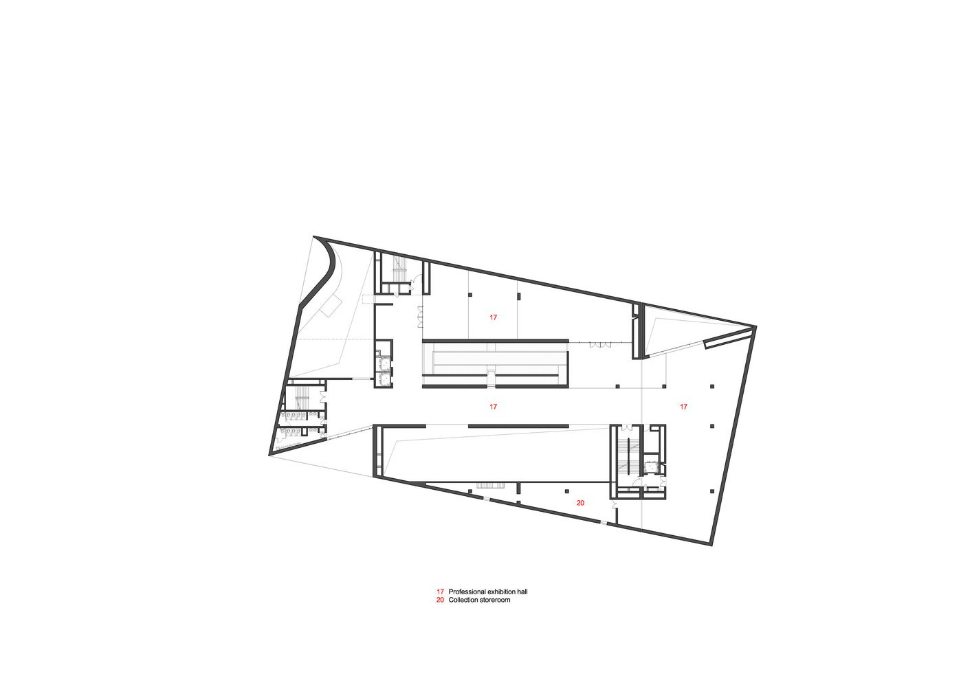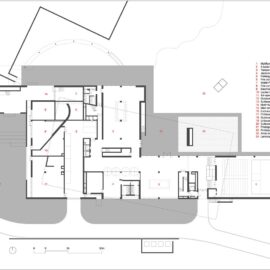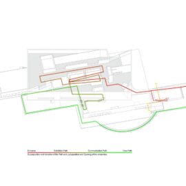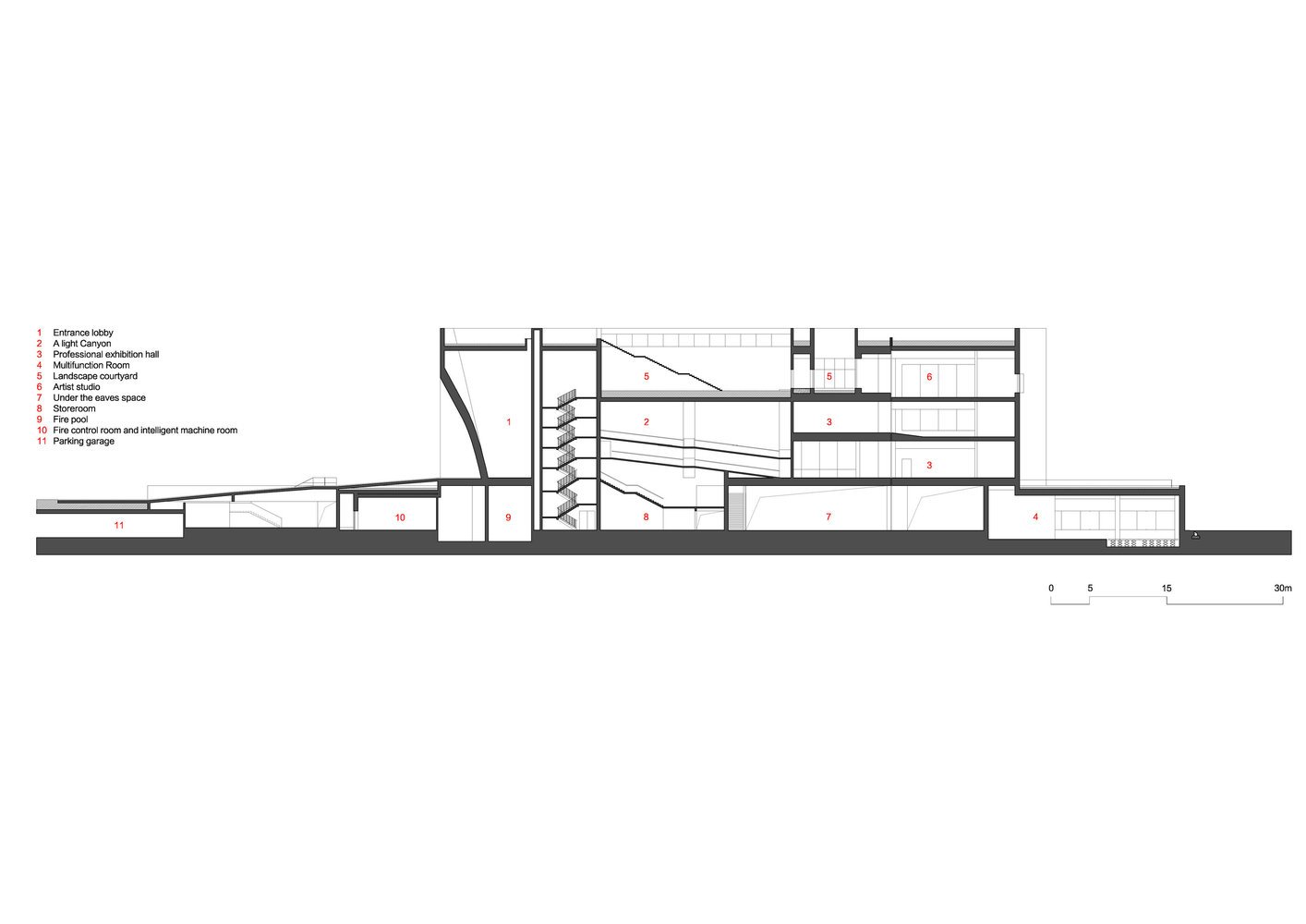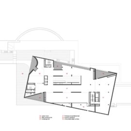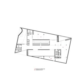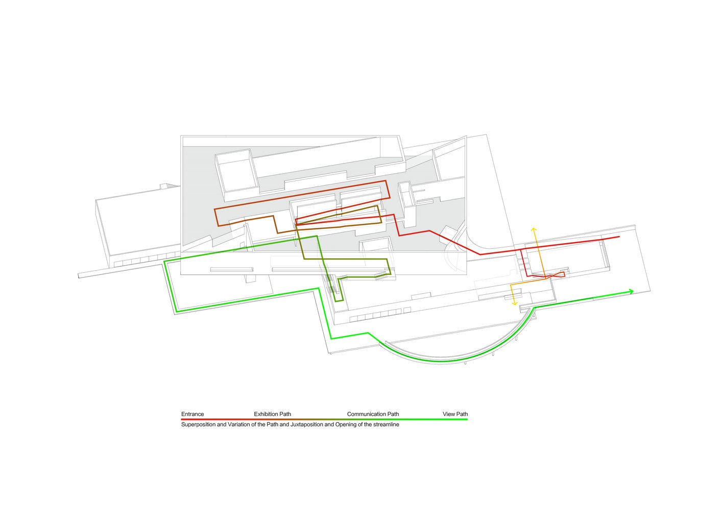 Структура здания – простые объемы параллелепипедов, установленных друг на друга с небольшим сдвигом. Эти уровни соединяет ряд лестниц и многочисленные внутренние и наружные пандусы, создающие эффект лабиринтов.