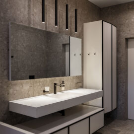 Основной задачей архитекторов было интегрировать все инженерные системы в интерьер без акцента на них. Так, во входной зоне расположили техническое помещение с подвалом для необходимого оборудования (системы очистки воды, отопления, кондиционирования и вентиляции). Также при входе предусмотрели компактный гостевой санузел.