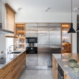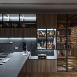 Просторная гостиная, совмещенная со столовой и кухней, имеет отдельный скрытый вход в рабочий кабинет. Рядом с кухней находится вместительная кладовая для продуктов.
