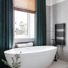 Отделка по всему дому выполнена из натуральных материалов. В целом для интерьера выбрана мягкая палитра, разбавляют ее глубокие оттенки в текстиле — обивке мебели и гардинах на окнах.