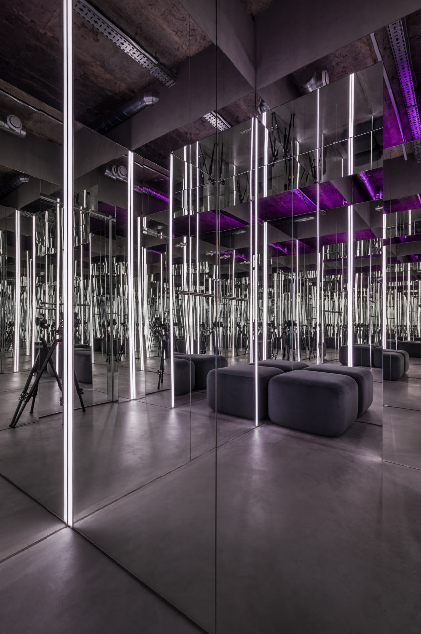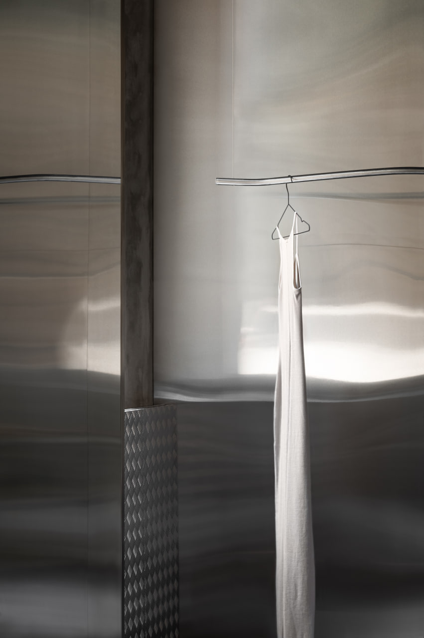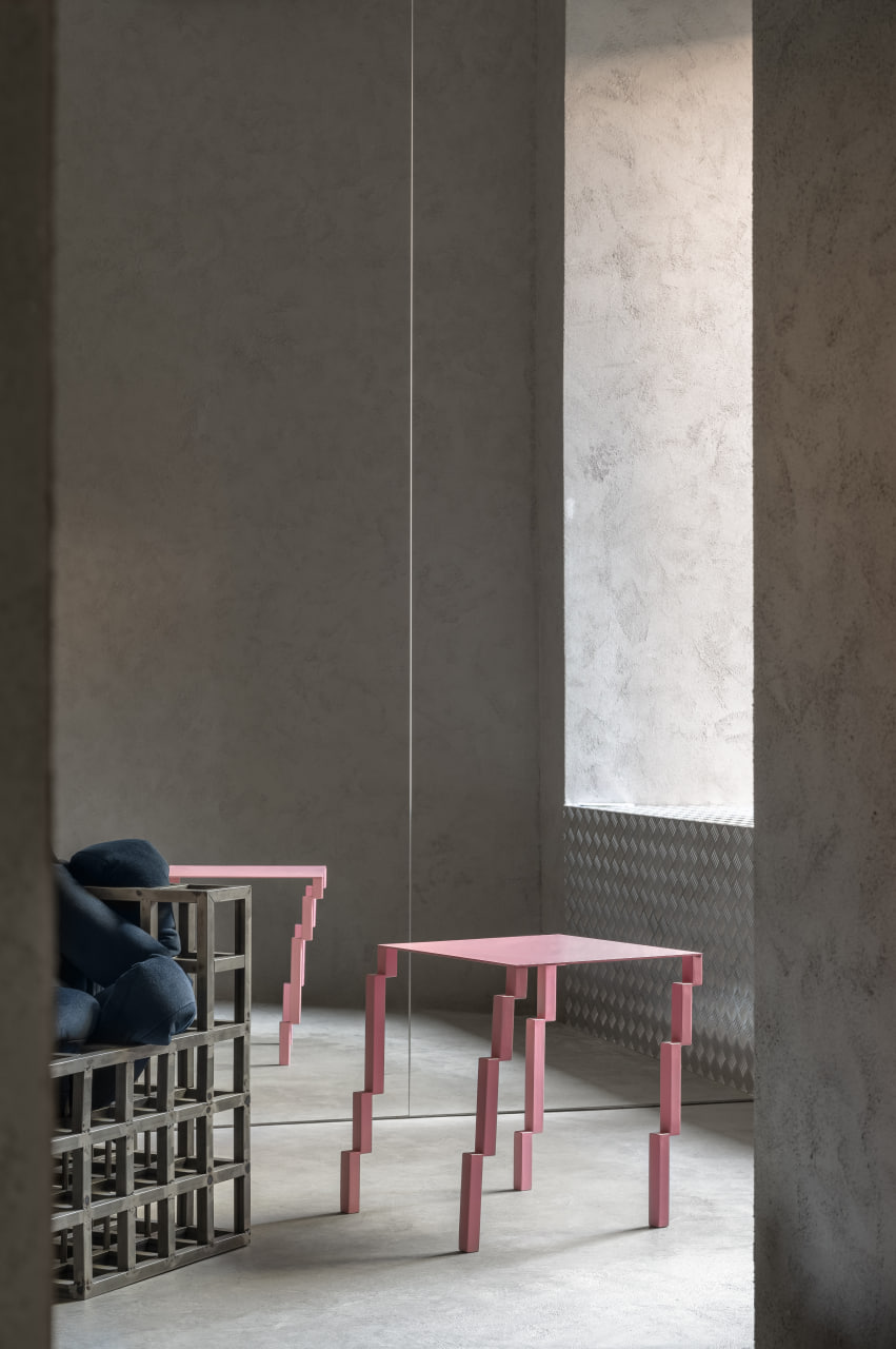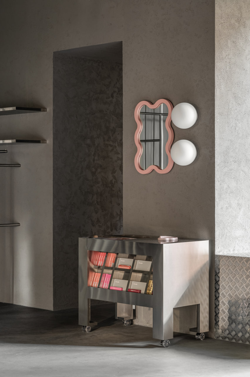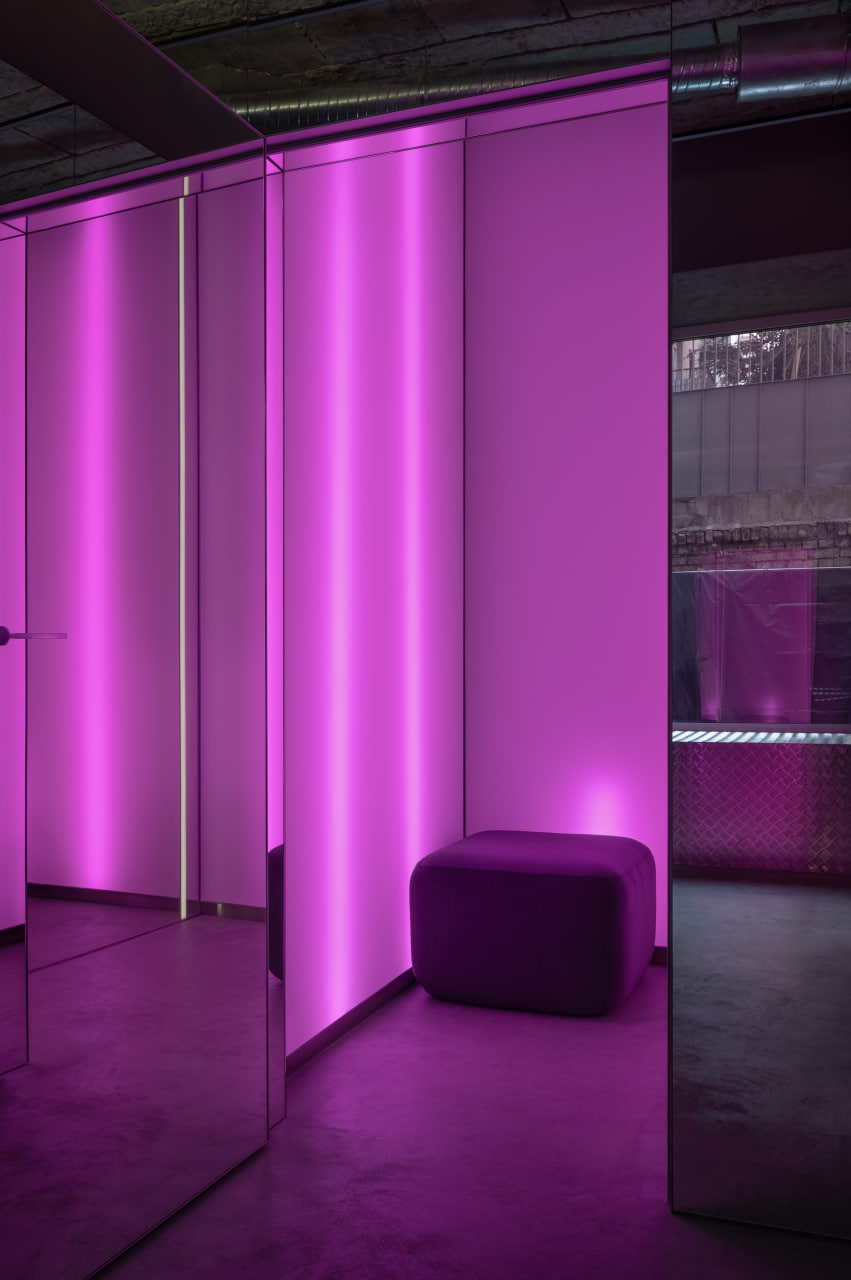 Зона примірочних розташована в глибині простору — це умовна третя зала. Примірочні кабінки мають дзеркальні стіни, які створюють ефект лабіринту та дозволяють роздивитися себе з усіх боків. Важкі двері, що імітують сейф, ведуть до зони зберігання. Злегка асиметрична форма рожевого столика Bug від Oito, ніби пливе в повітрі, додаючи відчуття легкого головокружіння, яке створюють дзеркала.