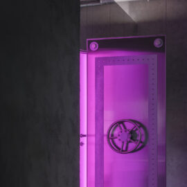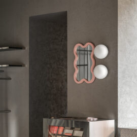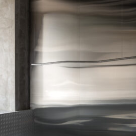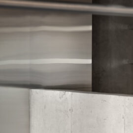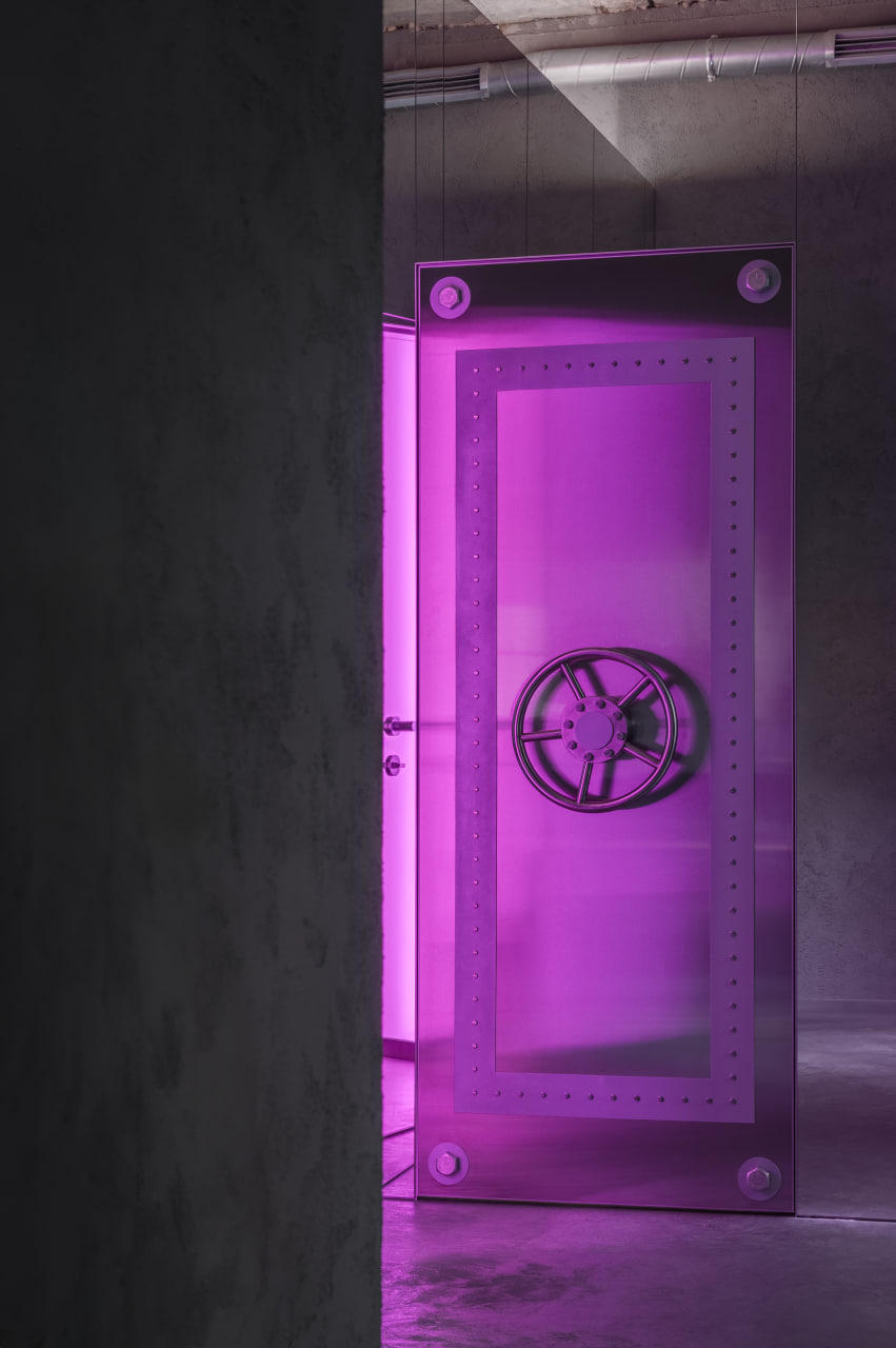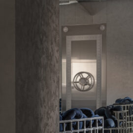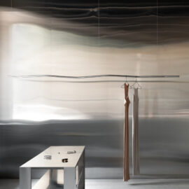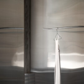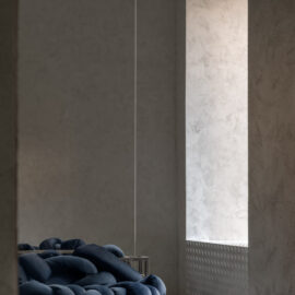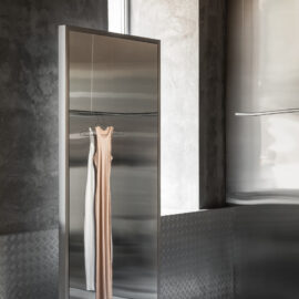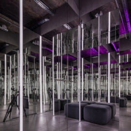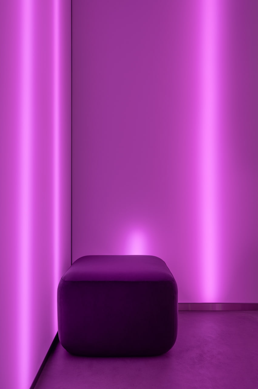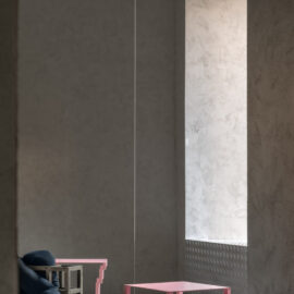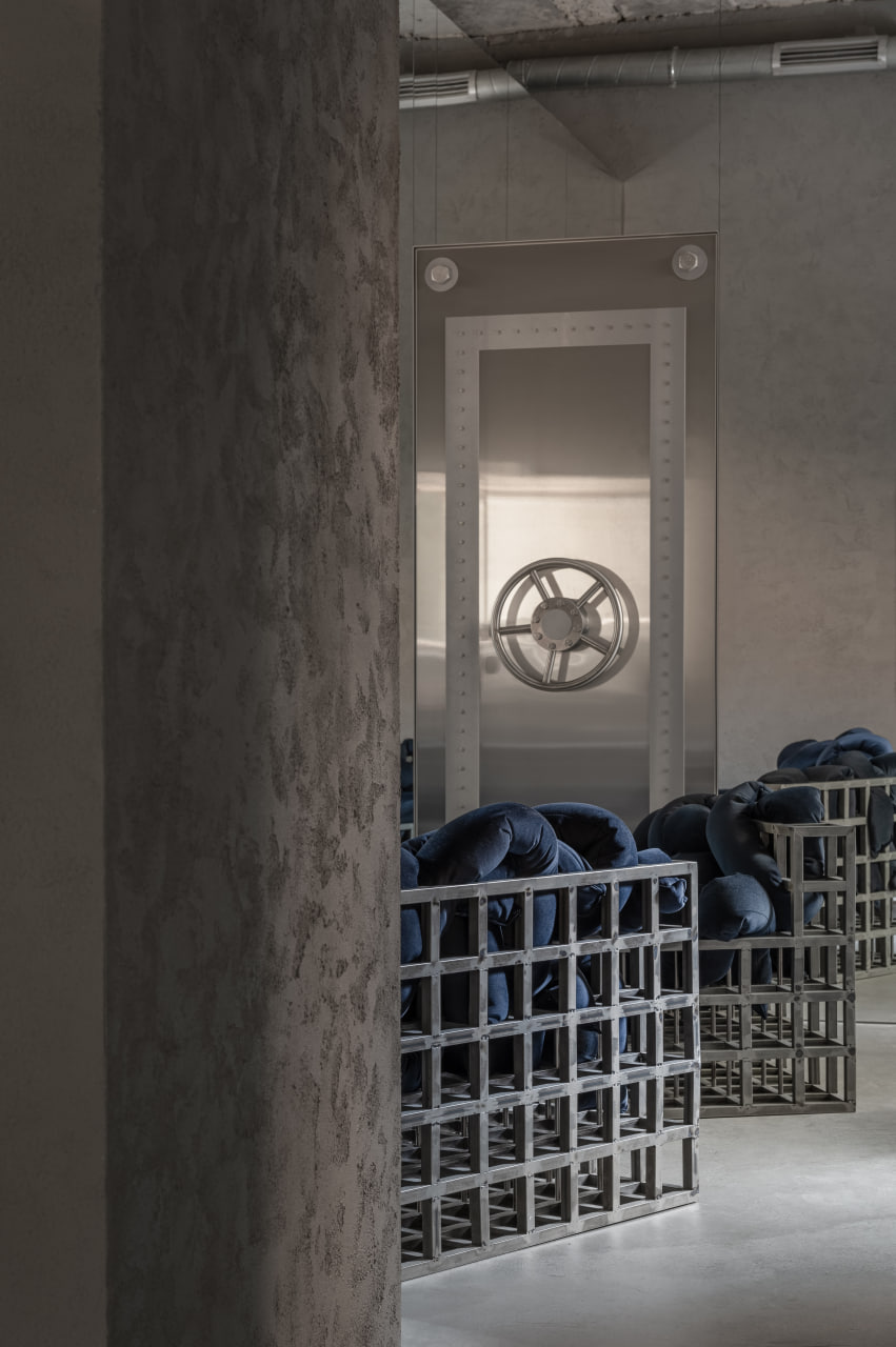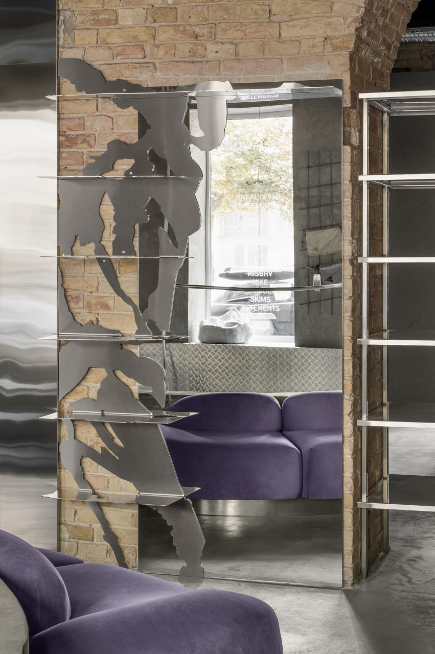 Зона примірочних розташована в глибині простору — це умовна третя зала. Примірочні кабінки мають дзеркальні стіни, які створюють ефект лабіринту та дозволяють роздивитися себе з усіх боків. Важкі двері, що імітують сейф, ведуть до зони зберігання. Злегка асиметрична форма рожевого столика Bug від Oito, ніби пливе в повітрі, додаючи відчуття легкого головокружіння, яке створюють дзеркала.