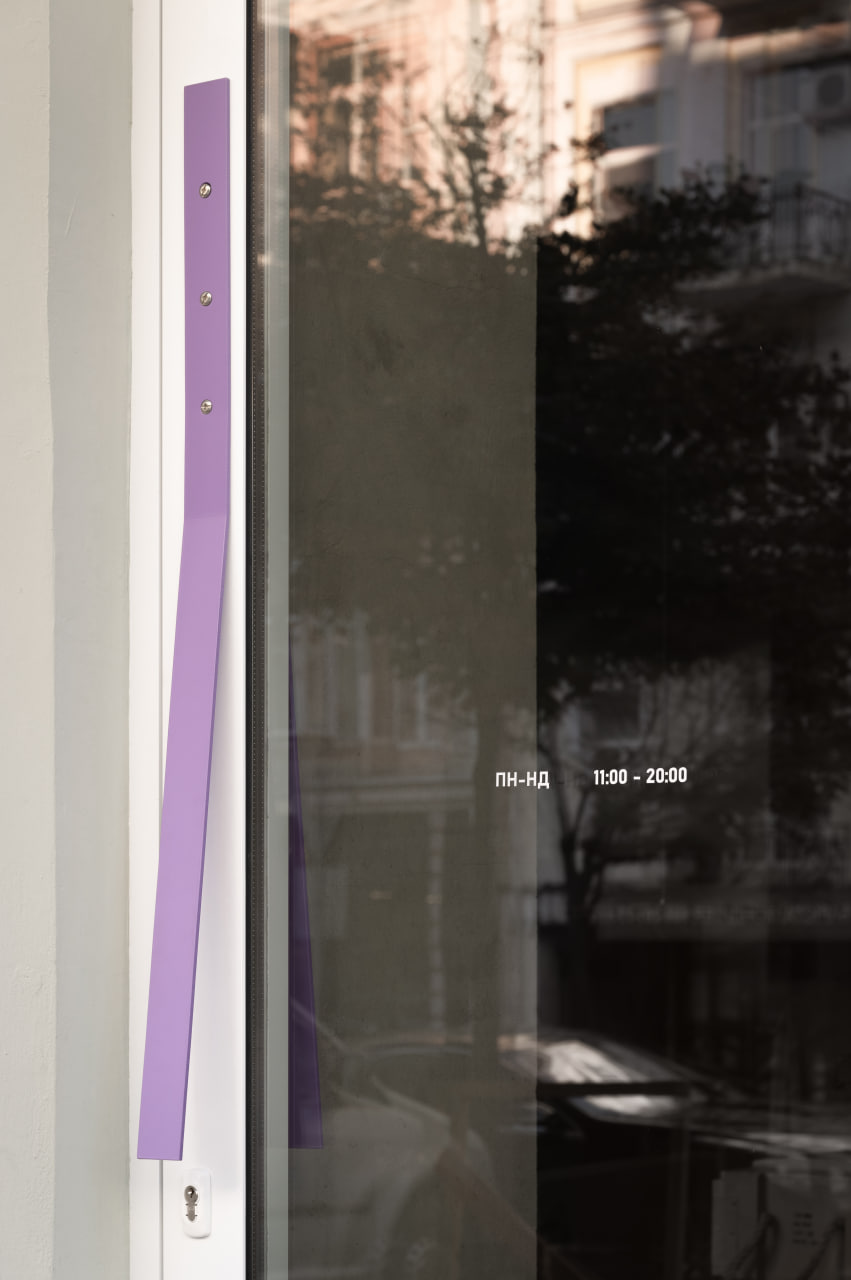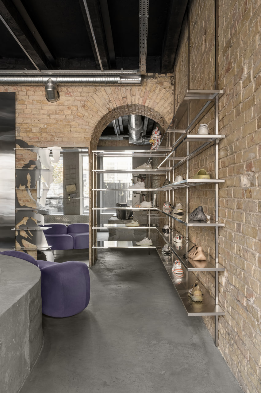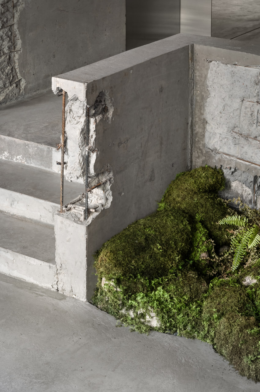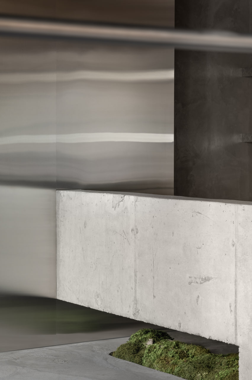 Основні матеріали проєкту: бетон, стара цегла, нержавіюча та рифлена сталь. Кольори: сірий, чорний, бузковий. Салатово-лимонний акцент створюють острівці живої рослинності — мох і папороть, які комфортно почуваються та ростуть в умовах обмеженого природного світла.