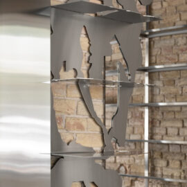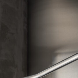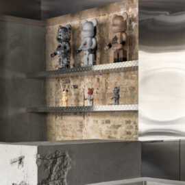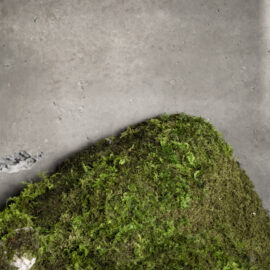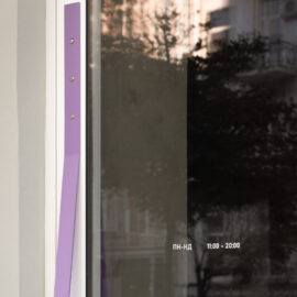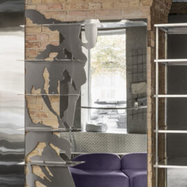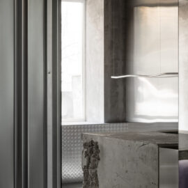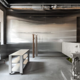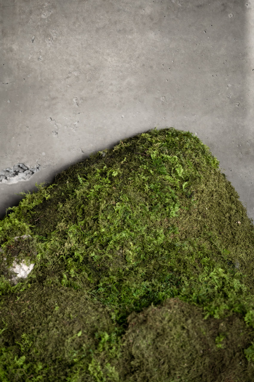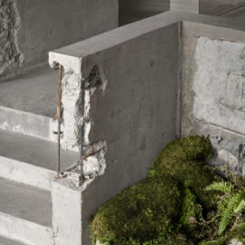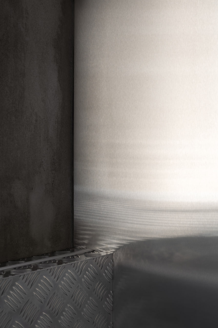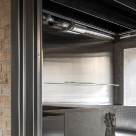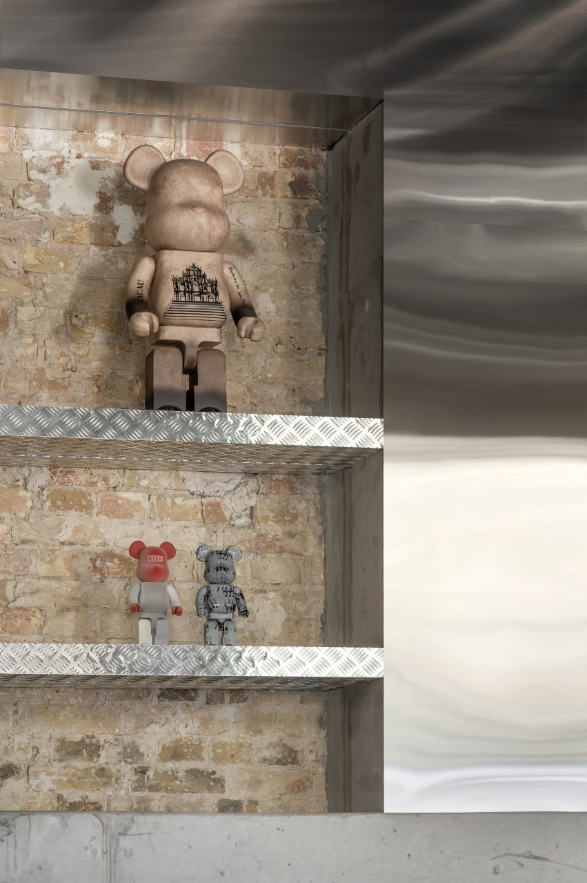 Основні матеріали проєкту: бетон, стара цегла, нержавіюча та рифлена сталь. Кольори: сірий, чорний, бузковий. Салатово-лимонний акцент створюють острівці живої рослинності — мох і папороть, які комфортно почуваються та ростуть в умовах обмеженого природного світла.