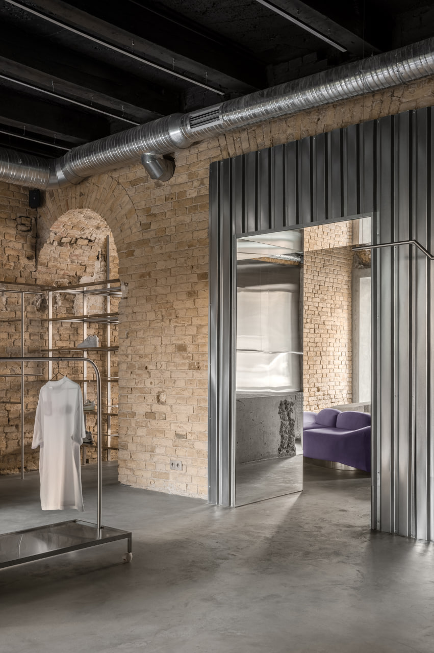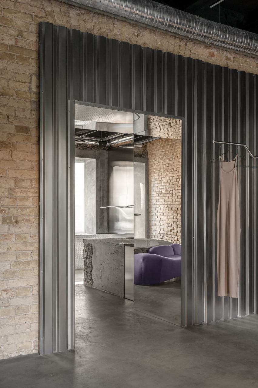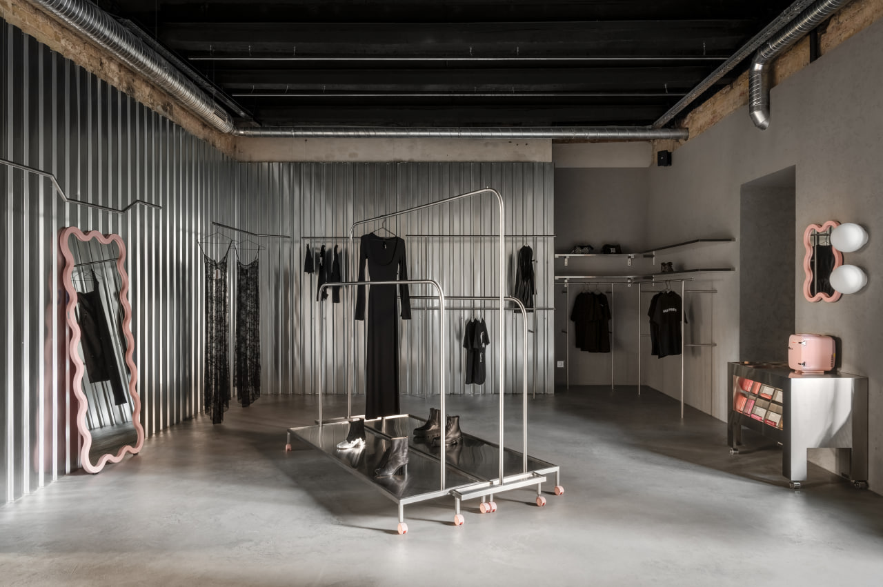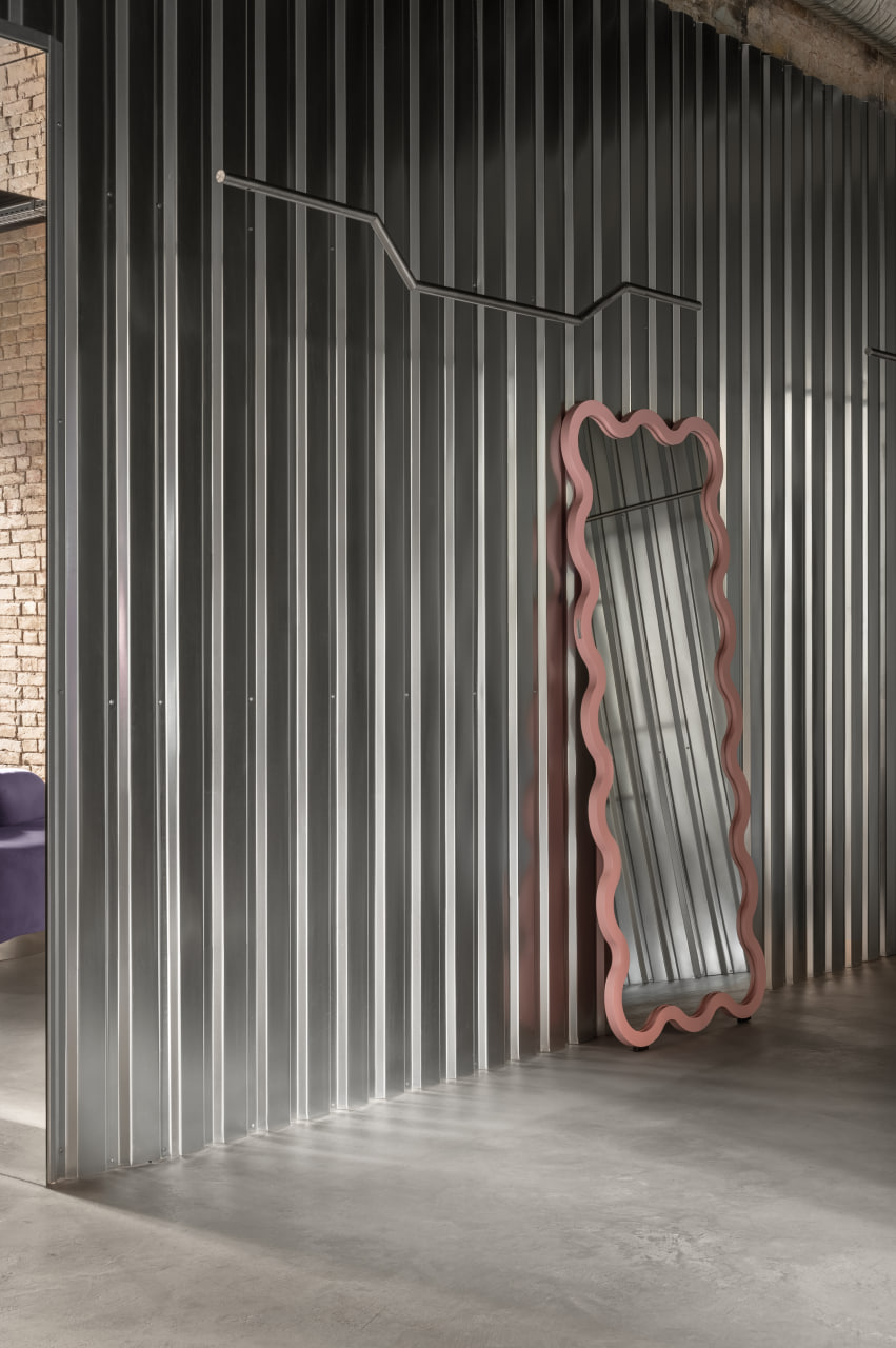 Друга зала, де розміщений шоурум жіночого одягу Domaine 17, має кілька заокруглених і кольорових акцентів: хвилясті рамки дзеркал від українського бренду Oito та рожеві коліщатка пересувних підлогових релінгів. Стіни з рифленої сталі нагадують антураж промислових цехів.