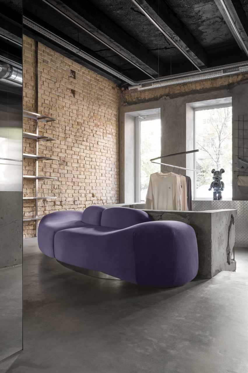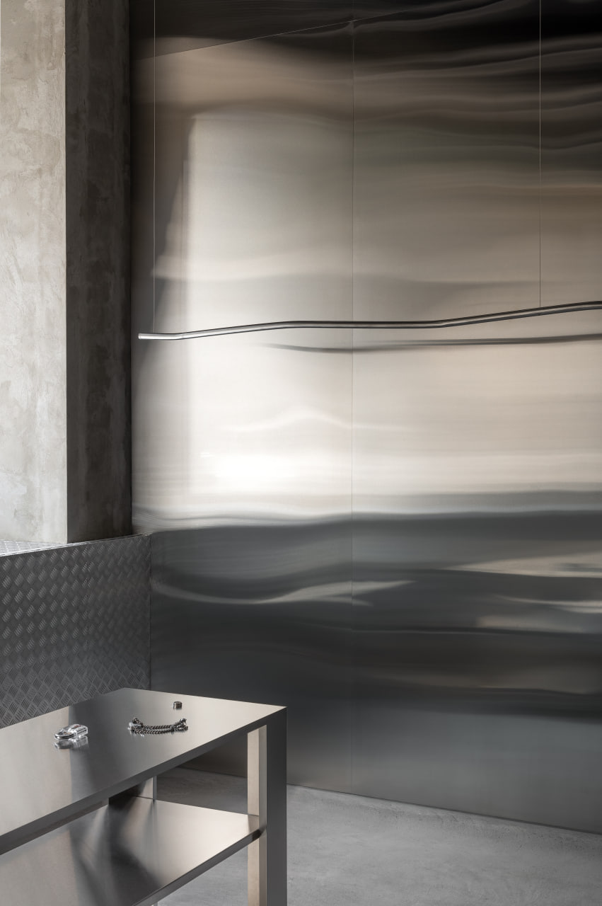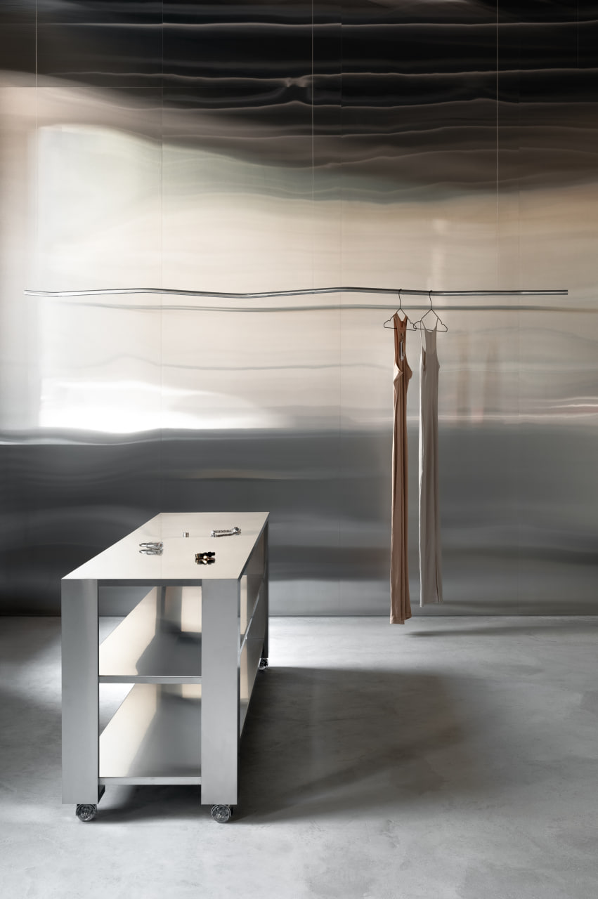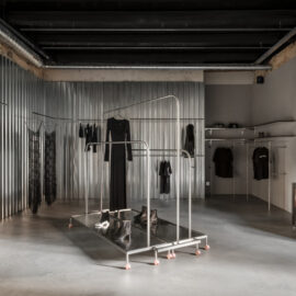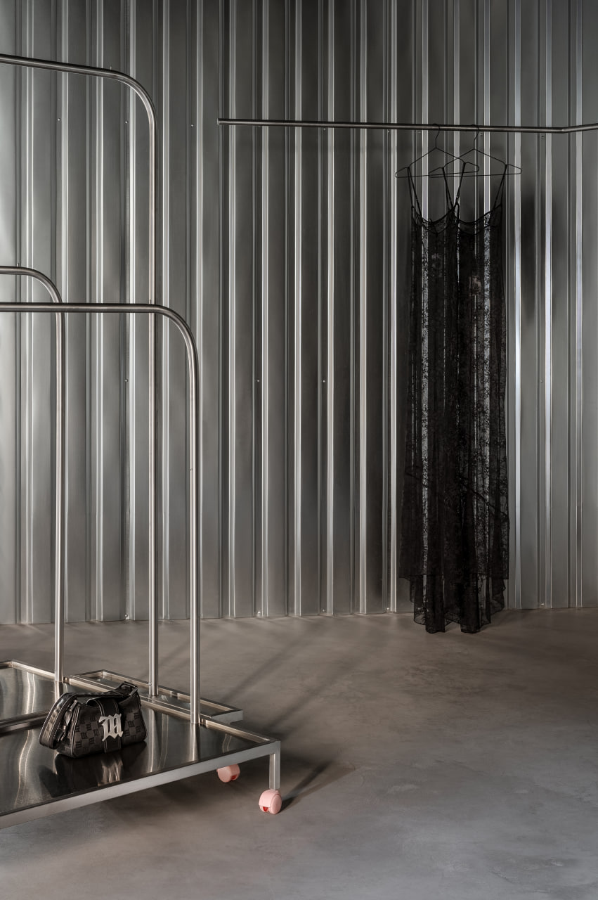 Друга зала, де розміщений шоурум жіночого одягу Domaine 17, має кілька заокруглених і кольорових акцентів: хвилясті рамки дзеркал від українського бренду Oito та рожеві коліщатка пересувних підлогових релінгів. Стіни з рифленої сталі нагадують антураж промислових цехів.