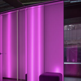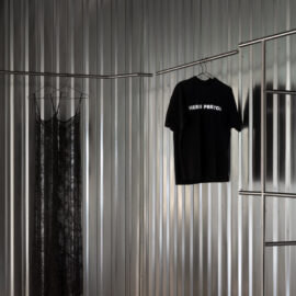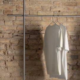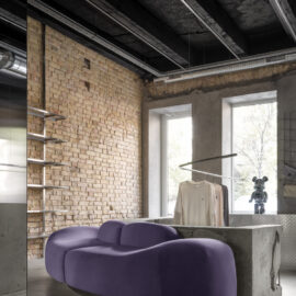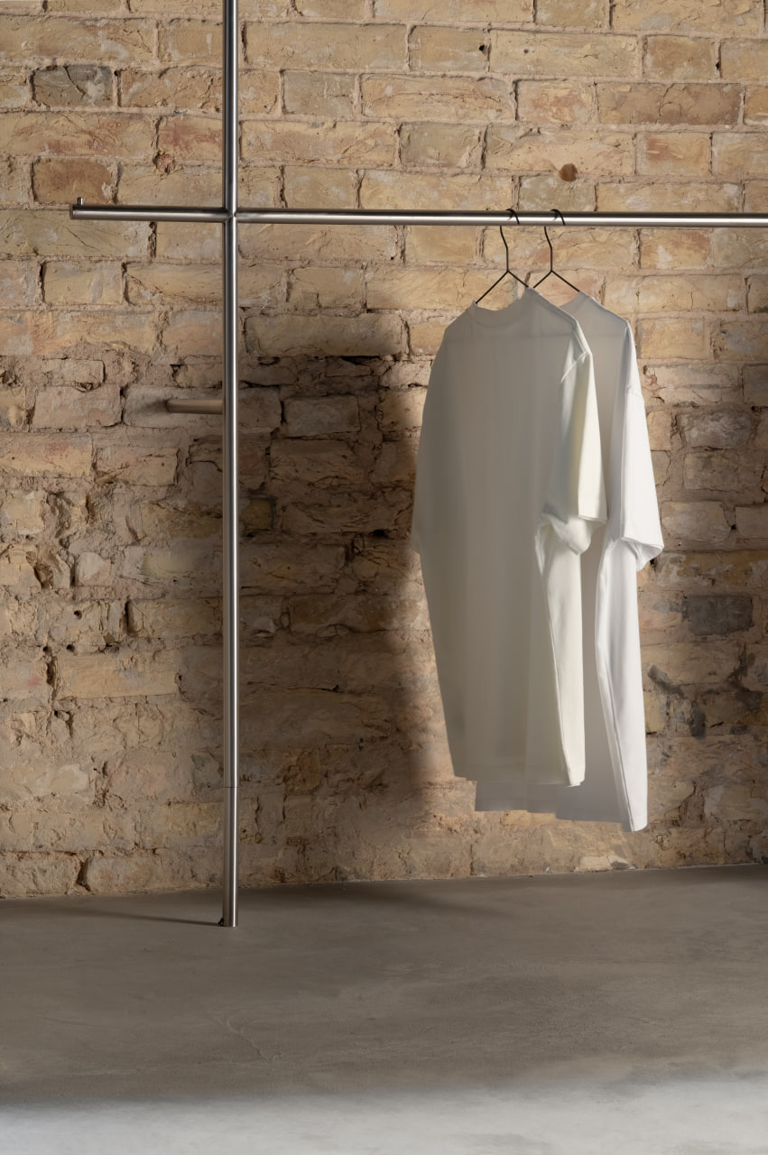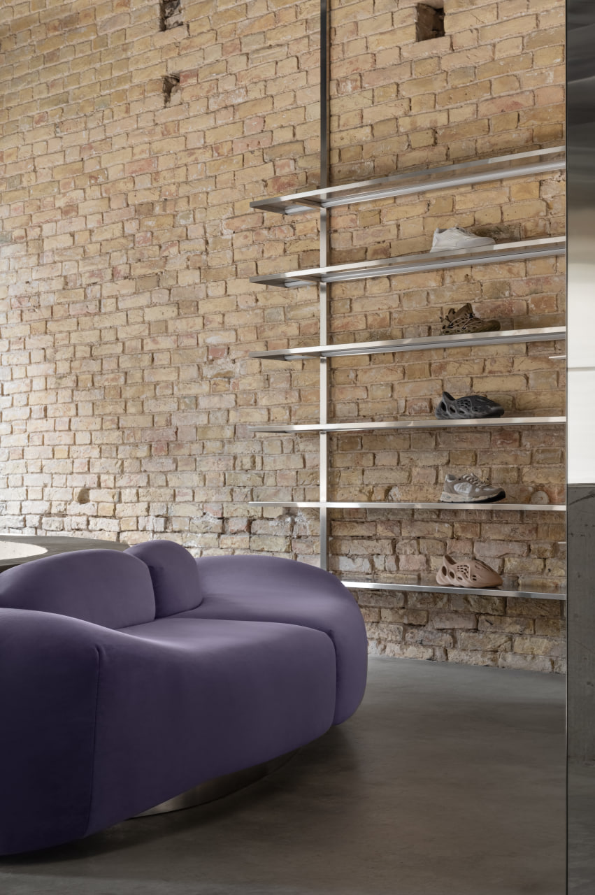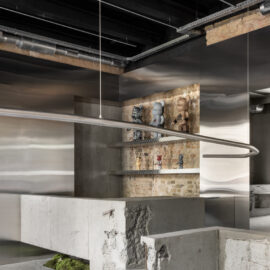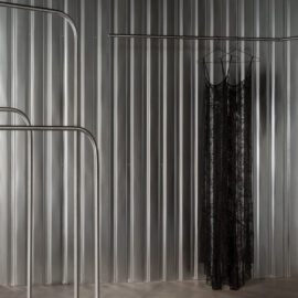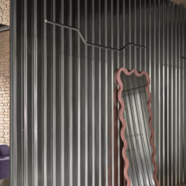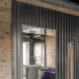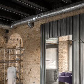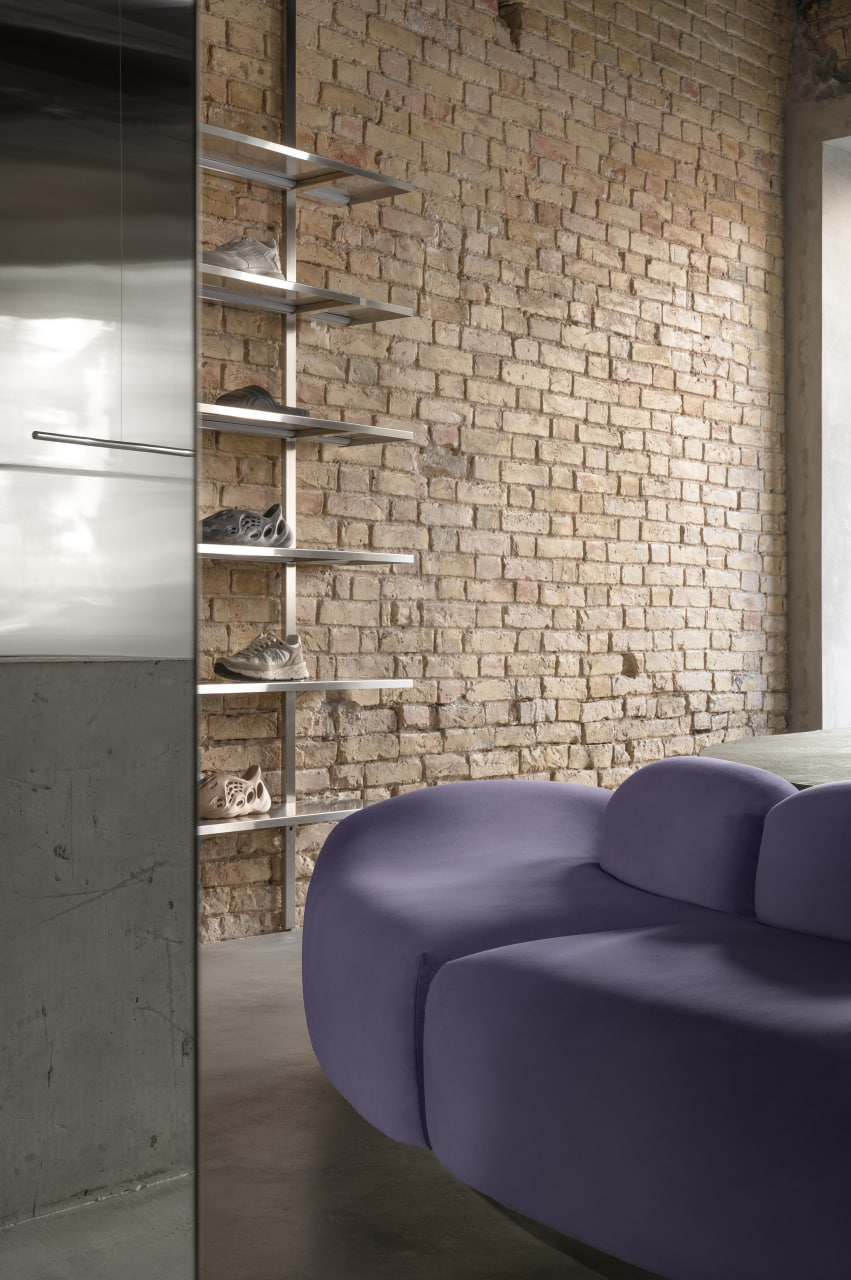 Друга зала, де розміщений шоурум жіночого одягу Domaine 17, має кілька заокруглених і кольорових акцентів: хвилясті рамки дзеркал від українського бренду Oito та рожеві коліщатка пересувних підлогових релінгів. Стіни з рифленої сталі нагадують антураж промислових цехів.