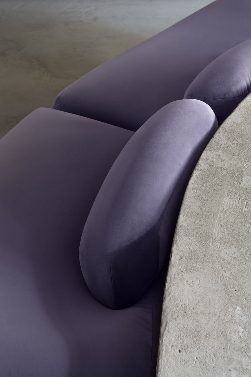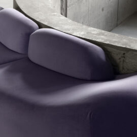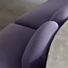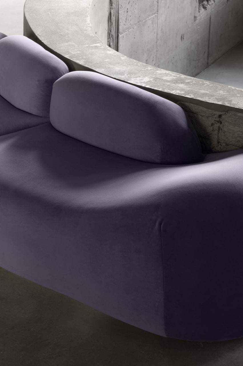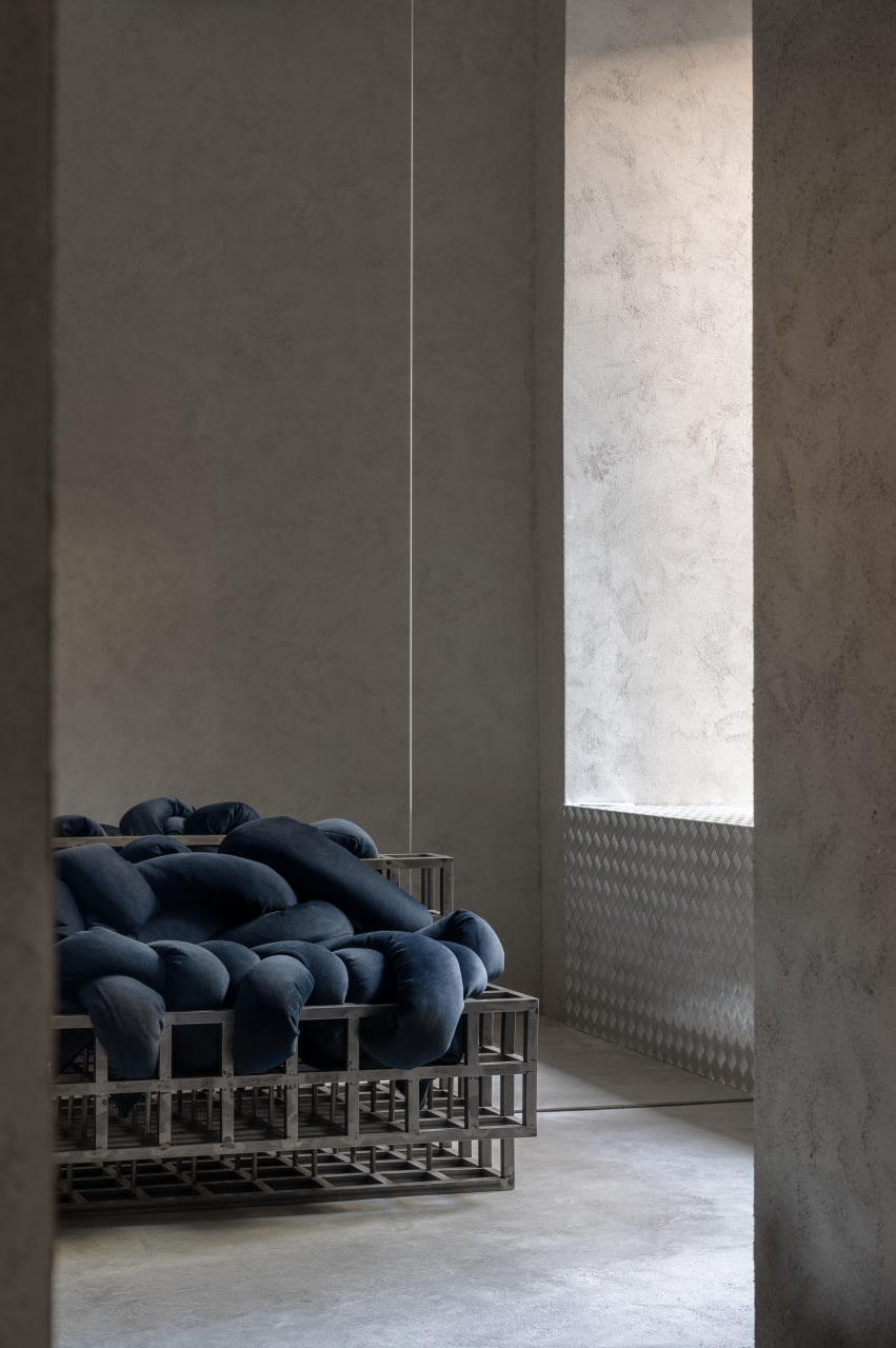 Темно-сині крісла з довгастими циліндричними джгутами, вплетеними в металевий каркас, а також великий заокруглений диван у першій залі натхненні трендом моушн-дизайну — коли реалістичні об’єкти візуально розтягуються або стискаються, наче долаючи фізичні закони.