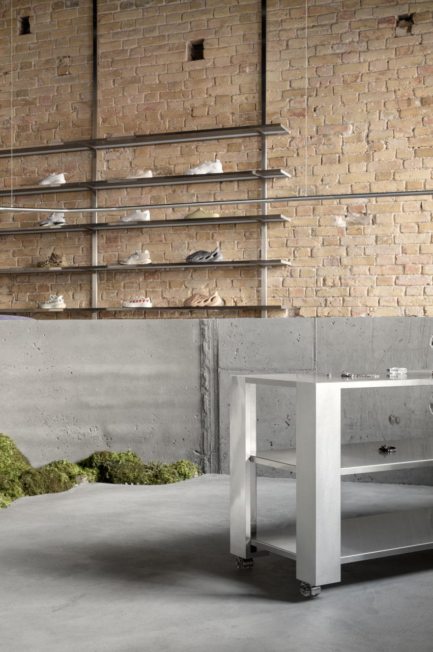 Чоловічий магазин Storage займає перший зал. Раніше в цьому приміщенні був салон краси. Складна рівневість підлоги з радіальними елементами залишилася від нього. Її обіграли та функціонально доповнили, відливши бетонну стійку рецепції — своєрідну відсилку до естетики скейт-парку.