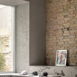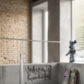 Від оригінальної архітектури старого будинку залишили арочні дверні отвори, дерев’яні балки перекриття під стелею та цегляні стіни. «Ми відмовилися від ідеї почистити оригінальну цегляну кладку стін, адже вона виглядала б надто охайною. А нам була потрібна брутальна й чесна естетика, тому цеглу просто залишили як є», – ділиться Анастасія.