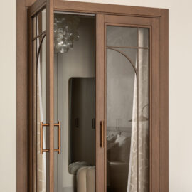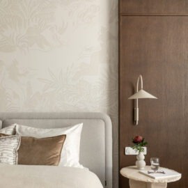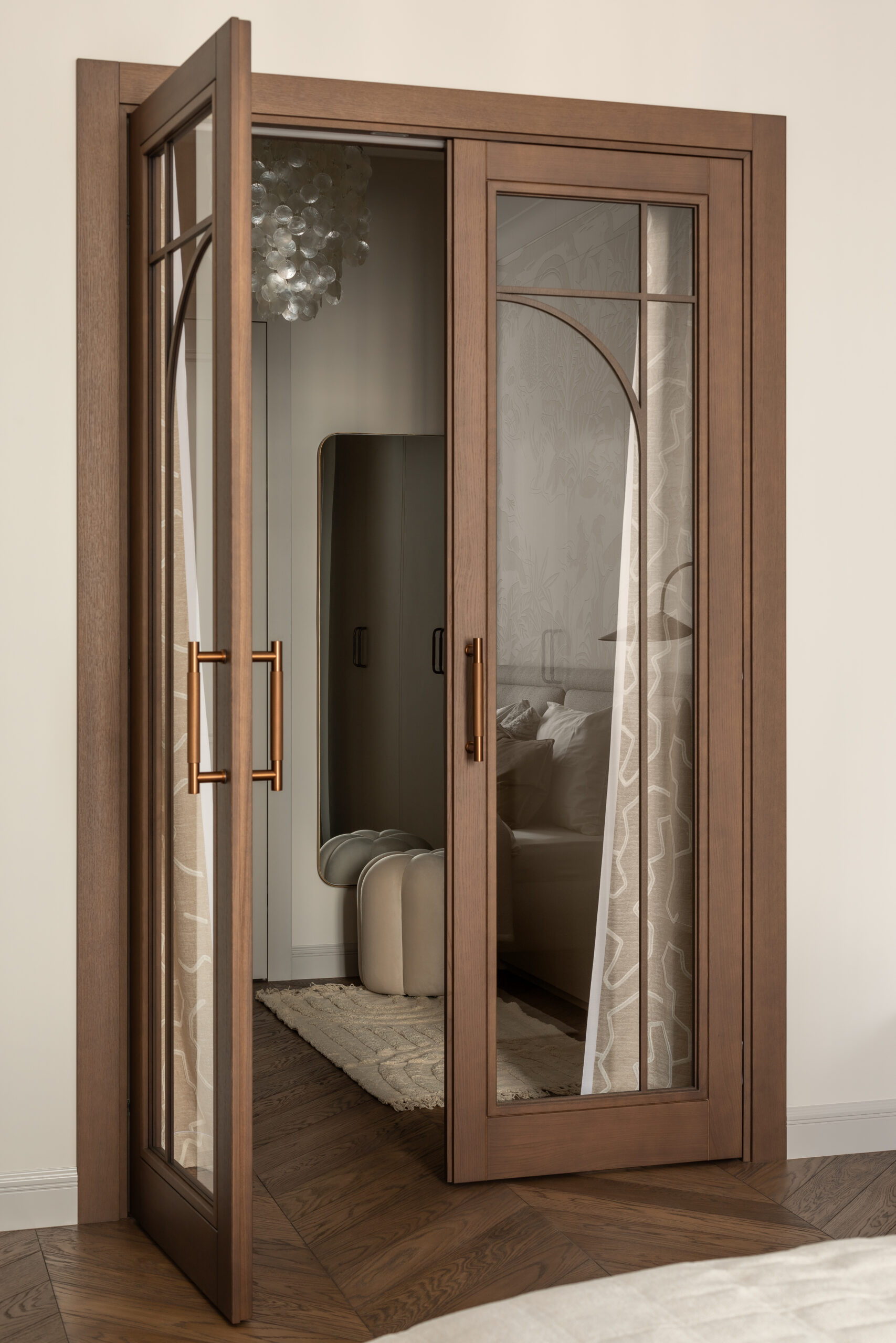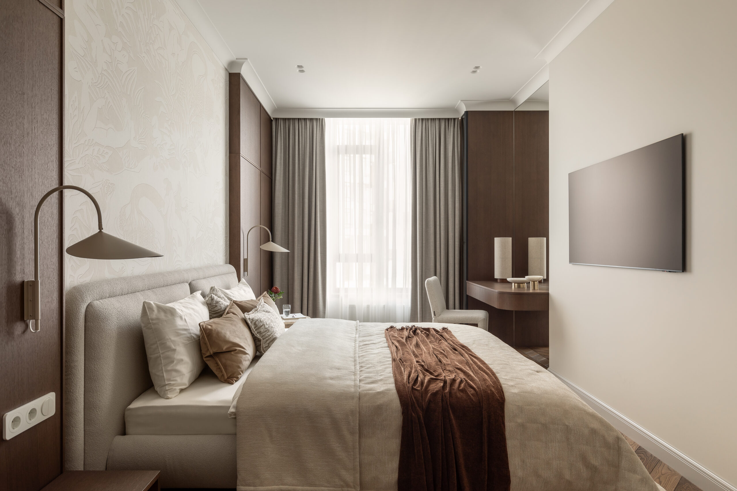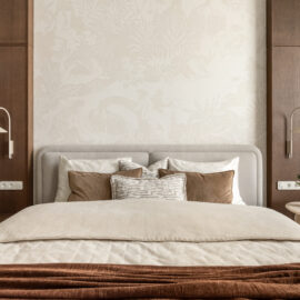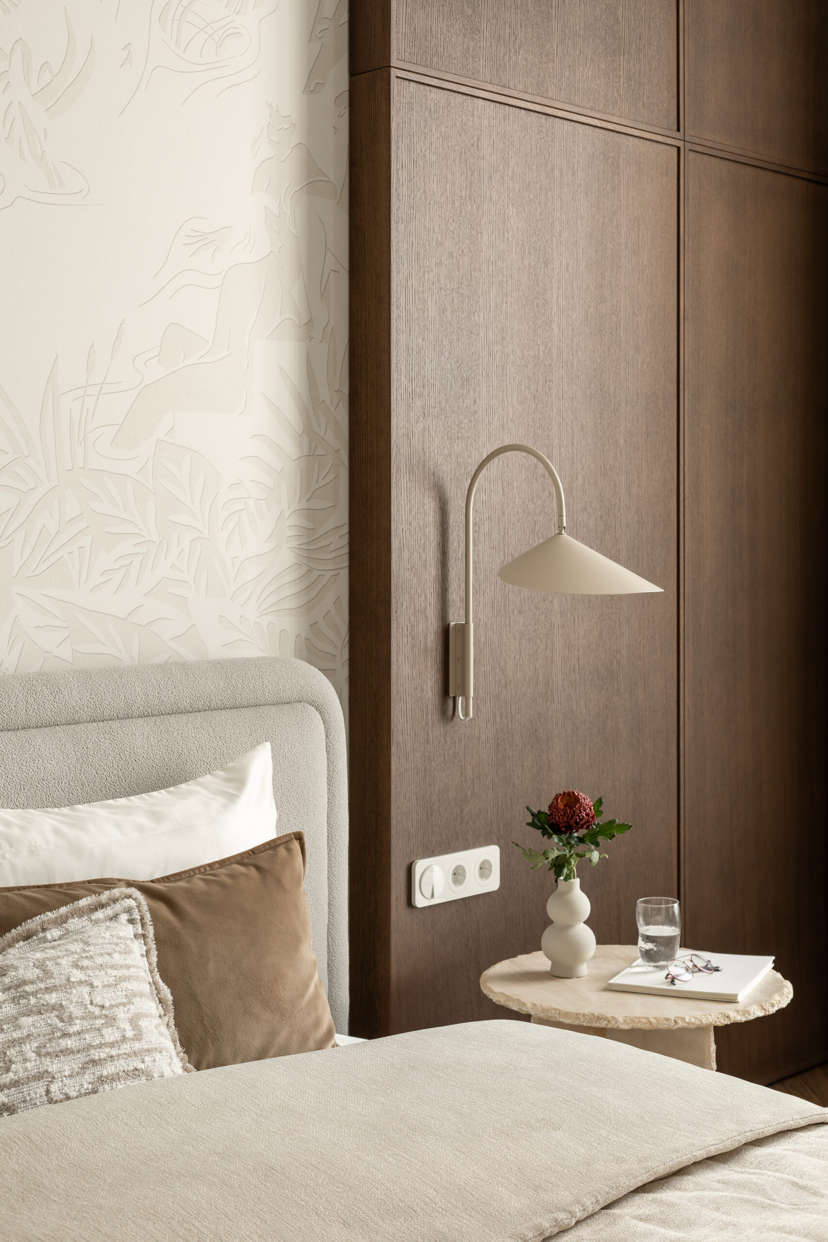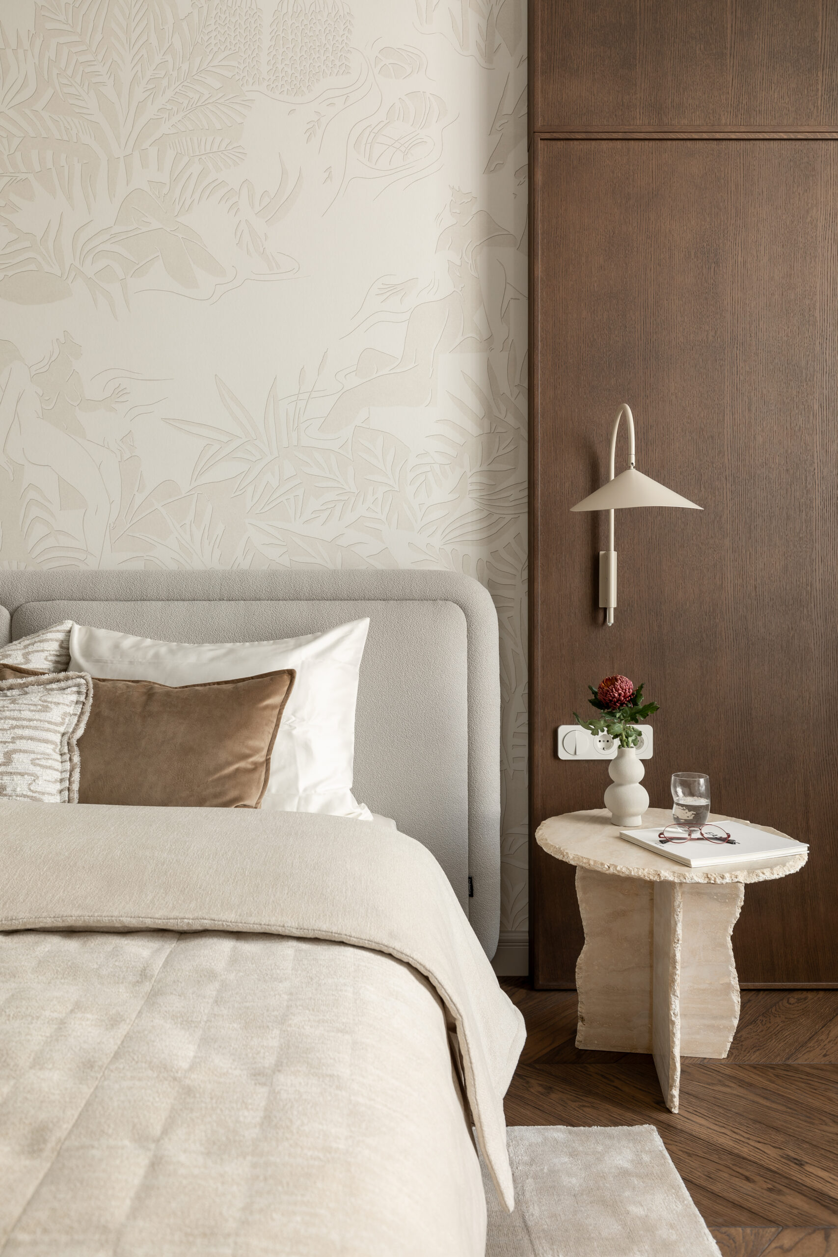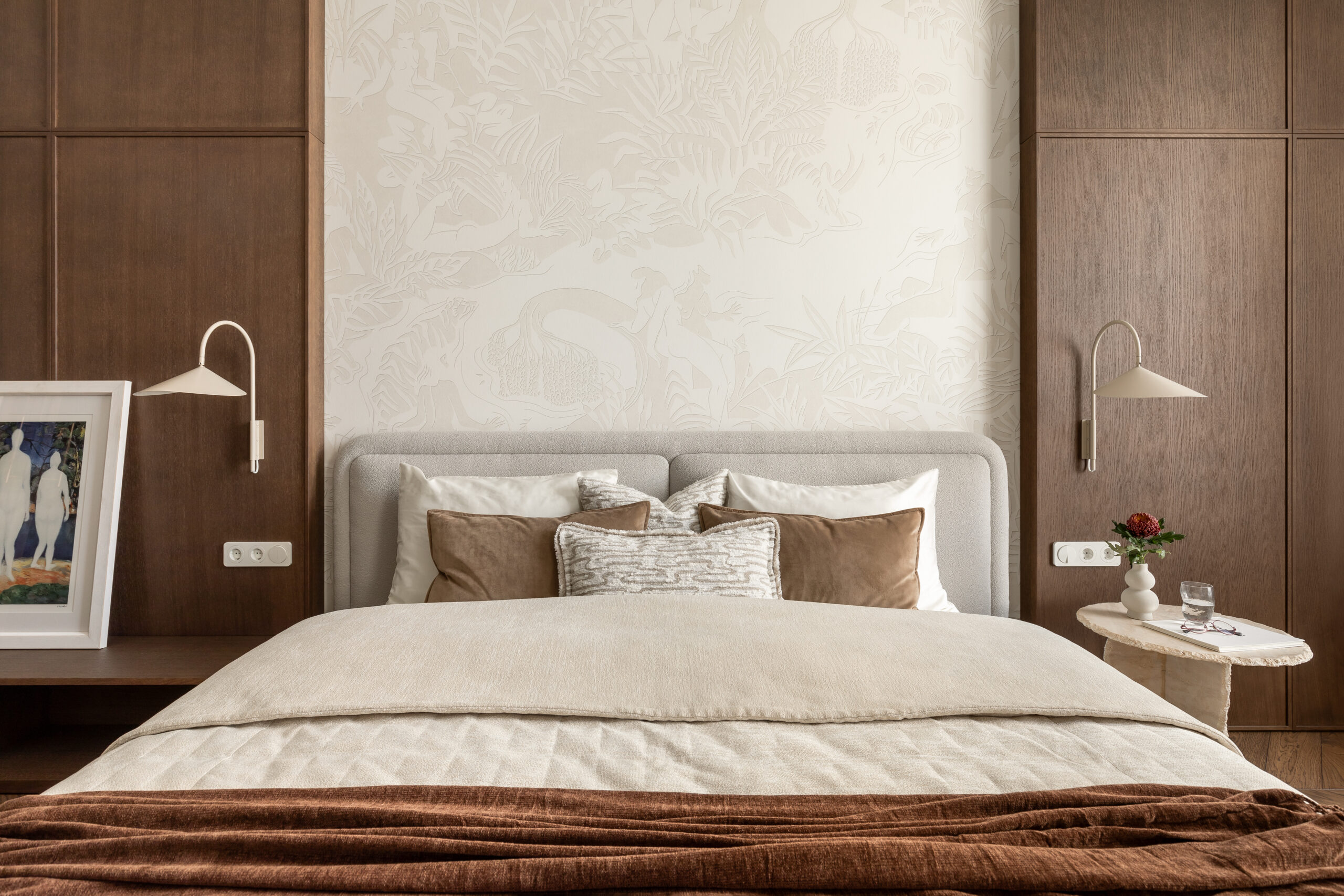 Спальня зберігає камерну, спокійну атмосферу. Стінові панелі зі шпону шоколадного відтінку додають глибини та тактильного тепла простору, а французькі шпалерні панно Éternelles (Isidore Leroy) з купальщицями створюють поетичний настрій і відкривають нові деталі при кожному