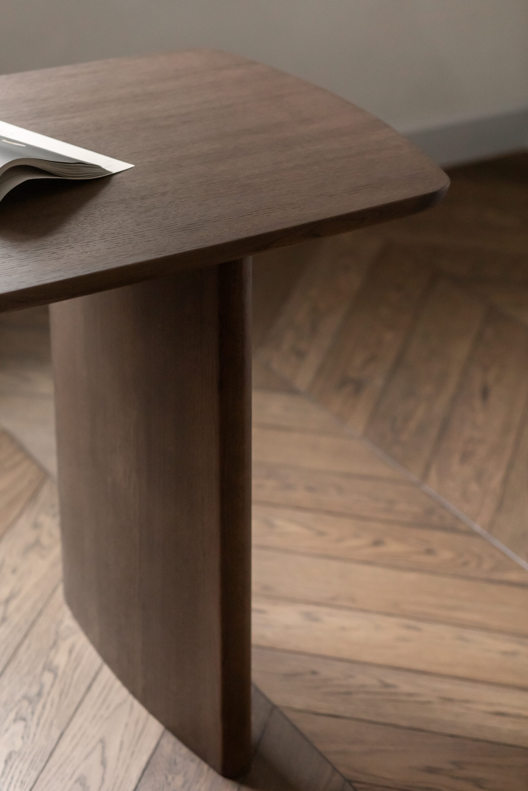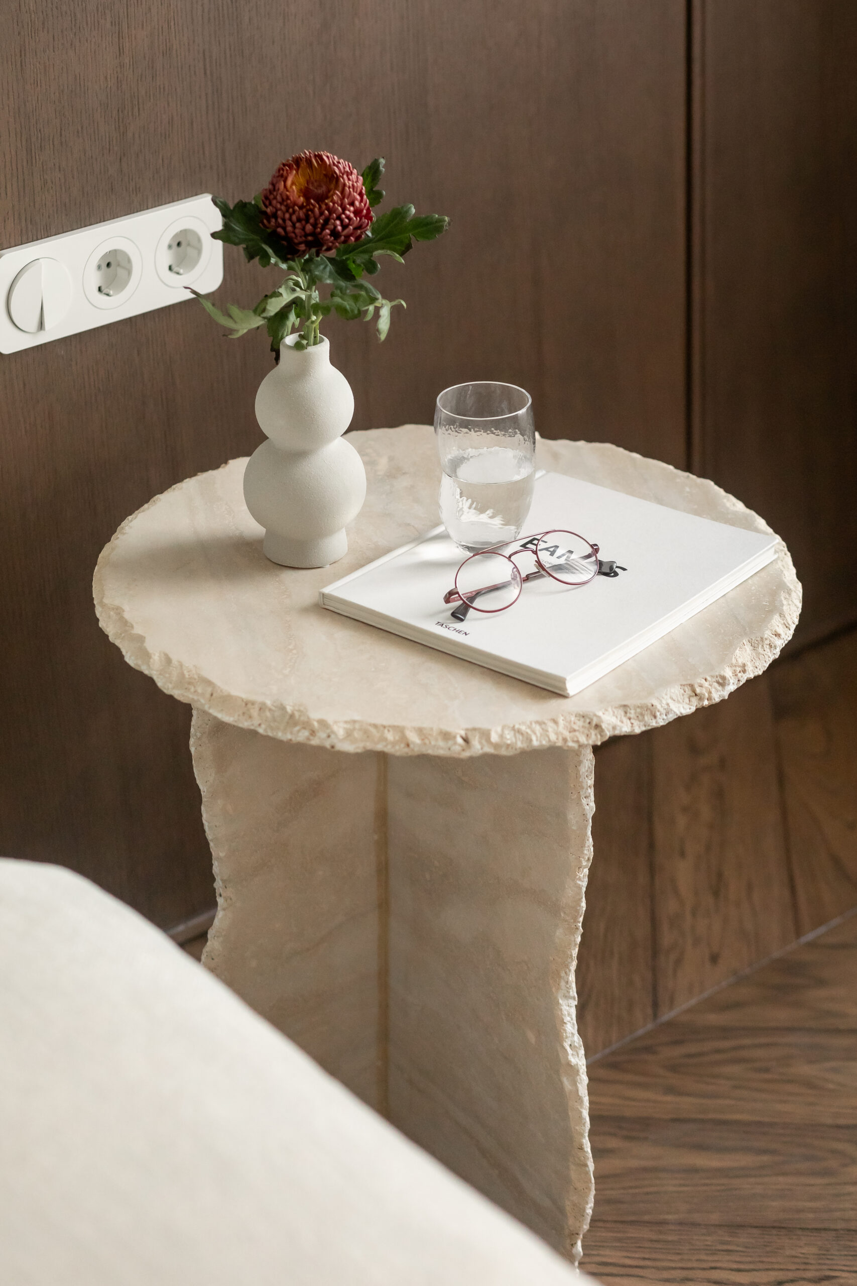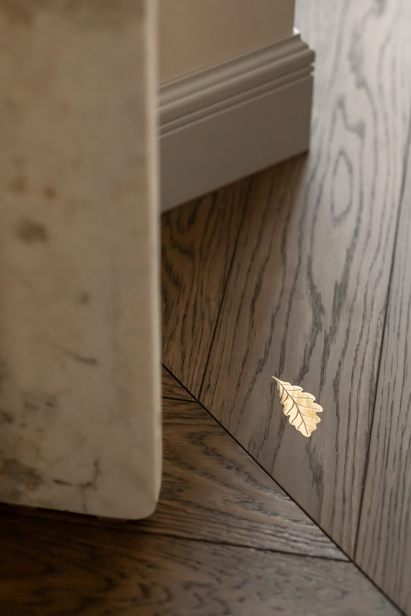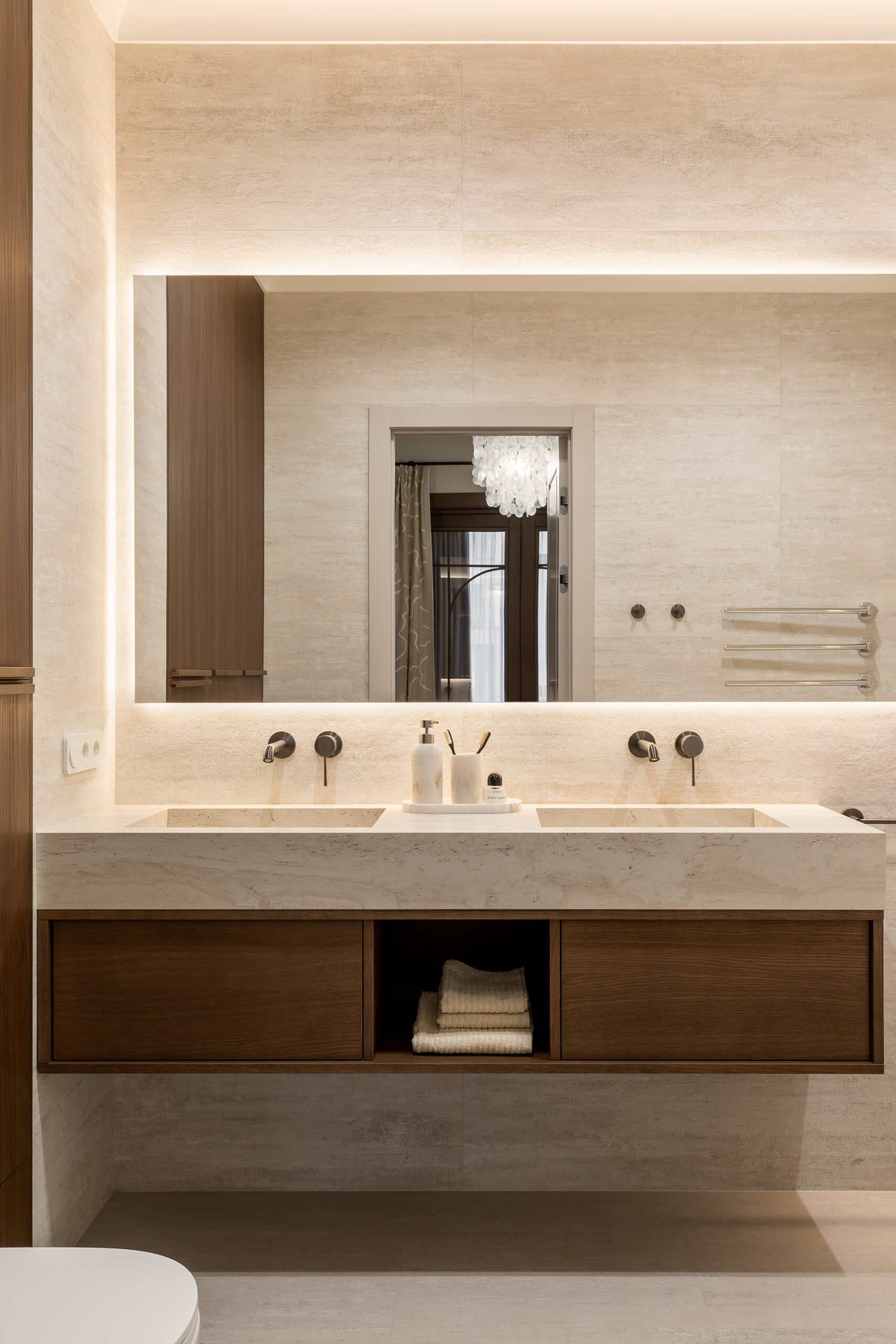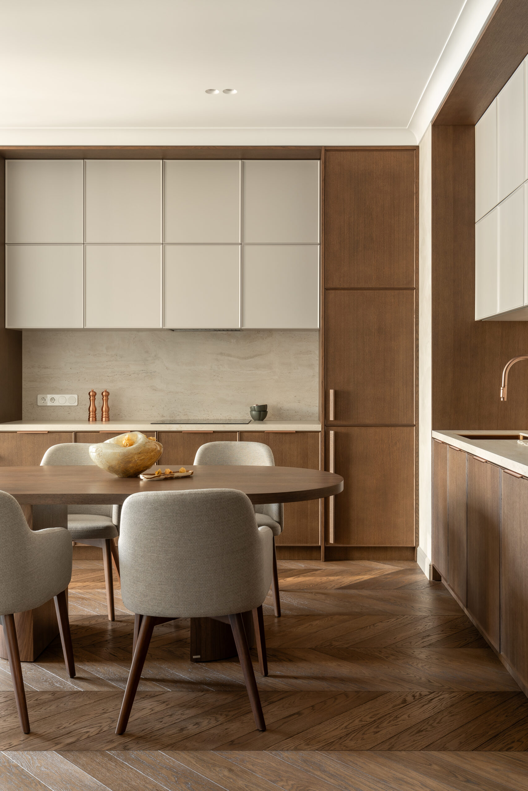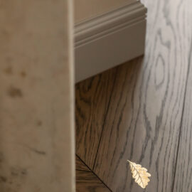 Палітра інтер’єру стримана й тепла. Шпон дерева, травертин і бархатиста декоративна штукатурка на стінах формують глибоке, спокійне тло. На підлозі – паркет шеврон у кольорі шоколадного дуба з назвою «Ірпінь» – деталь, у якій для дизайнерки був важливий і тактильний, і емоційний сенс.