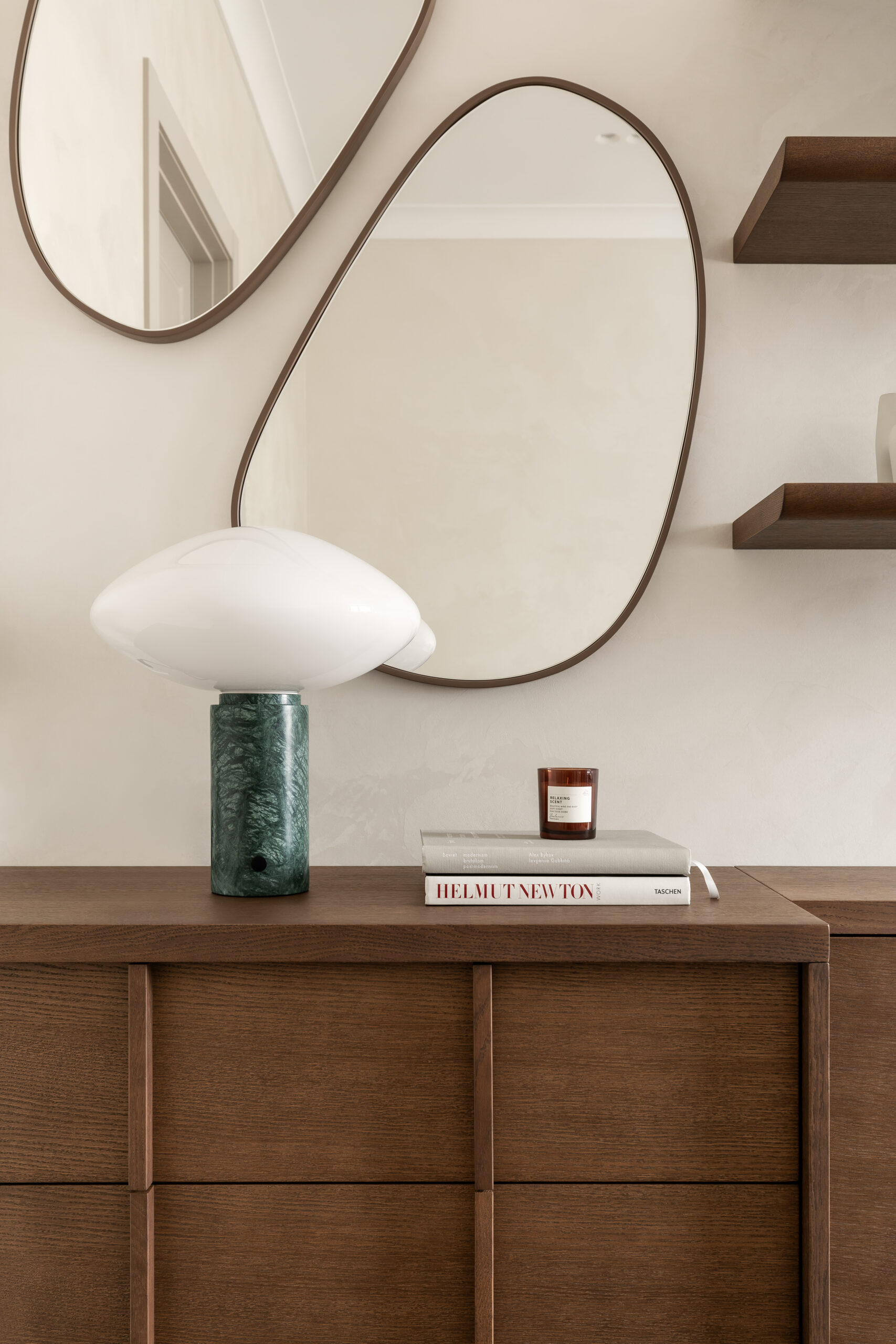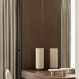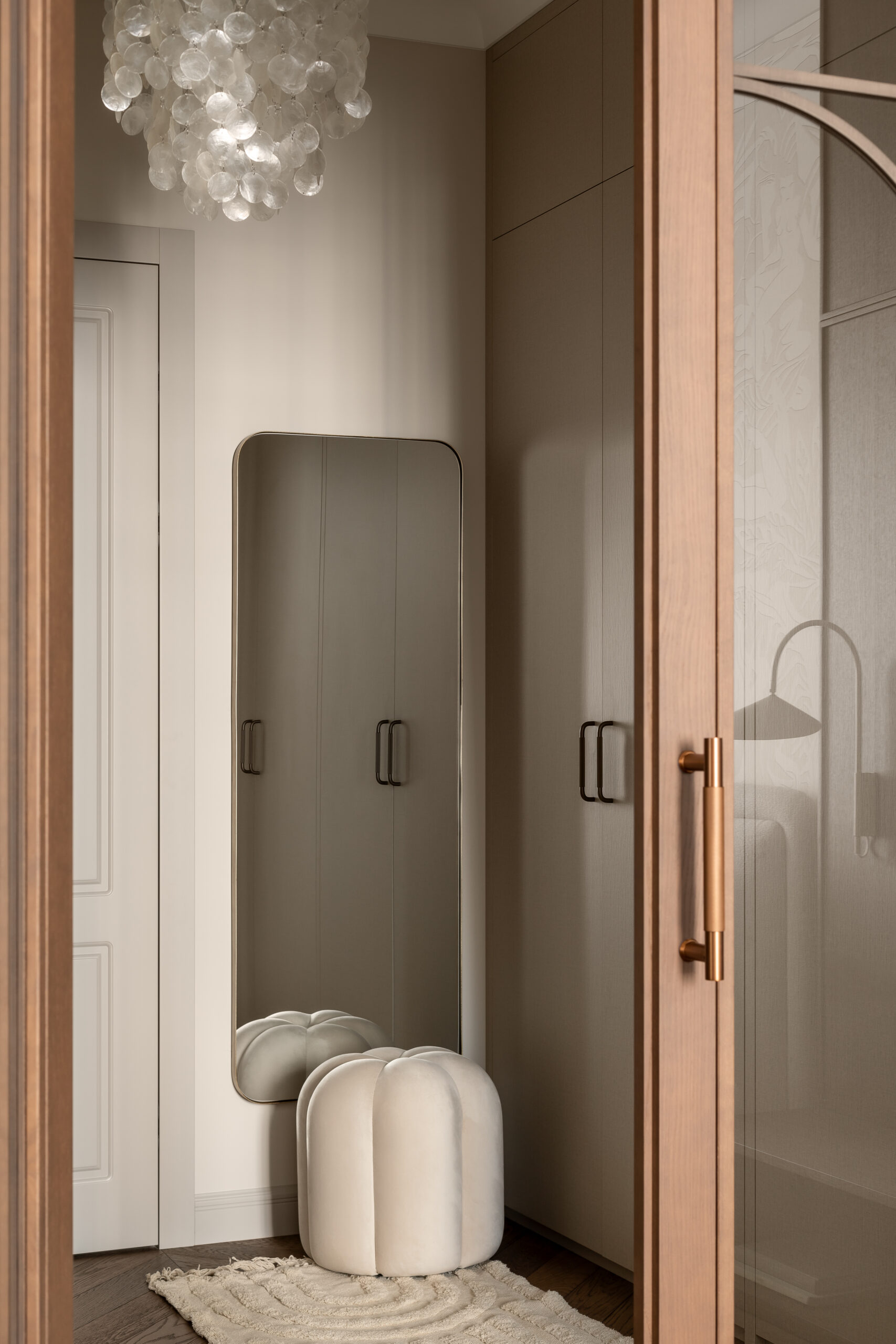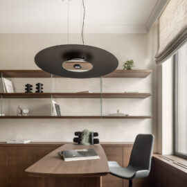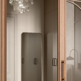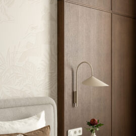 Світло в цьому проєкті – не просто функція, а інструмент атмосфери. Інтер’єр доповнюють світильники іконічних брендів: Fun від Verpan (люстра з перламутром в гардеробній), Lampe de Marseille за дизайном Ле Корбюзьє (бра в кабінеті), Levante від Luceplan (люстра в вітальні), а також предмети скандинавських марок Ferm Living (бра в спальні), Audo (настольні лампи) та