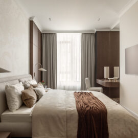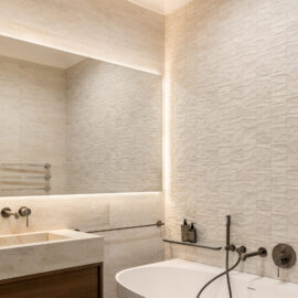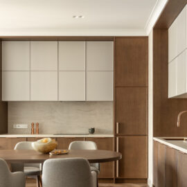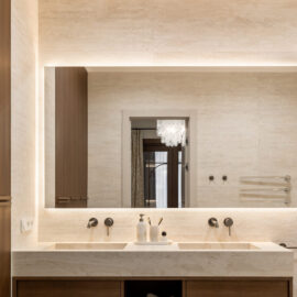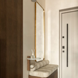 Планування квартири вибудуване максимально логічно й водночас інтуїтивно. Загальна зона об’єднує кухню та вітальню – відкритий, наповнений світлом простір для спільного часу, неспішних сніданків і вечорів удома. Приватна частина вирішена у форматі майстер-блоку: спальня плавно переходить у прохідний гардероб і далі – у ванну кімнату з окремостоячою ванною. Така послідовність створює відчуття готельного комфорту, але без холодної відстороненості – навпаки, з дуже особистим настроєм.