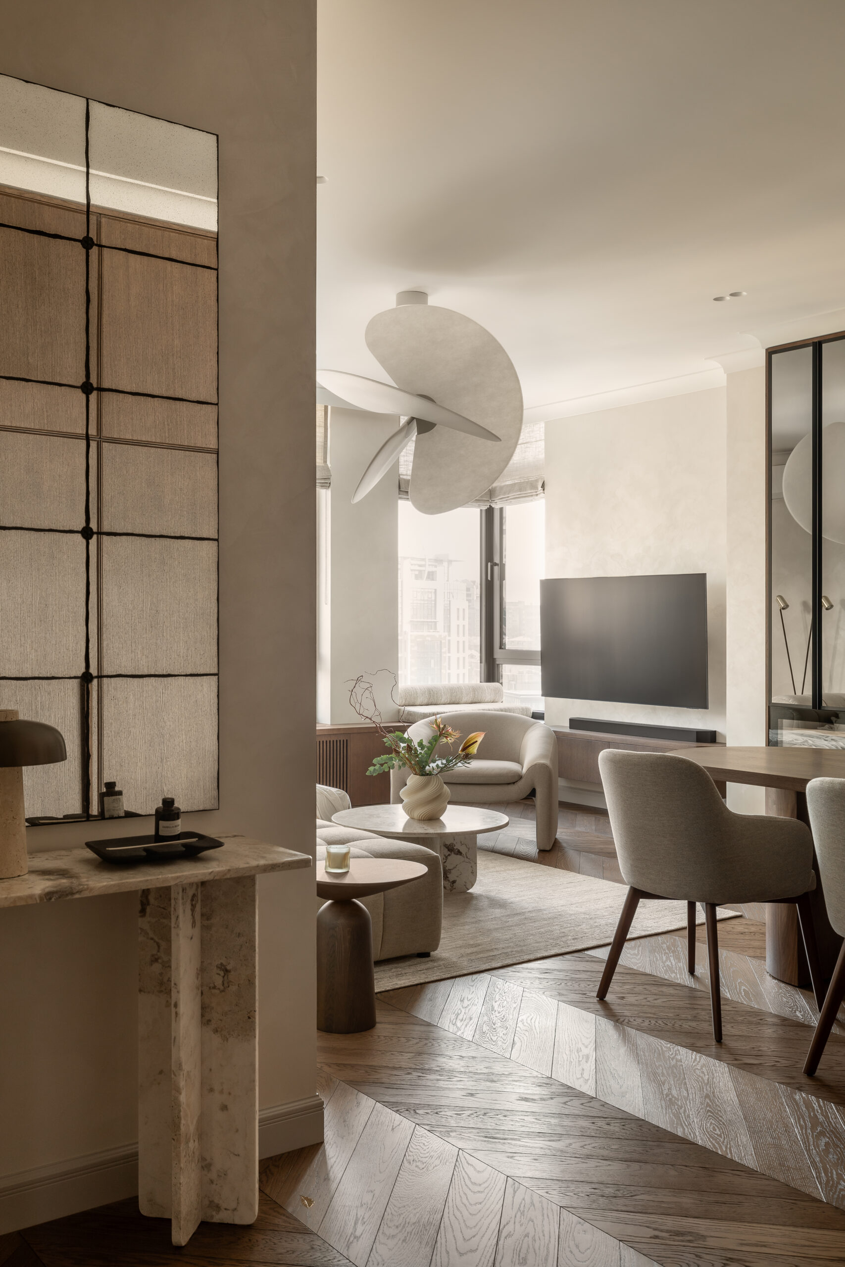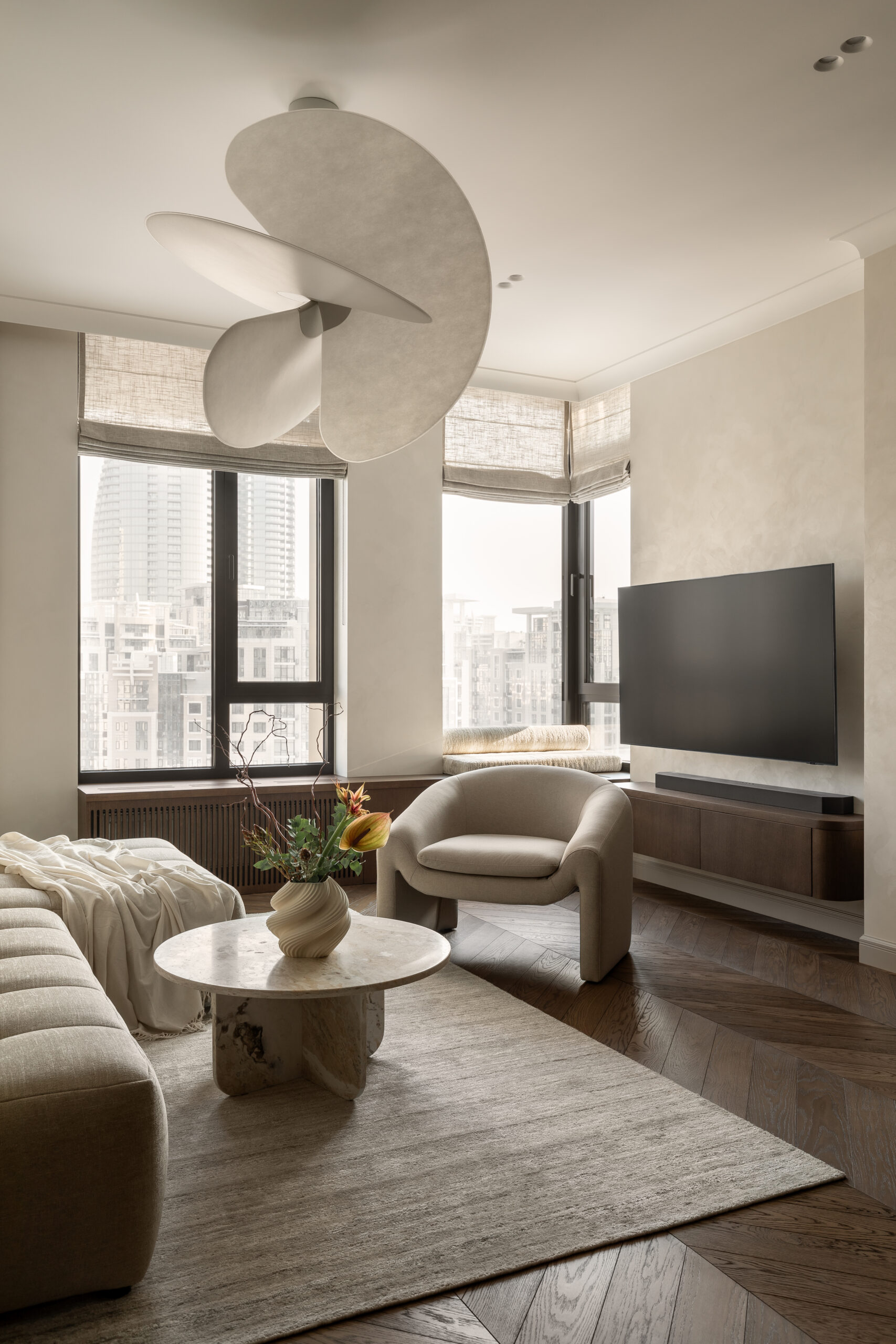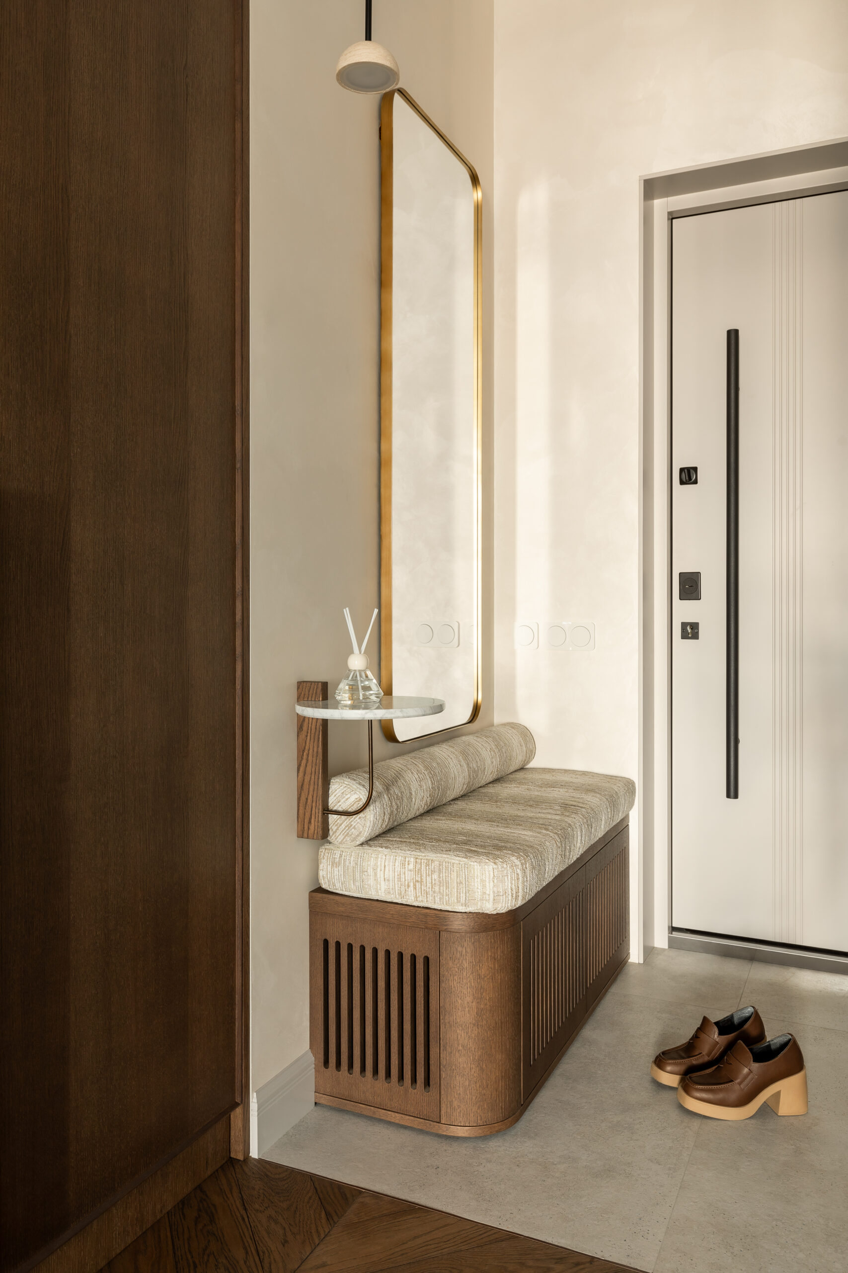 Цей інтер’єр дизайнерка Ліза Пишнева замислювала як простір повернення. Не демонстративний, не показовий, а такий, що м’яко огортає після подорожей, змін часових поясів і насичених днів.