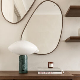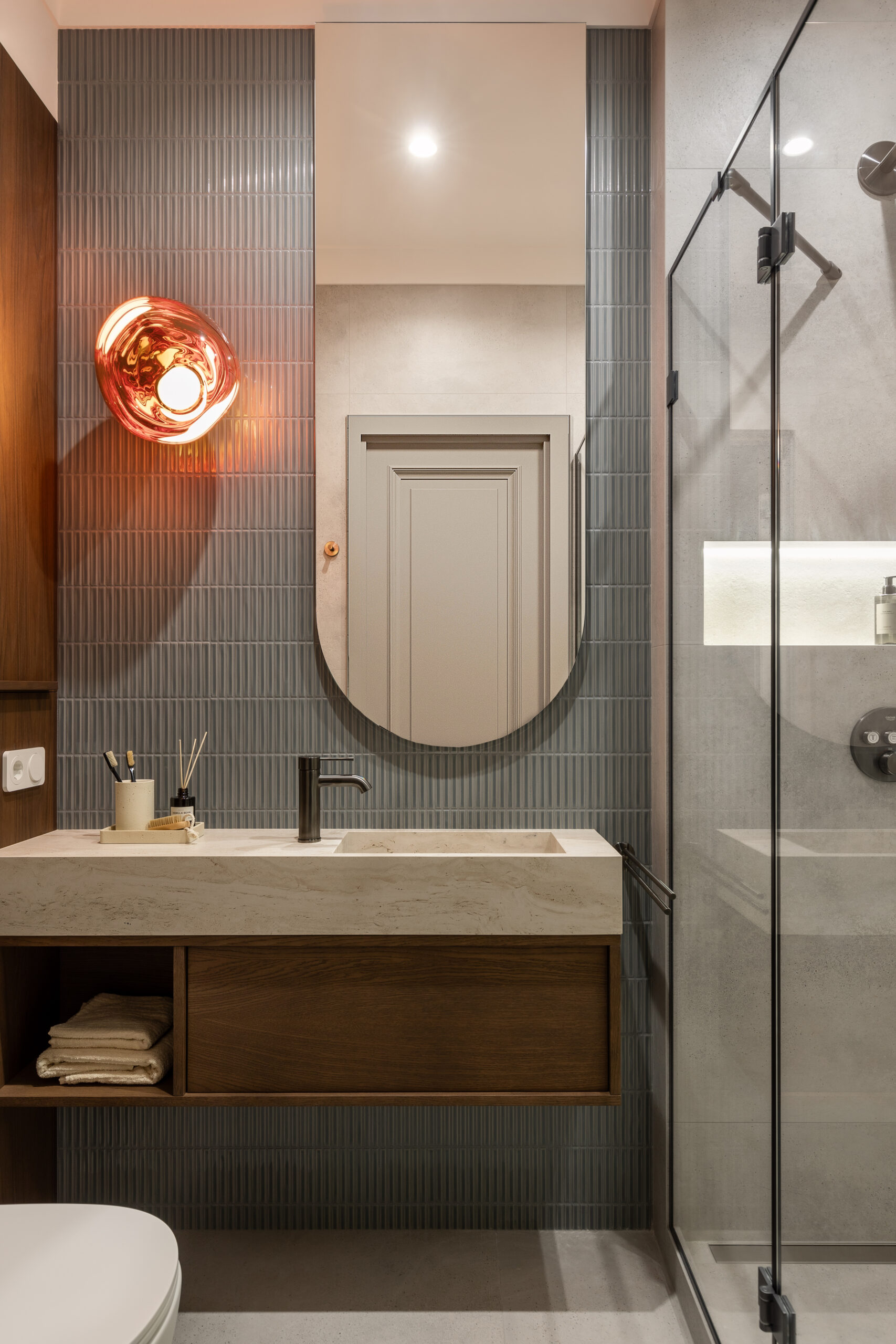&Tradition (настольна лампа), Melt Tom Dixon (бра в гостьовому санвузлі). Вони працюють як архітектурні акценти, підкреслюючи об’єм і фактуру простору, не перевантажуючи його.