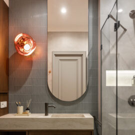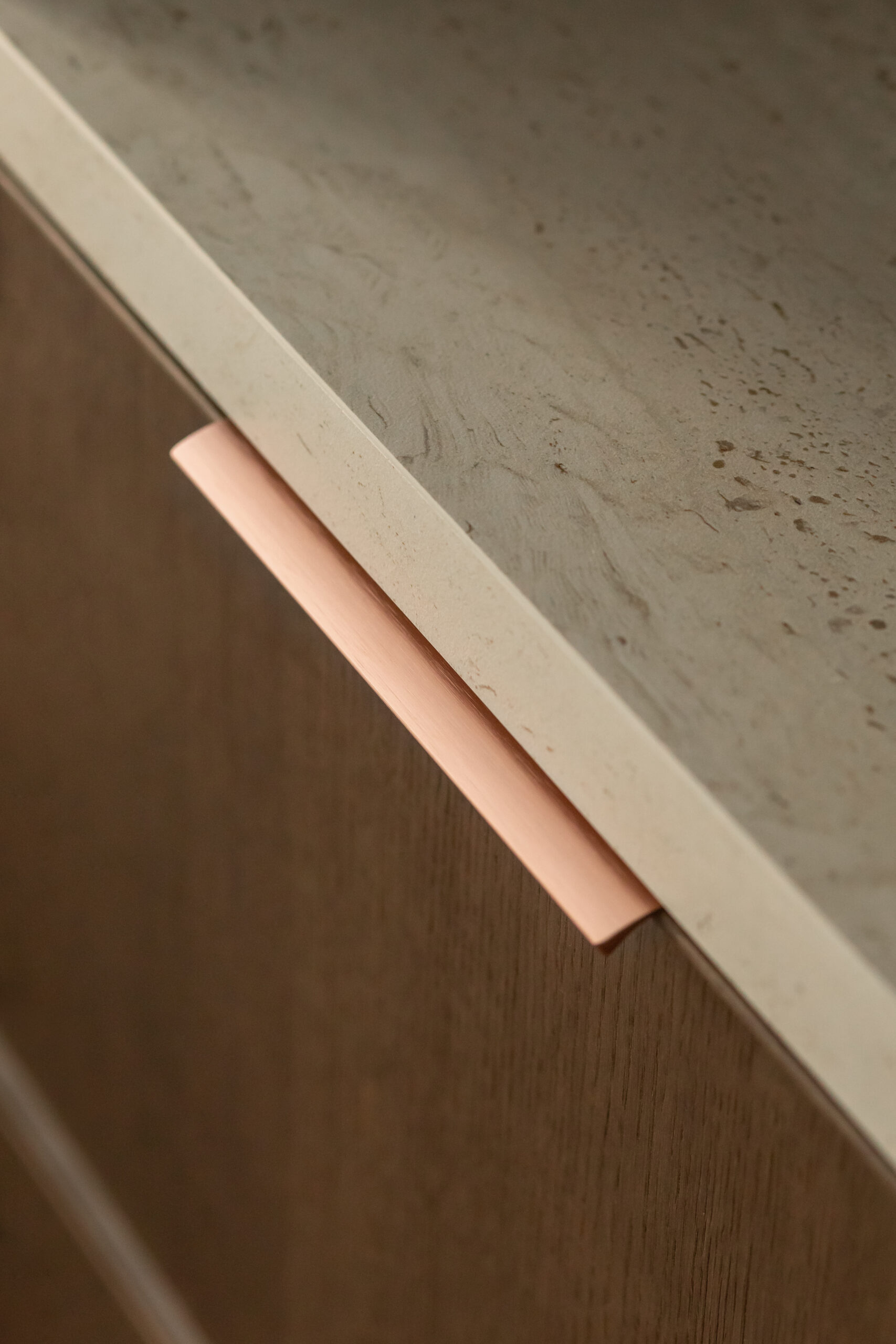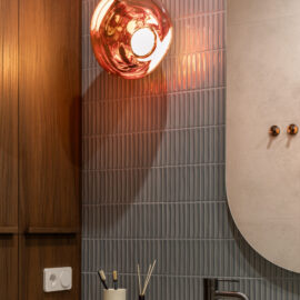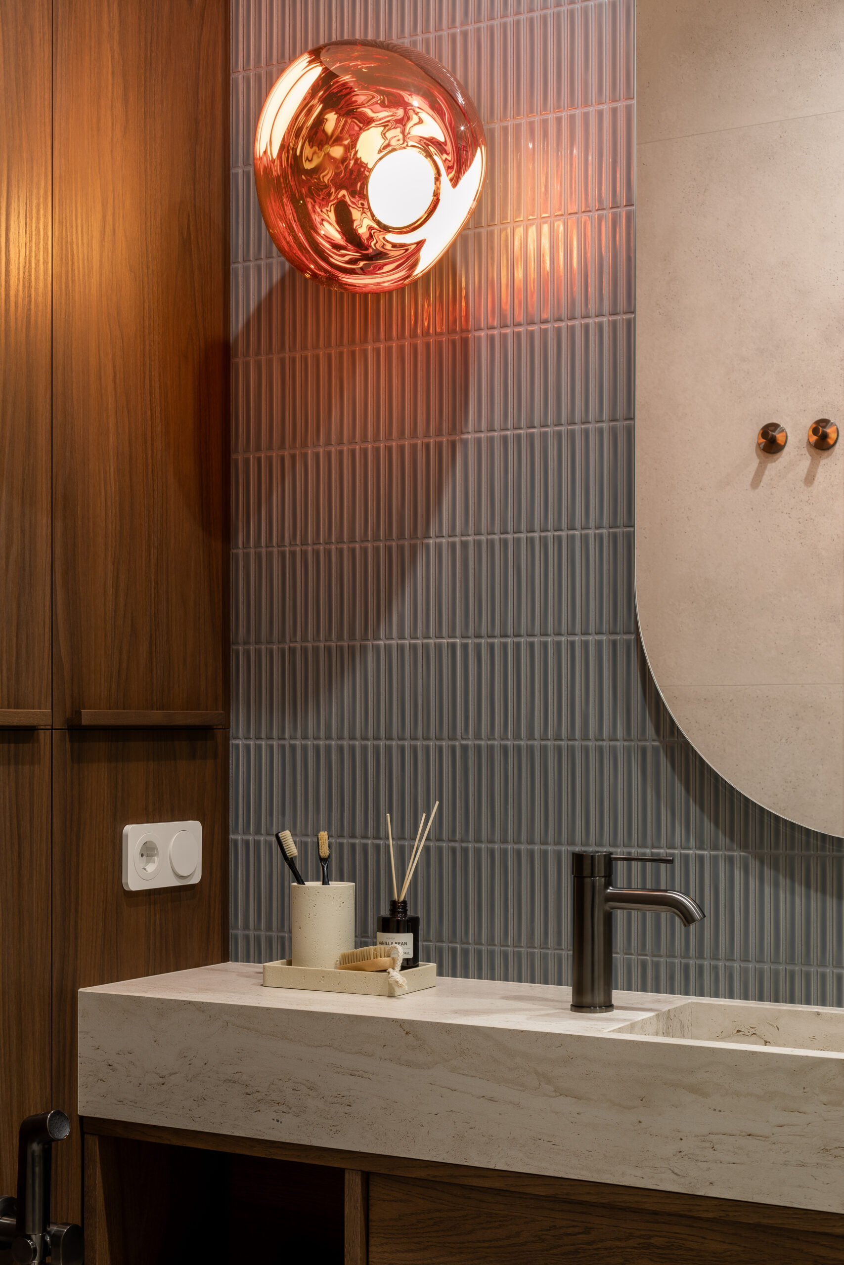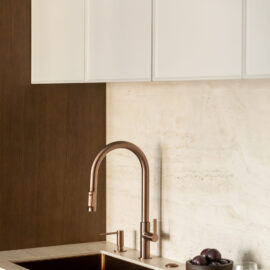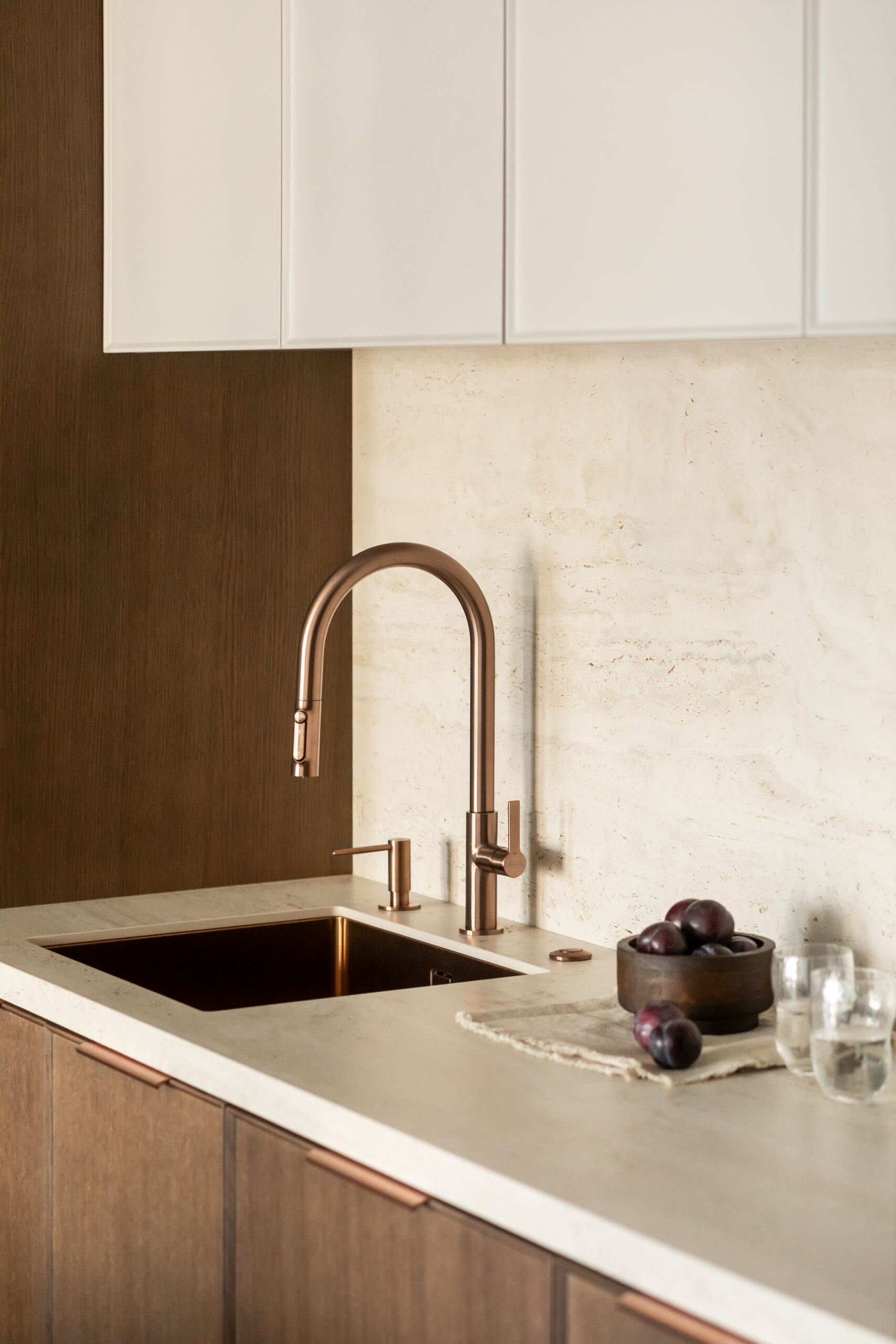 Теплі металеві деталі — ручки й змішувачі в кольорі міді — додають інтер’єру стриманої, майже інтимної розкоші.