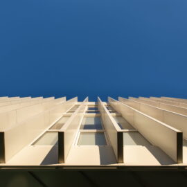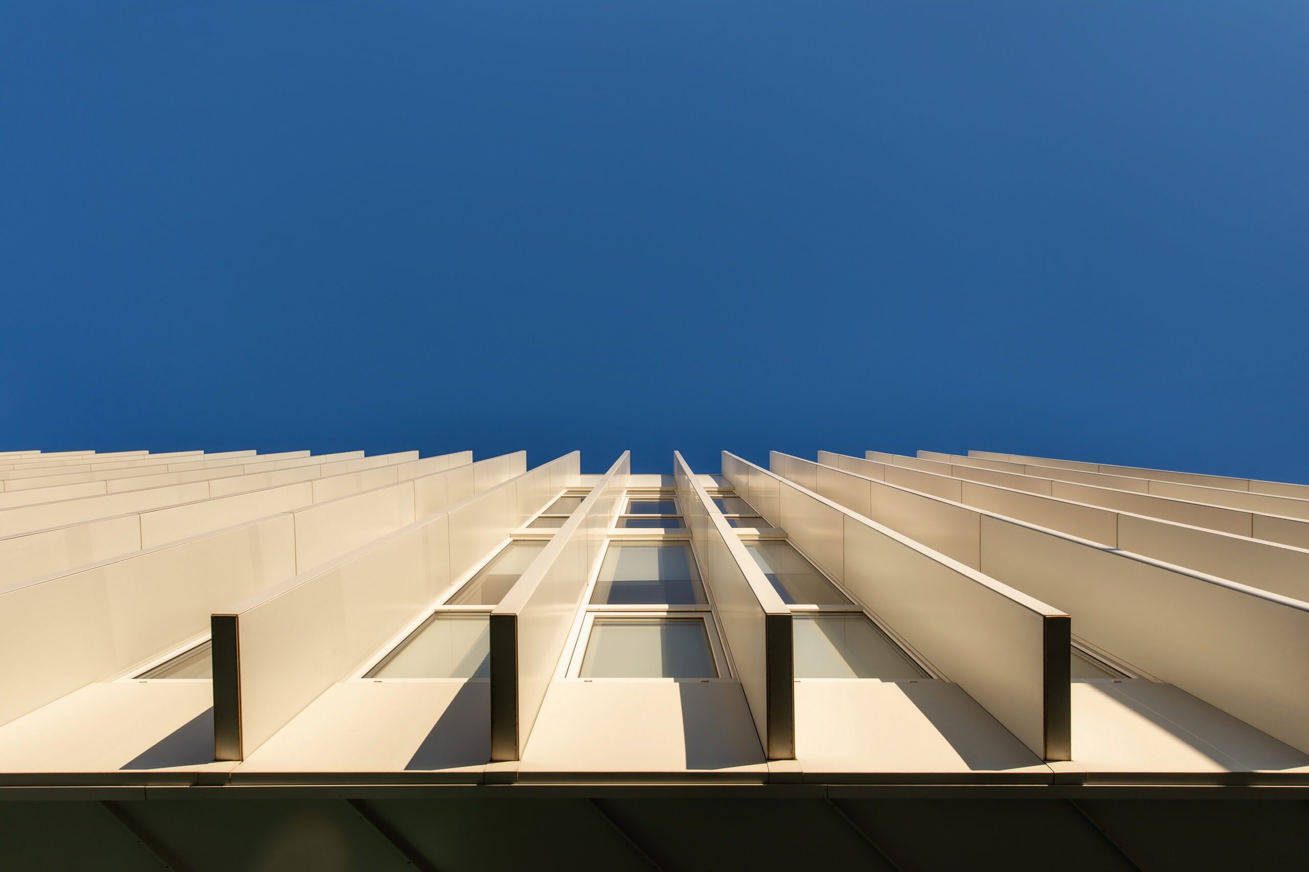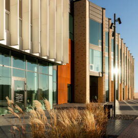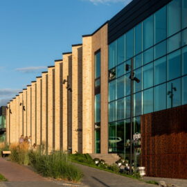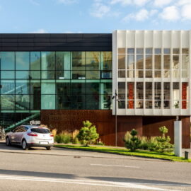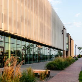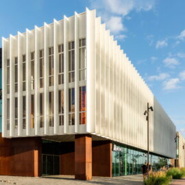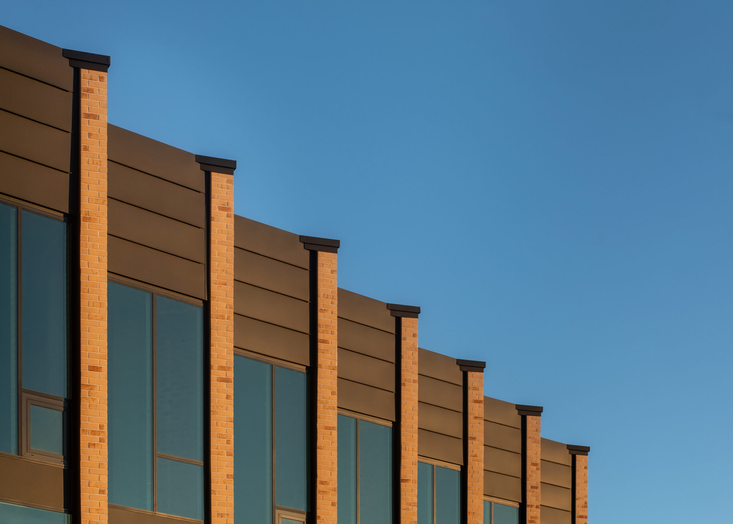 Через довжину будівлі в масштабах двох вулиць (по 100 м) фасад потрібно було розбити на кілька блоків, кожен із яких здебільшого мав вертикальне членування для того, щоб зменшити ефект довжини. А щоб додати цікавості й об’ємності фасадам, було використано прийом фасадних зломів, що надало образу споруди ще більшої незвичності та сучасності. Великі площі скла, цегли й металу в комбінації роблять будівлю строгою і вишуканою.