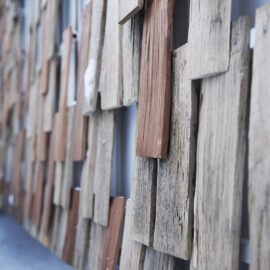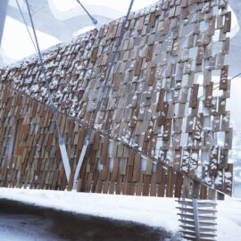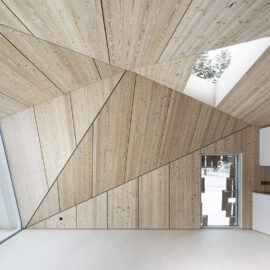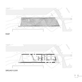 В этом проекте Кэнго Кума переосмыслил традиционные деревянные системы кровли. Фасад дома первоначально покрыт белыми стальными плитами, которые служат для гидроизоляции. А уже к металлическим панелям прикреплены деревянные дощечки из дуба и лиственницы. Каждая дощечка была вырезана вручную и не подвергалась обработке: таким образом древесина будет стареть вместе с домом, создавая разнообразие оттенков на фасаде в зависимости от воздействующих на нее погодных условий.