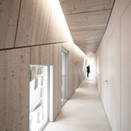 Поскольку дом имеет продолговатую форму, внутренние пространства плавно перетекают одно в другое. Коридор проходит от входа к основной жилой зоне. Изнутри стены дома и потолки облицованы фанерными панелями из лиственницы. На противоположном от входной группы торце здания находится подвешенный балкон.