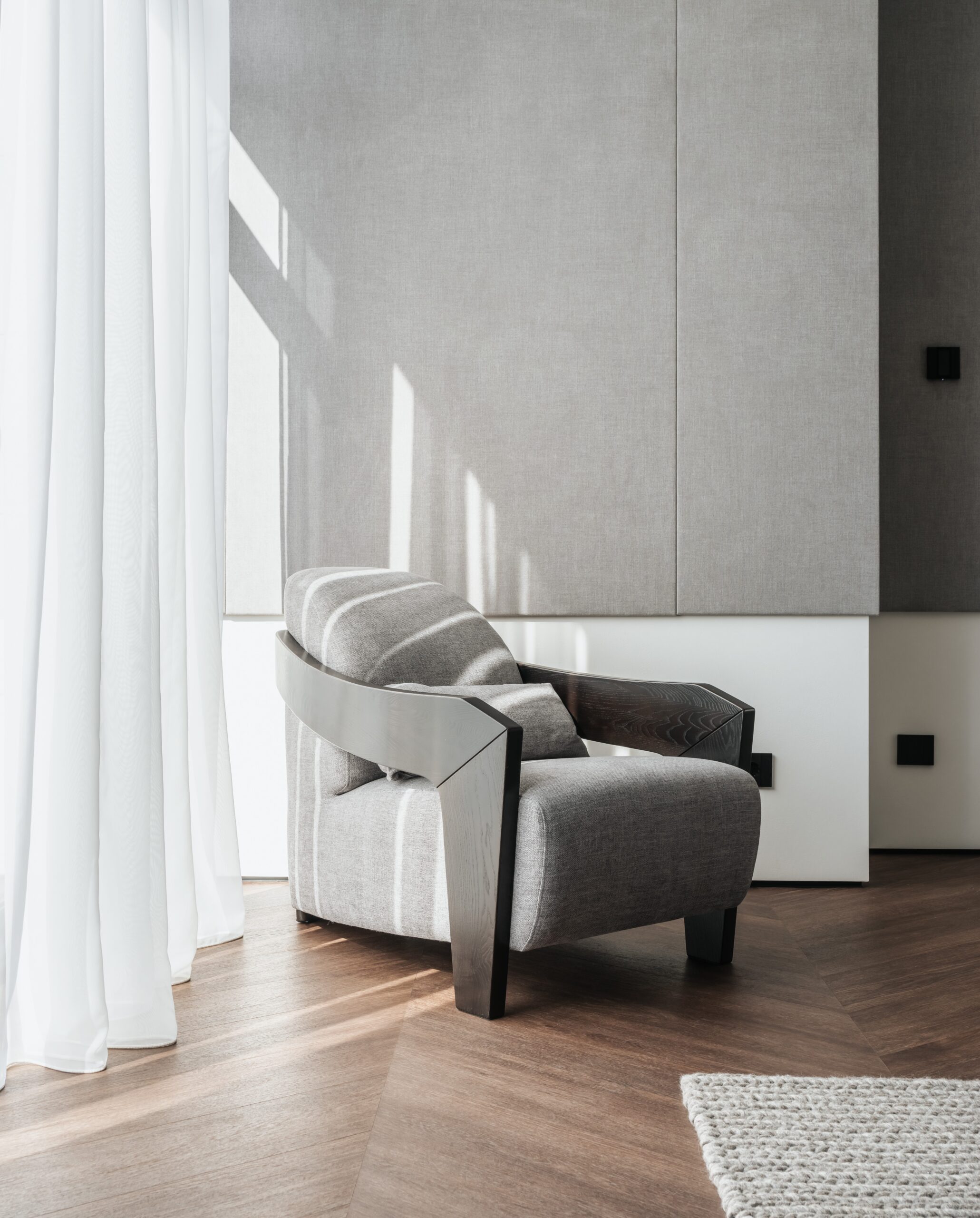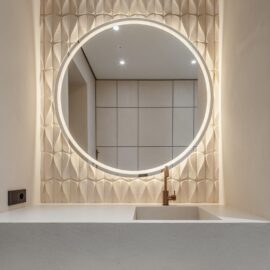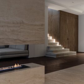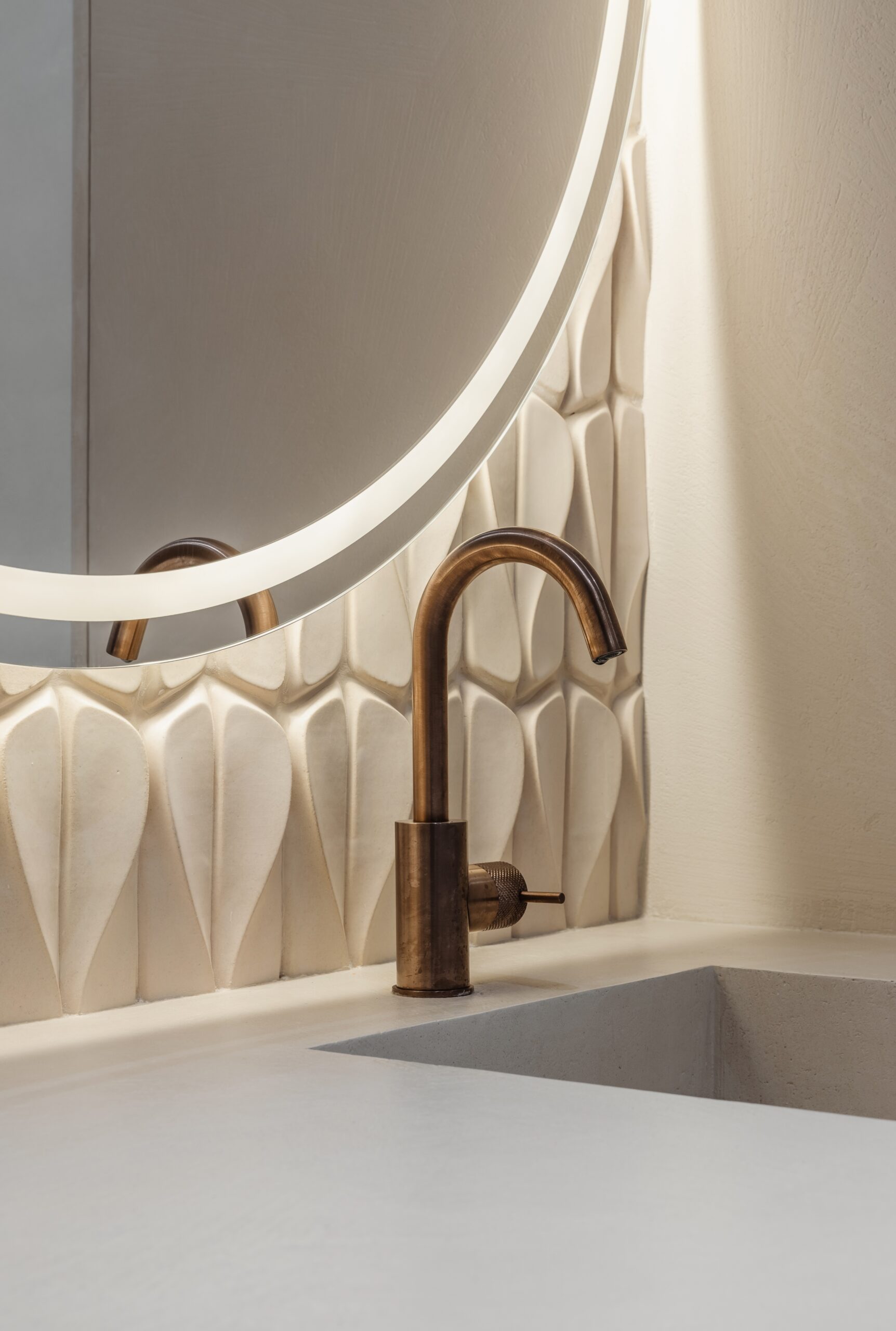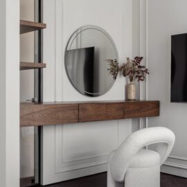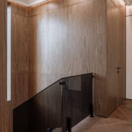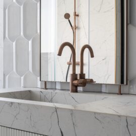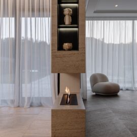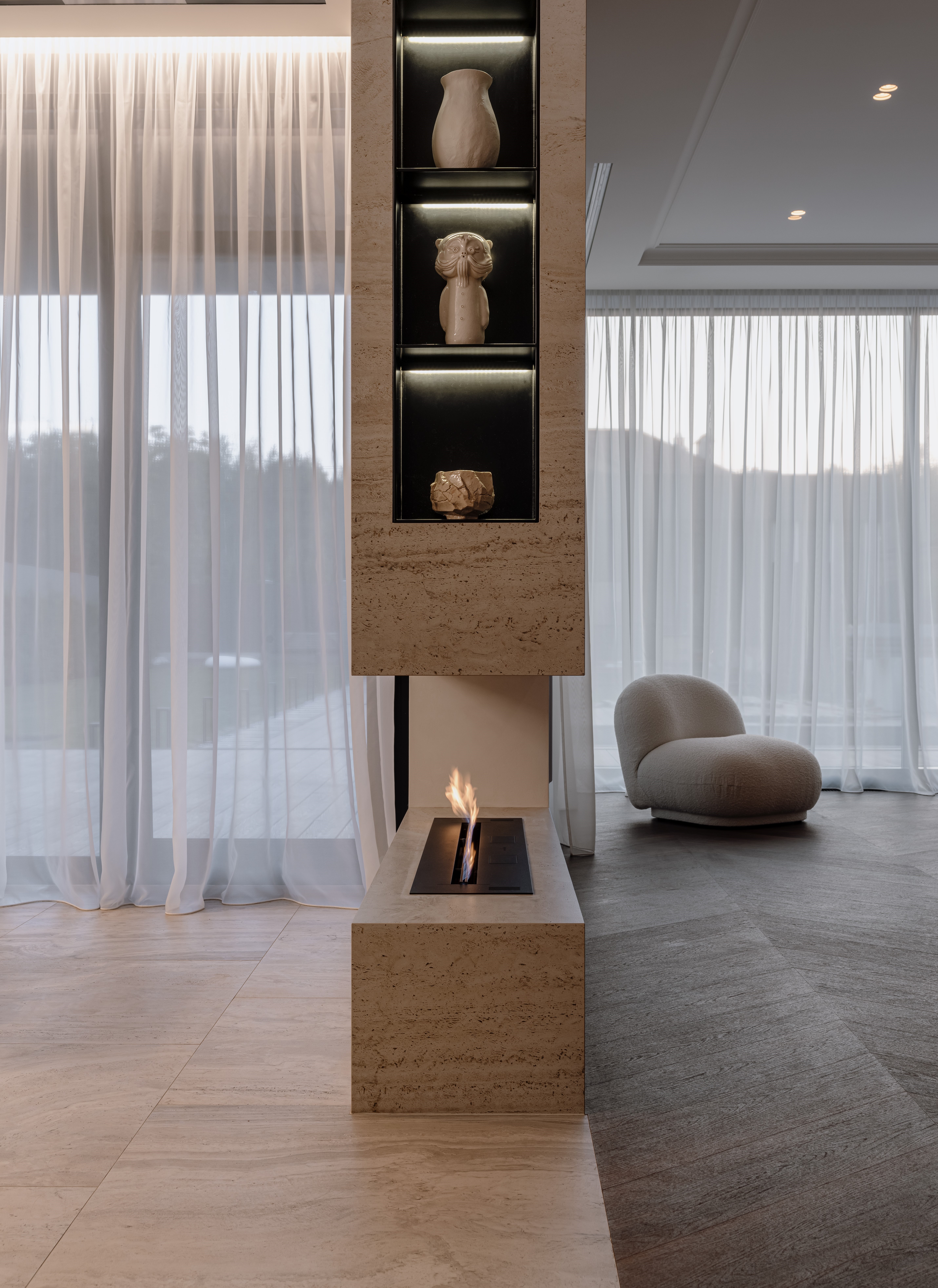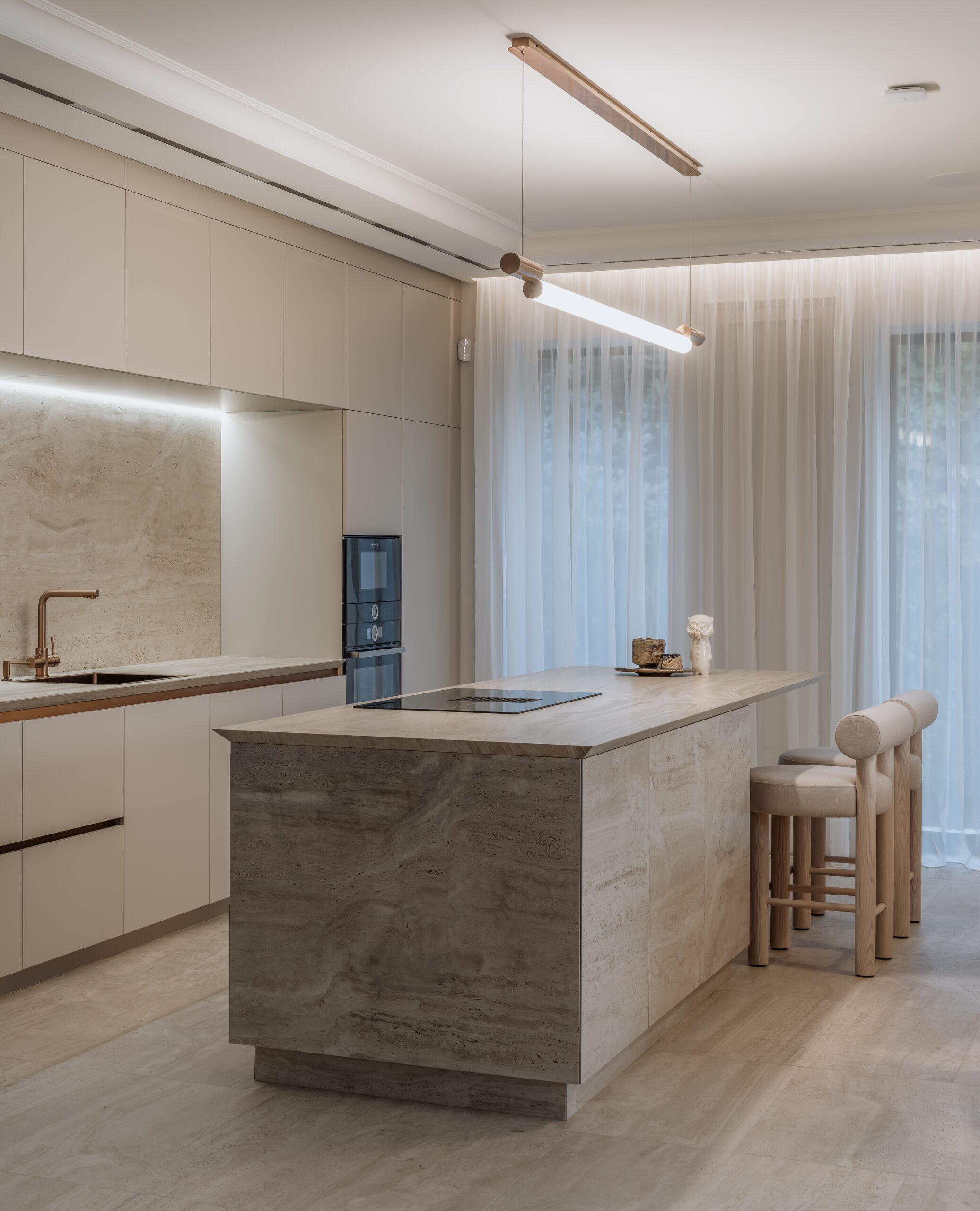 Концепція “сучасна класика” передбачає змішування традиційних сенсів з новітньою формою. “Салонний” декор стін у поєднанні з мідними аксесуарами, круглими дзеркалами, кам’яними поверхнями та всесезонною підсвіткою створюють розмаїття конотацій — від античності до “ревучих 30-х”. Ці елементи ідеально змішані із сучасним функціональним мінімалізмом, що робить PORODA HOUSE неповторним проєктом студії MAKHNO.