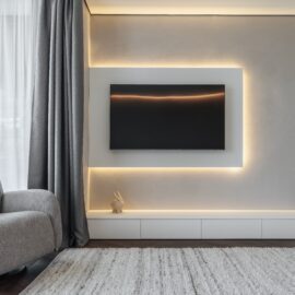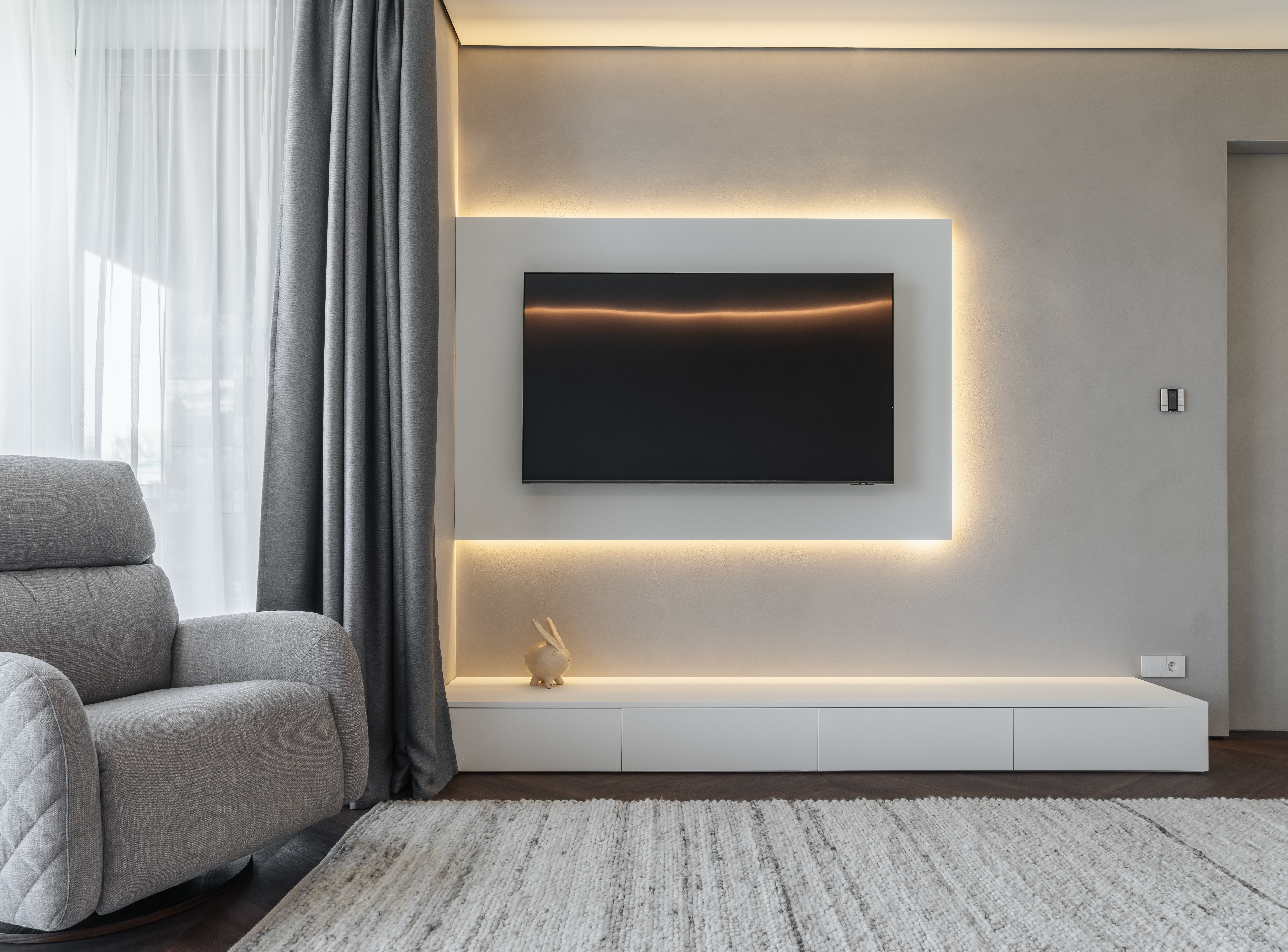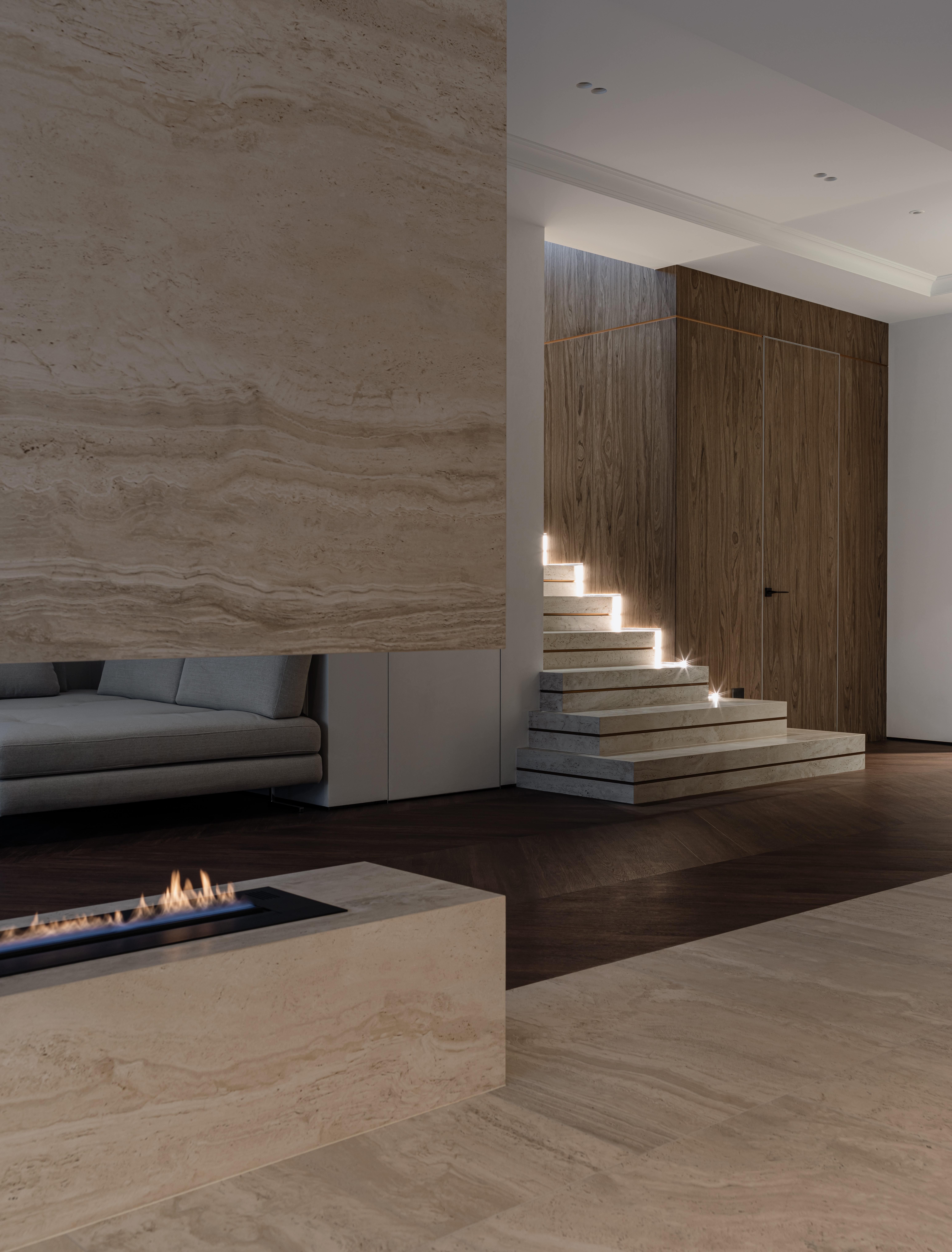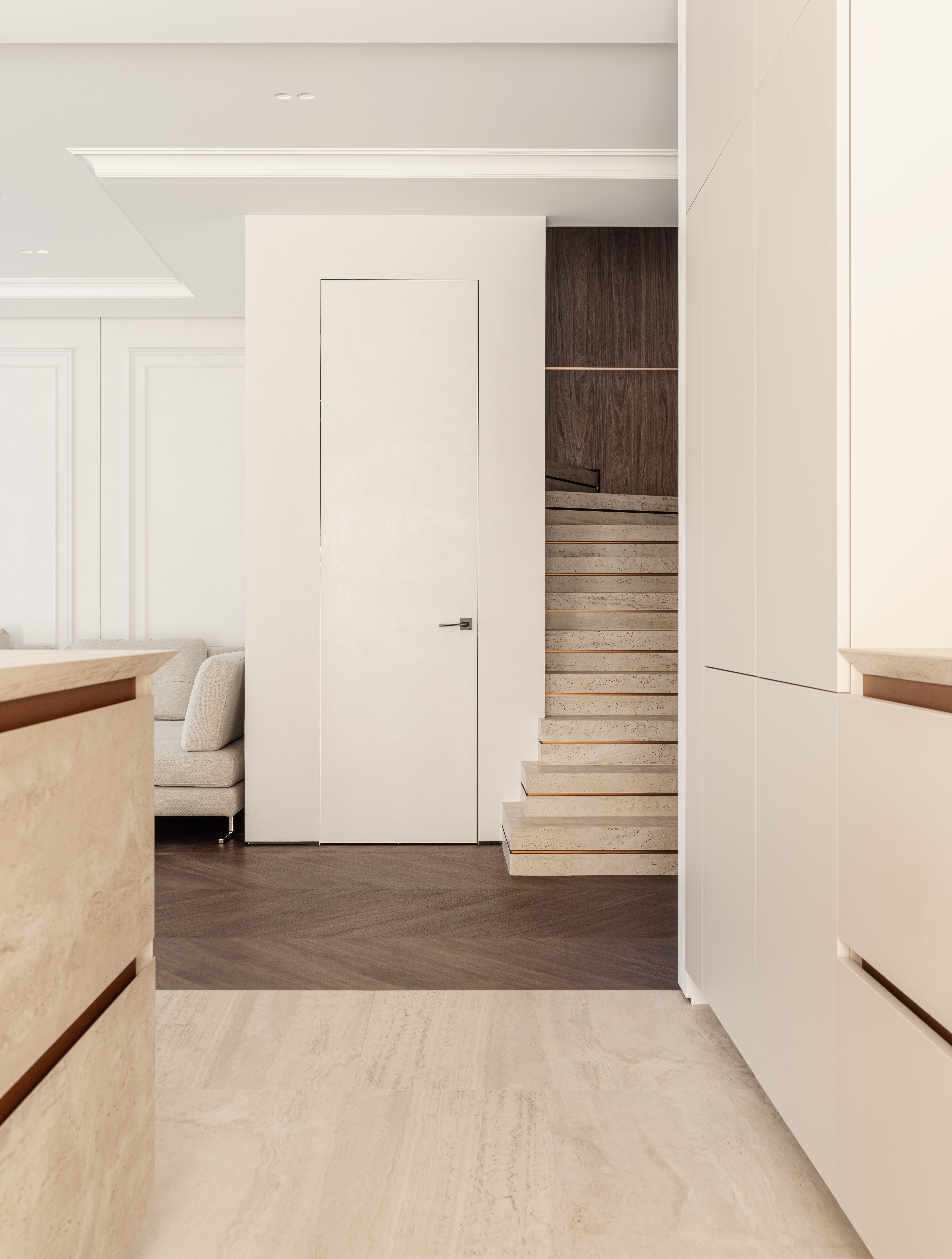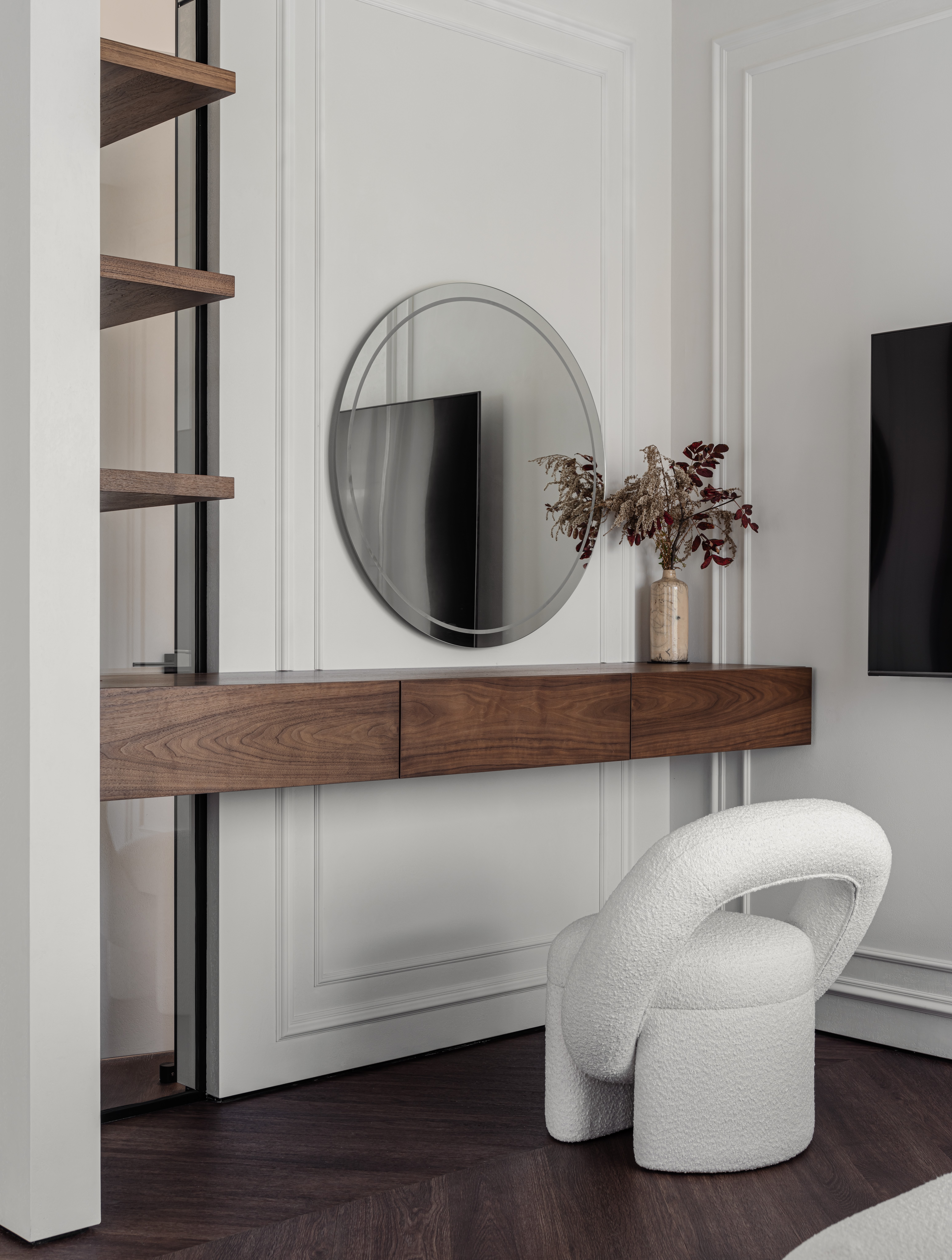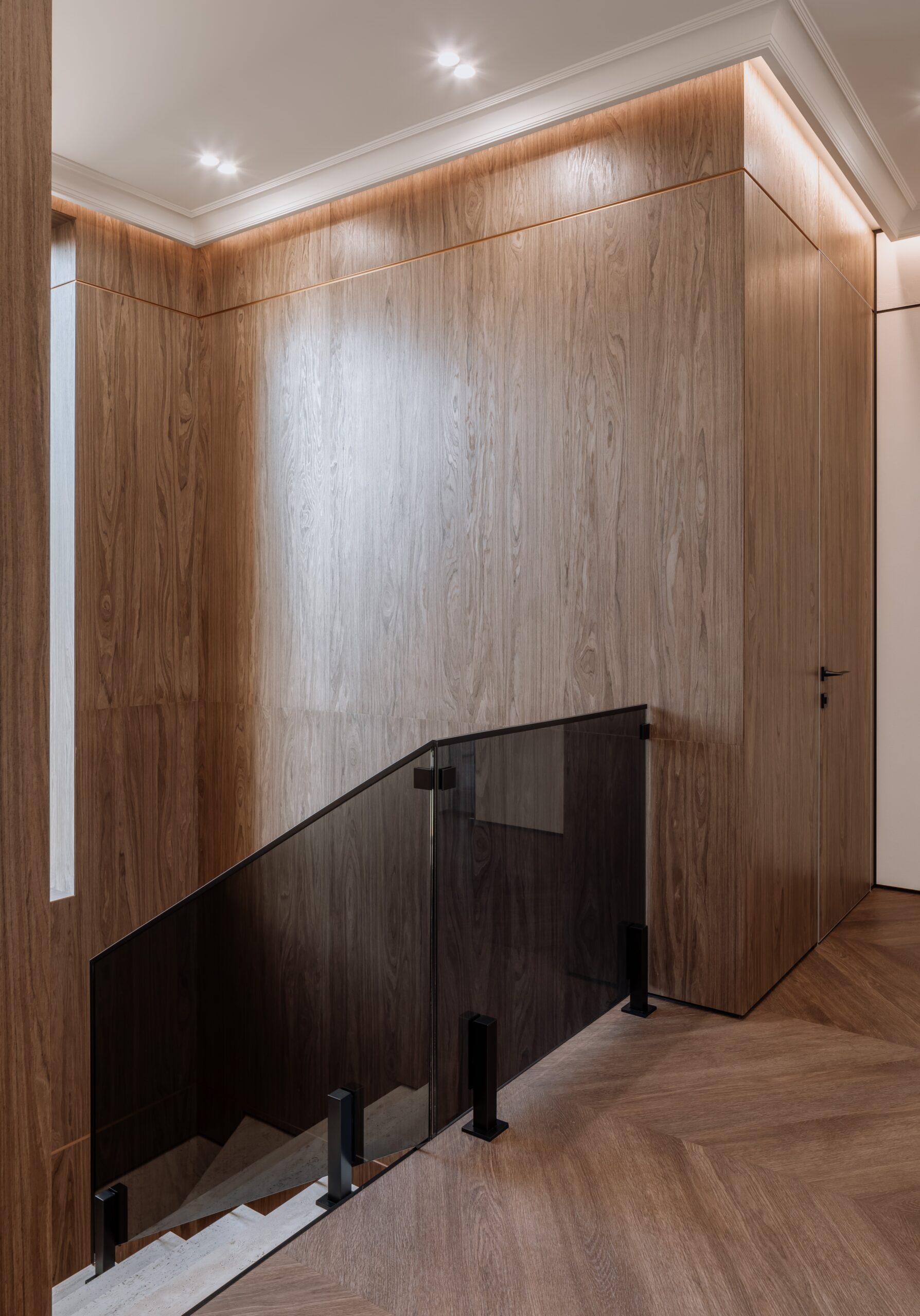 Вхідний простір з керамогранітною підлогою та величезним дзеркалом створює світле та привітне враження. Лівінг рум на першому поверсі зонований на кухню та вітальню з керамогранітними деталями, біокаміном та вмонтованим телевізором. Стіни вітальні прикрашені панелями з молдингом та підсвіткою, що створює відчуття класичної “золотої” доби з сучасним мінімалістичним присмаком.