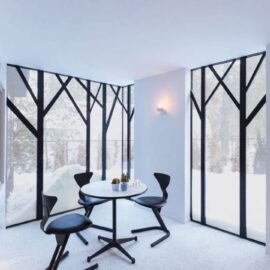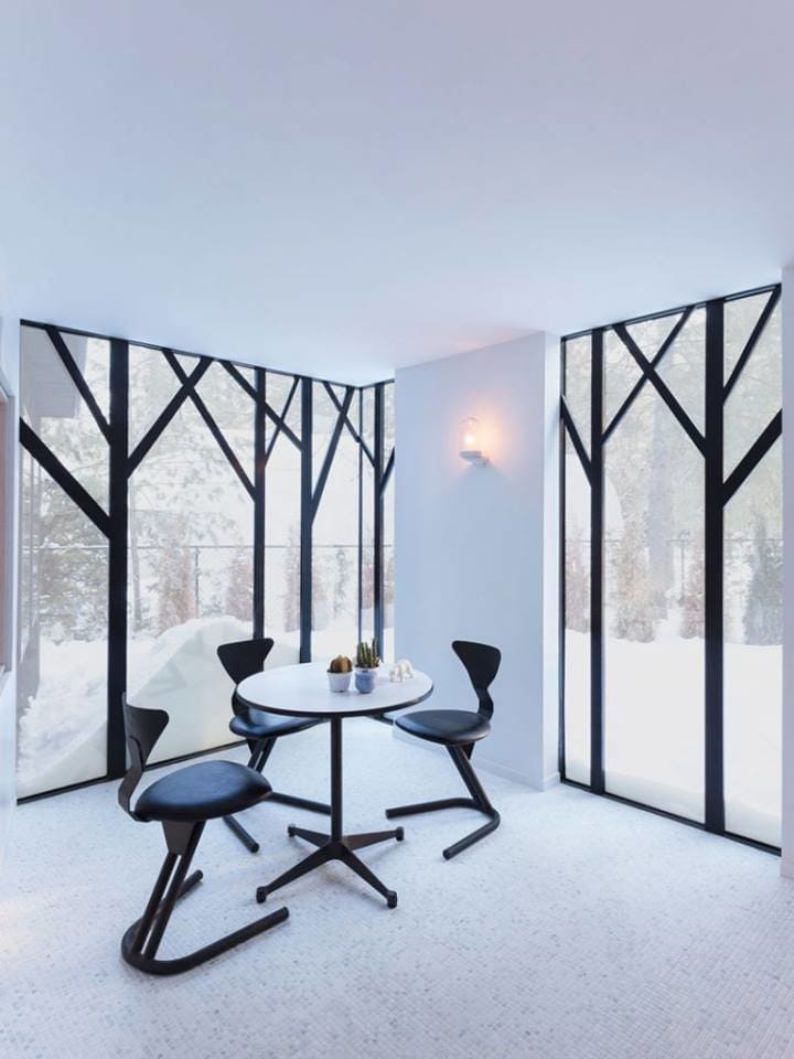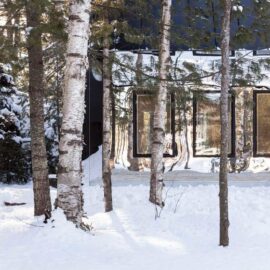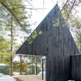 Отметим еще один реализованный проект архитекторов – небольшой дом Lake Cottage, расположенный в лесах Болсовера в Канаде. Цветовое решение загородного коттеджа построено на контрасте обугленного фасада и светлого внутреннего пространства.