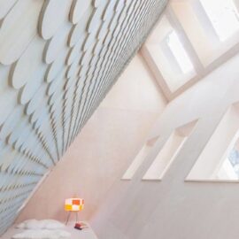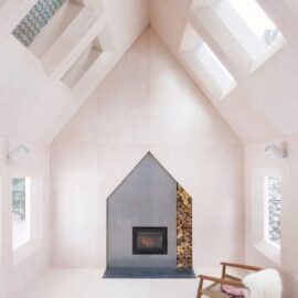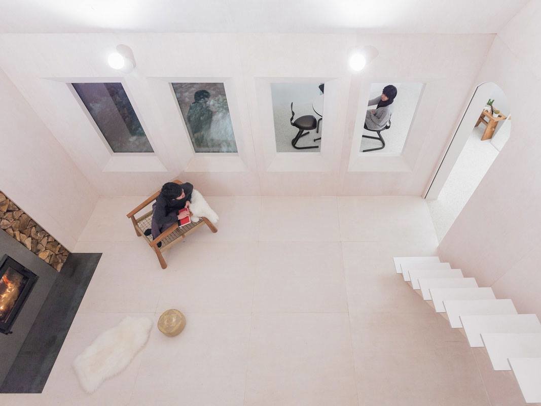 Интерьер дома решен в минималистском ключе. Поверхности внутреннего пространства облицованы выбеленными деревянными панелями. Фокальной точкой гостиной служит бетонный камин, форма которого повторяет очертания стены. Здесь также размещена деревянная лестница, ведущая в нишу на втором этаже. Это пространство представляет собой небольшую комнату неправильной формы с окнами второго света и проемами, из которых можно наблюдать за гостиной. Одна из стен ниши декорирована голубыми деревянными панелями, выложенными в виде черепичной кладки.