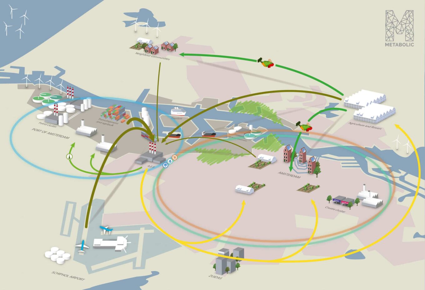 Модель Circular Economy для Амстердама — схема замкнутого циклу ресурсів і енергопотоків. Джерело зображення: Metabolic.nl