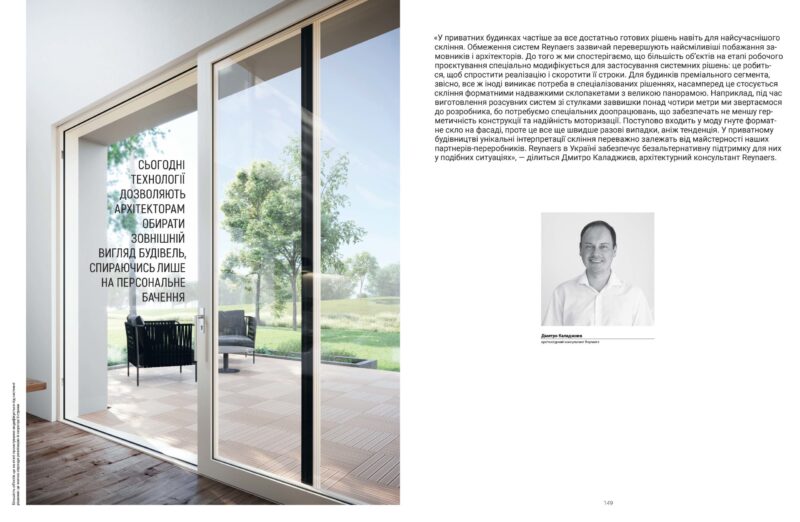«У приватних будинках частіше за все достатньо готових рішень навіть для найсучаснішого скління. Обмеження систем Reynaers зазвичай перевершують найсміливіші побажання замовників і архітекторів. До того ж ми спостерігаємо, що більшість об’єктів на етапі робочого проєктування спеціально модифікується для застосування системних рішень: це робиться, щоб спростити реалізацію і скоротити її строки.