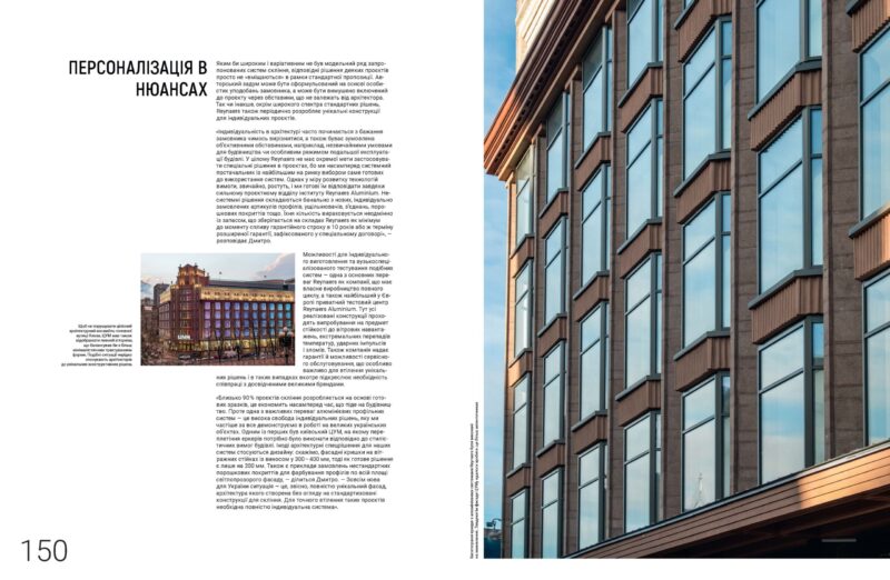 Іноді архітектурні спецрішення для наших систем стосуються дизайну: скажімо, фасадні кришки на вітражних стійках із виносом у 300 – 400 мм, тоді як готове рішення є лише на 200 мм. Також є приклади замовлень нестандартних порошкових покриттів для фарбування профілів по всій площі світлопрозорого фасаду, — ділиться Дмитро. — Зовсім нова для України ситуація — це, звісно, повністю унікальний фасад, архітектура якого створена без огляду на стандартизовані конструкції для скління. Для точного втілення таких проєктів необхідна повністю індивідуальна система».