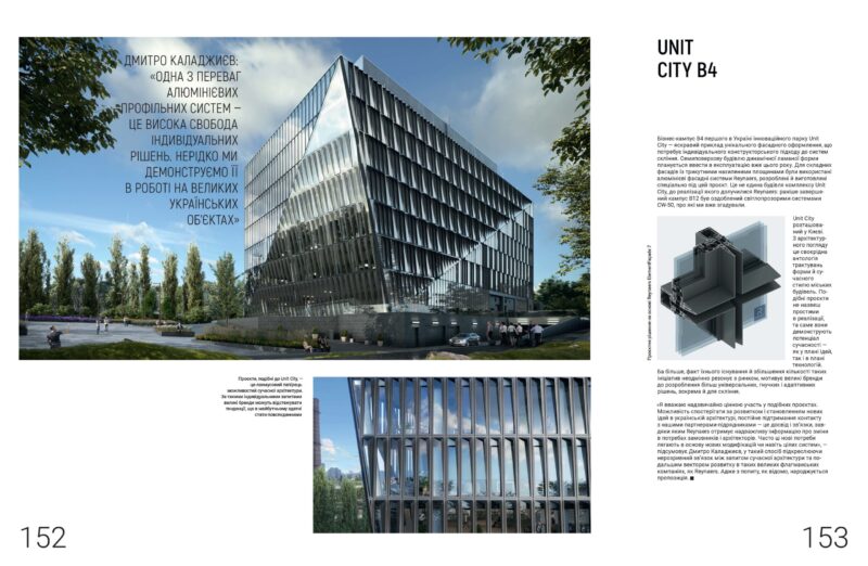 Unit City розташований у Києві. З архітектурного погляду це своєрідна антологія трактувань форми й сучасного стилю міських будівель. Подібні проєкти не назвеш простими в реалізації, та саме вони демонструють потенціал сучасності — як у плані ідей, так і в плані технологій. Ба більше, факт їхнього існування й збільшення кількості таких ініціатив неодмінно резонує з ринком, мотивує великі бренди до розроблення більш універсальних, гнучких і адаптивних рішень, зокрема й для скління.