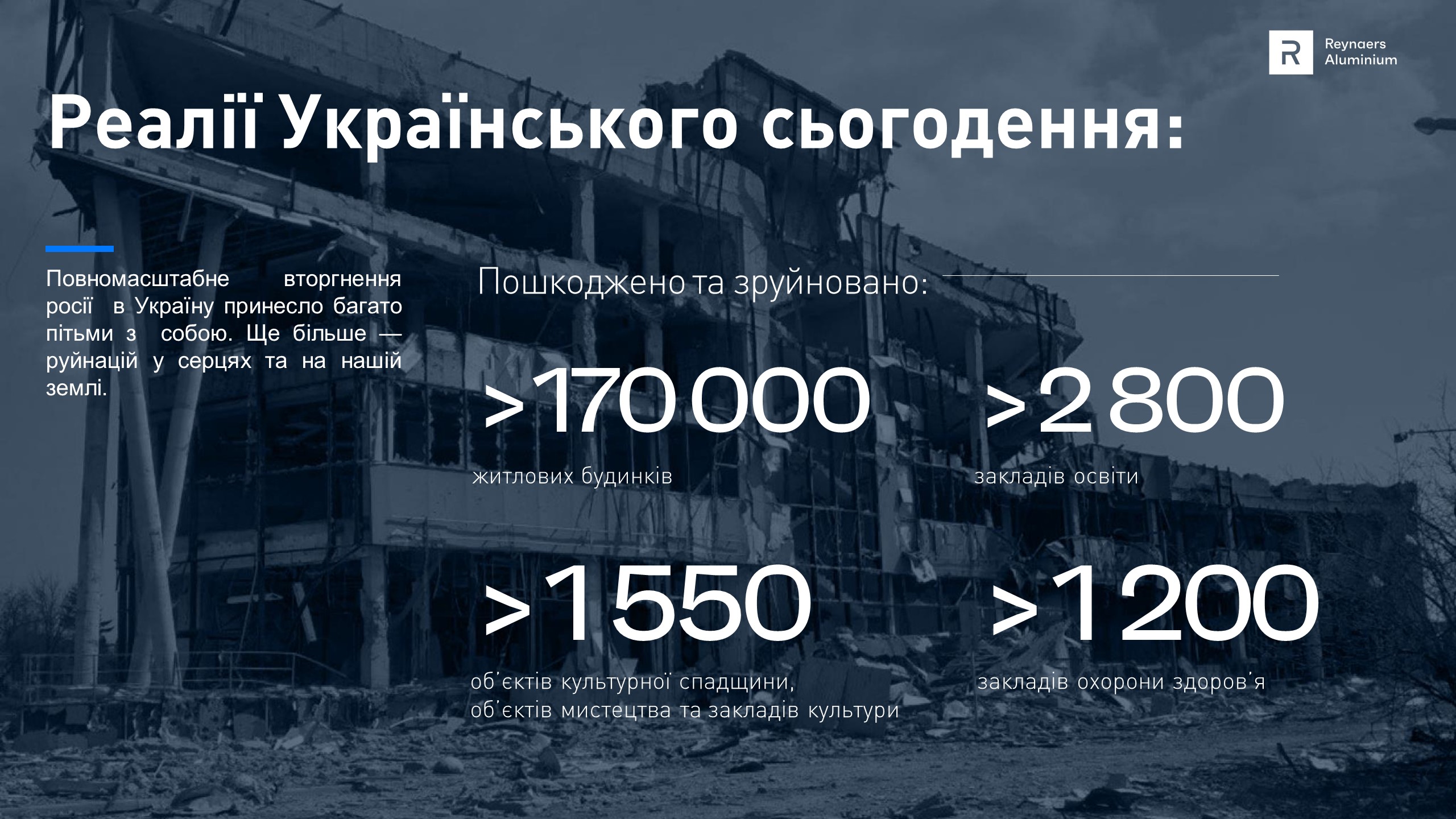 Reynaers Aluminium спеціалізується на виробництві алюмінієвих систем для вікон, дверей, перегородок і фасадних конструкцій. У своєму сегменті це, можна сказати, флагман світового ринку, а нині — ще й наш потужний партнер в ініціативах із відновлення. При цьому комерційну діяльність безпосередньо в Україні компанія провадить понад 20 років, має тут потужну виробничу базу та власних інженерів.