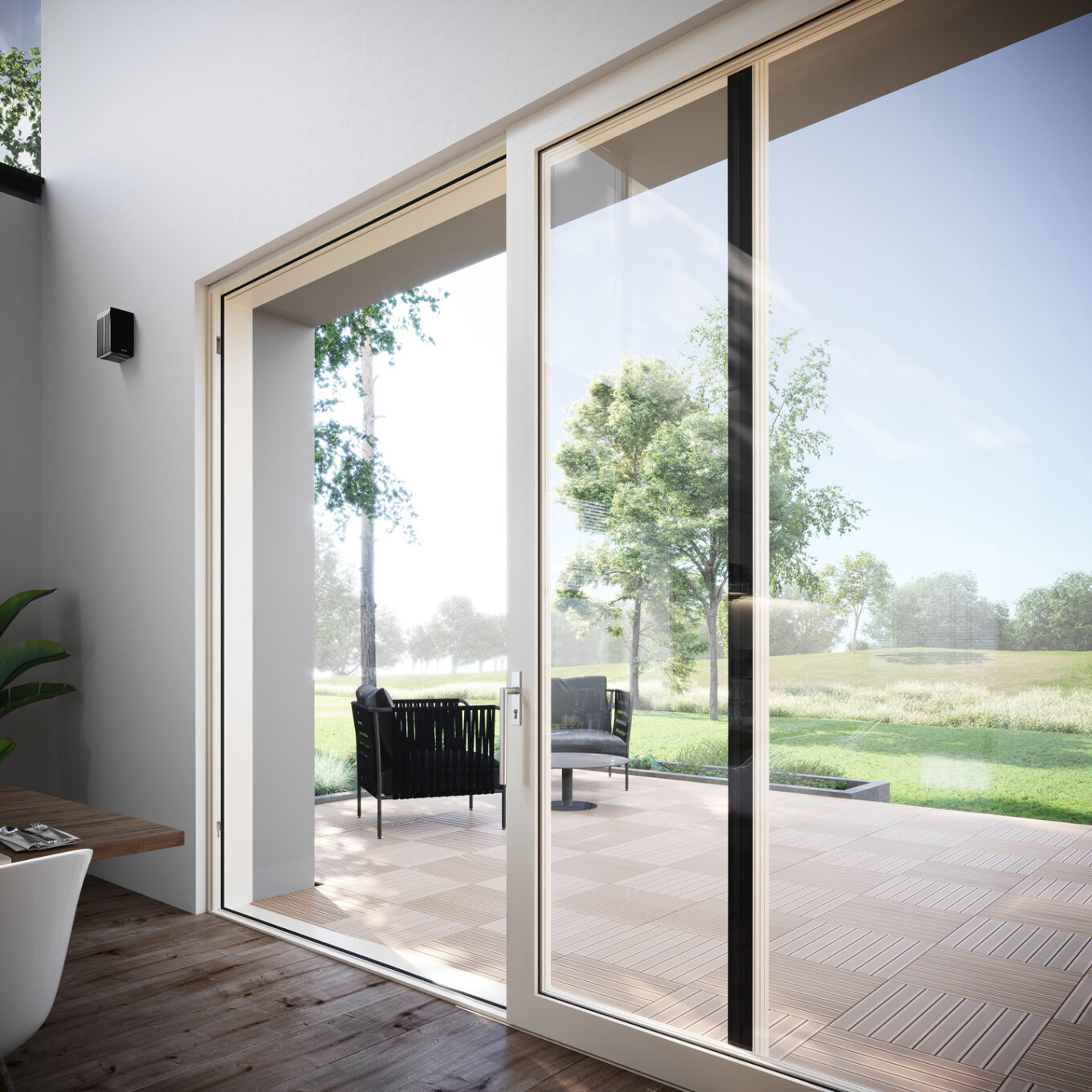 Родіон Лосєв пояснює, як це працює: «Коли ви встановлюєте розсувну систему, ви маєте рухому стулку і так звану “глуху”. Такі рішення дозволяють створити широкий панорамний огляд, візуально роблять приміщення більш просторим. Але як провітрити таке приміщення? Комбінація розсувної системи з іншими рішеннями вирішує це питання: скажімо, ви можете замінити нерухому стулку MasterPatio її вентиляційним варіантом, дверима або ж вікном серії MasterLine — це дає можливість наділити конструкцію більшим функціоналом».