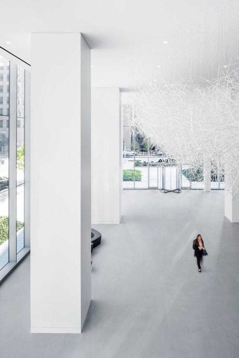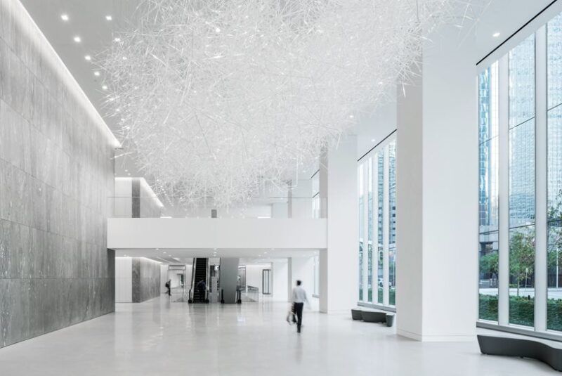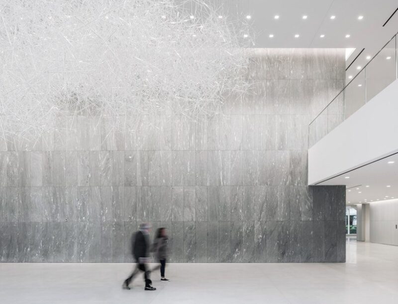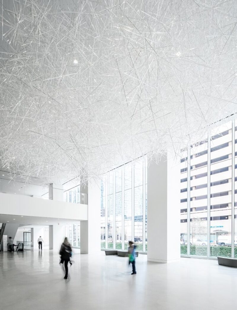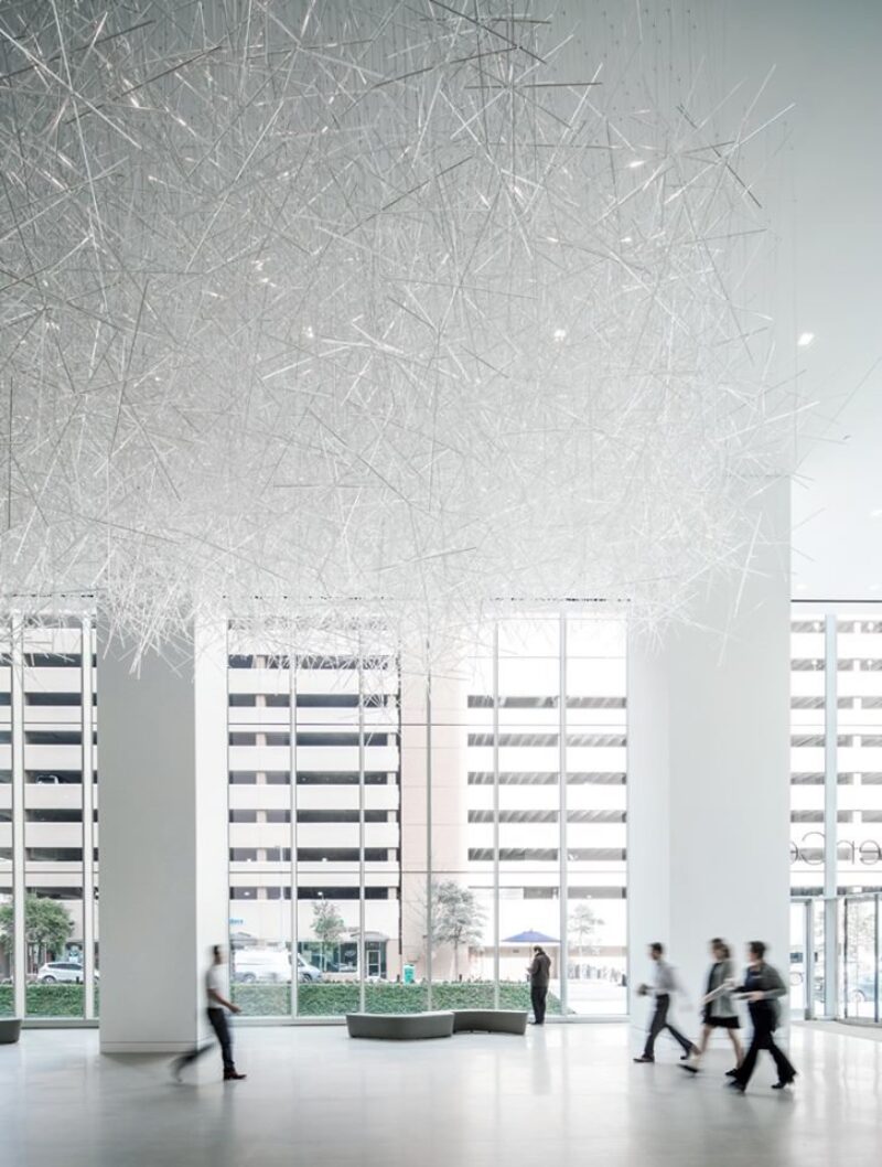 Это облако, мерцающее крошечными светодиодами, буквально парит над холлом, подвешенное к потолку на тонких стальных тросах. Эта инсталляция создана в дополнение к работам, выполненным несколькими художниками в рамках превращения мультифункционального комплекса Allen Center в новый культурный центр Хьюстона.