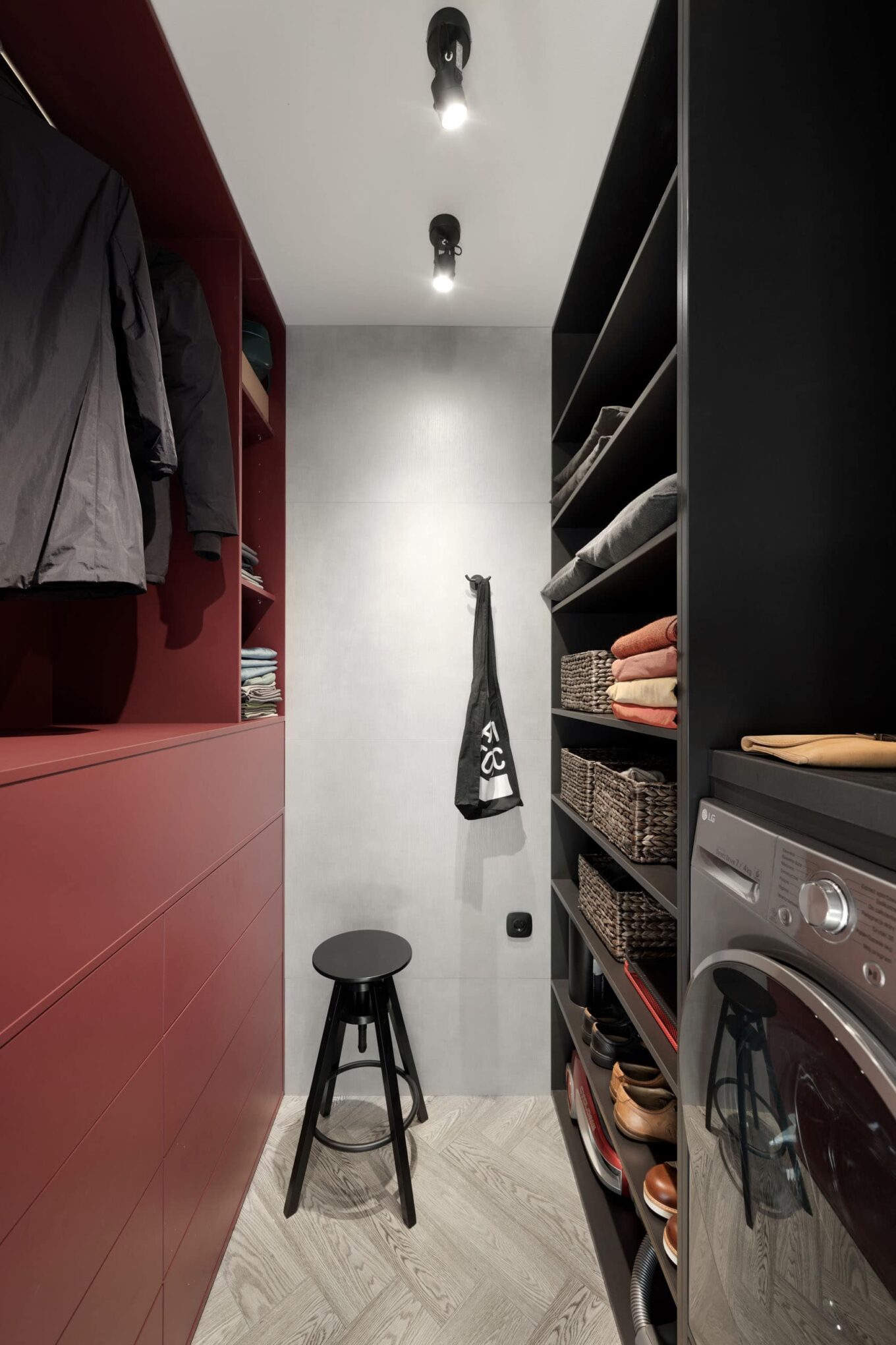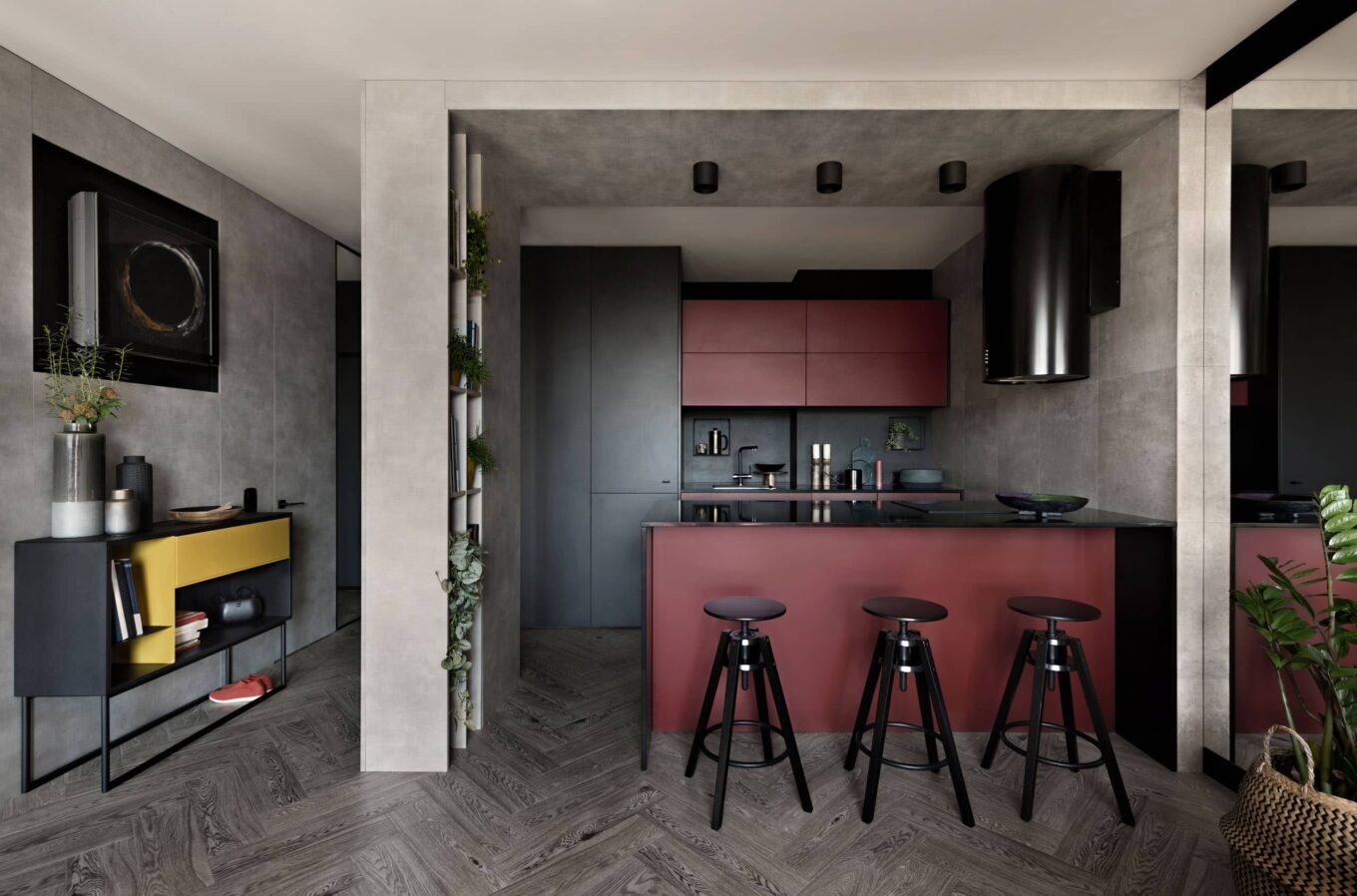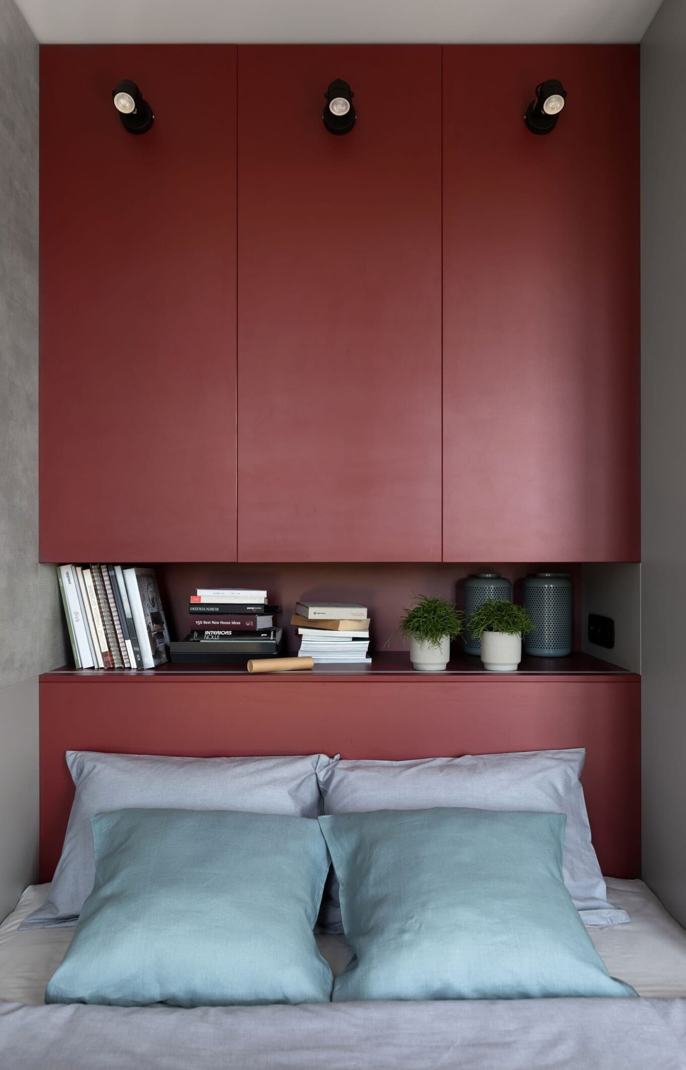 Люблю працювати з бордовим. Як щільний і складний колір, він вимагає уважного ставлення до себе. У моїх інтер’єрах бордовий з’являється, коли потрібно додати тепла в темний простір або холодну кольорову гаму. Бордовий дає інтер’єру глибину та багатошаровість відчуттів, йому потрібен такий самий складний колір-компаньйон. Якщо не знаєш, який обрати — дивись у природу. З бордовим поєднуються всі кольори червоно-золотої осені та відтінки заходу сонця. У проєкті «Бордо» цей колір з’явився саме через червоні промені призахідного сонця, які заливали кімнату.