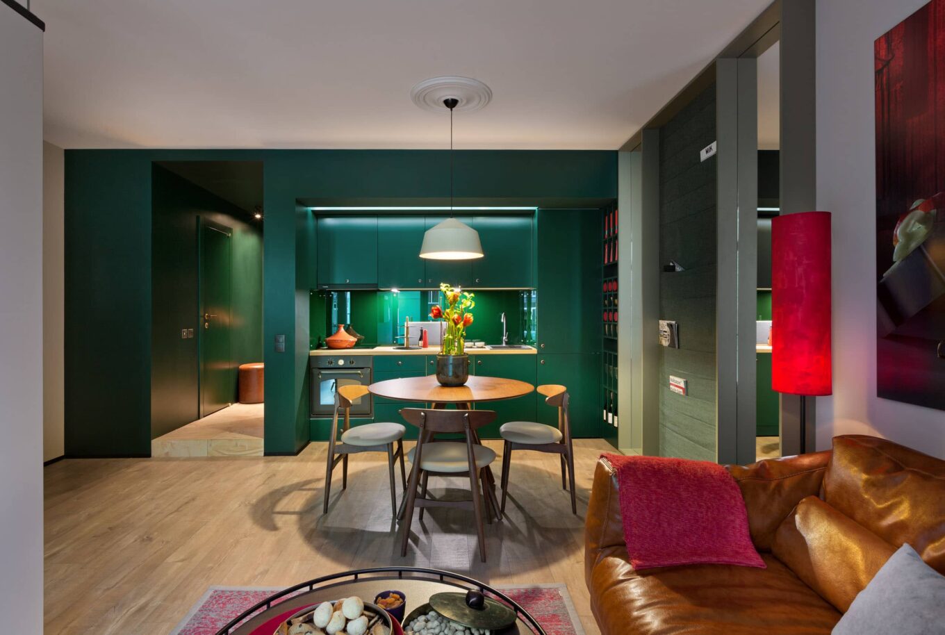 Якщо ми не можемо щось перебити — треба це посилити. Зелений інтер’єр став логічним рішенням. Щоб зігріти його, я ввела в простір рудий диван і червоні елементи. Щоб не було різкого контрасту, додала перехідні кольори, які спрацювали як розтяжка в живописі. З того часу я збираю інтер’єри як картини.