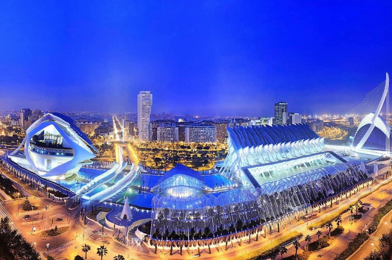 Ночная панорама – Город искусства и наук Сантьяго Калатравы. В состав комплекса входят шесть объектов: Дворец искусств королевы Софии (El Palau de les Arts Reina Sofía); кинотеатр 3D формата IMAX (L’Hemisfèric); ботанический сад (L’Umbracle); музей Науки Принца Фелипе (El Museu de les Ciències Príncipe Felipe); многофункциональный центр для проведения спортивных и культурных мероприятий (Àgora); океанариум (L’Oceanogràfic).