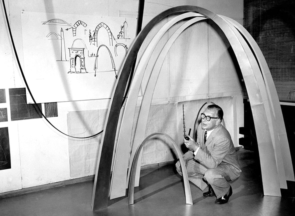 К идее вернулись лишь в 1947 году. Бюро Ээро Сааринена приняло участие в конкурсе и его проект был признан победителем. Арка из треугольного в сечении профиля, обшитая нержавеющей стальной «кожей», представляет собой уникальное инженерное сооружение. Если Ээро отвечал в основном за дизайн, разработав более двух десятков чертежей – форму Арки, ее внутреннюю и внешнюю структуру, интерьеры музея, и мастер-планы территории парка с выходом на набережную Миссисипи, то конструктивными расчетами занимались инженеры-строители норвежец Фред Северуд и немец Ханскарл Бандель.