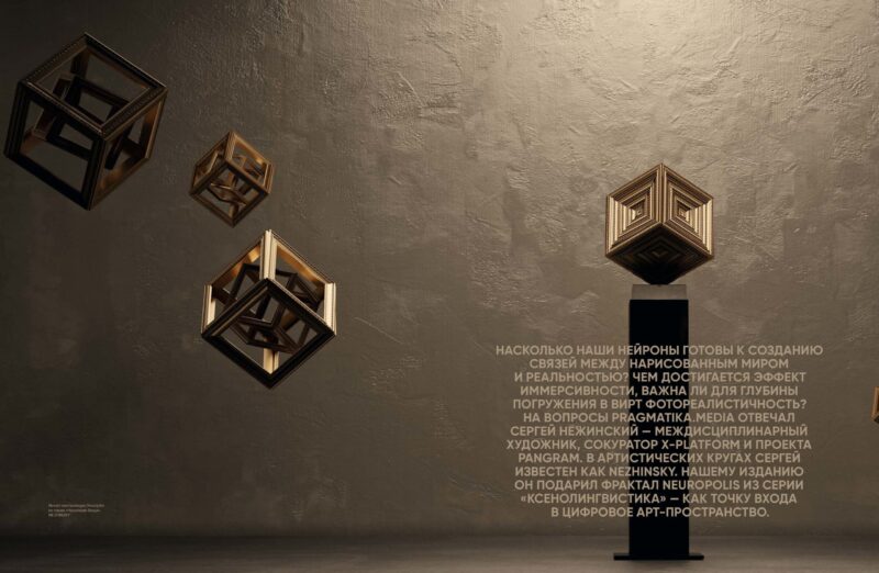 На запитання PRAGMATIKA.MEDIA відповідав Сергій Нєжинський — міждисциплінарний художник, співкуратор X-Platform і проєкту Pangram. В артистичних колах Сергій відомий як NEZHINSKY. Нашому виданню він подарував фрактал neuropolis із серії «Ксенолінгвістика» — як точку входу в цифровий артпростір.