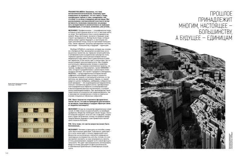 Ми створюємо інсталяції з фізичними тілами та оживляємо їх цифрою. Є зовсім екзотичні проєкти, наприклад, «Цифрове безсмертя», проєкт MEMORIA — кейс, який я розробляю з режисером Олександром Шапіро. Це проєкт міського меморіалу… MEMORIA — суперсучасний інтерактивний цифровий колумбарій, мета якого — змінити ставлення соціуму й до ритуальної естетики, і до пам’ятника як сховища певного образу, і до самої смерті в цілому.