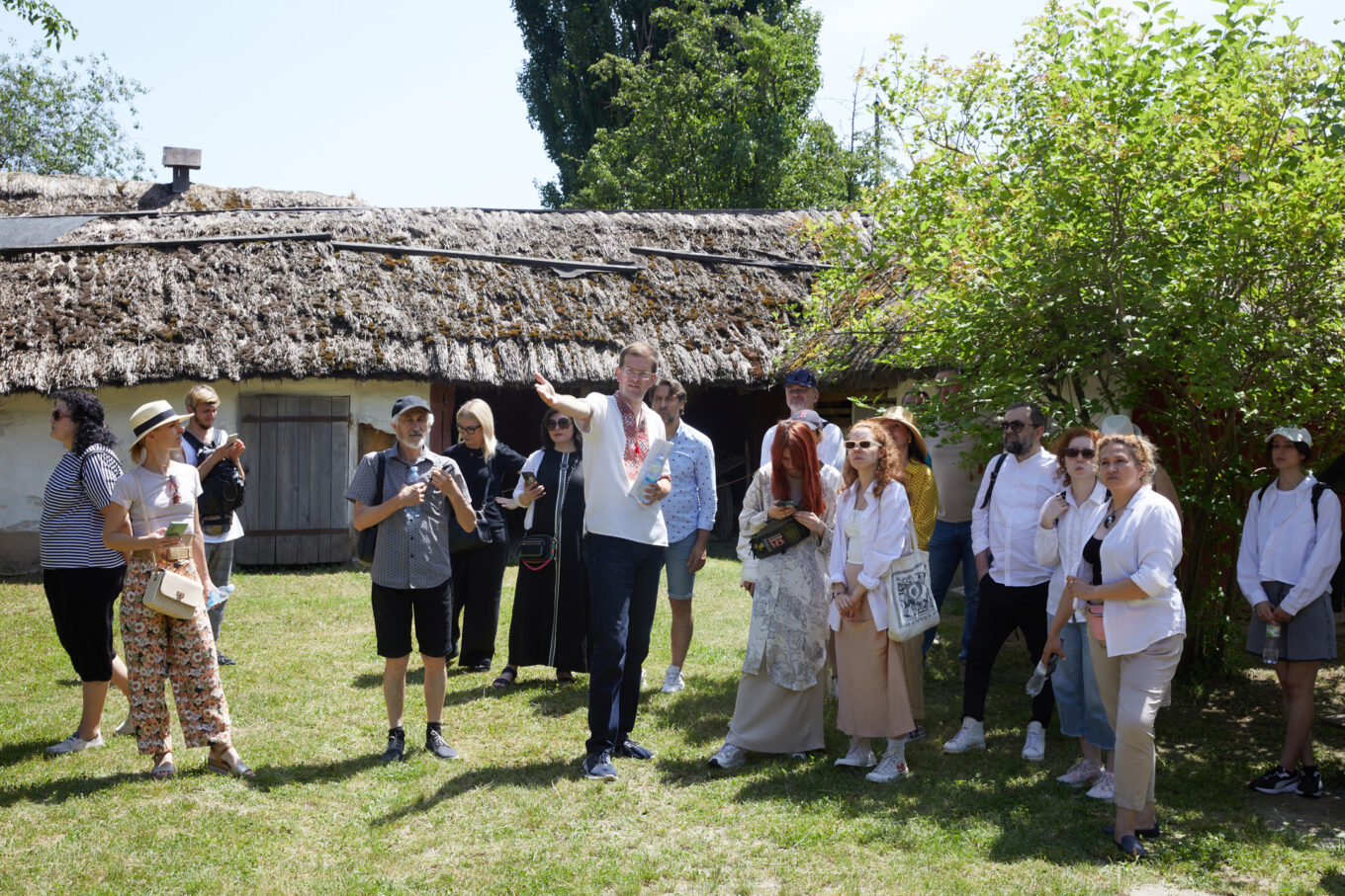 Під час прогулянки локацією «Полтавщина та Слобожанщина» гостям розповіли про архітектурний досвід, накопичений полтавськими та слобожанськими селянами. Максим Главацький, старший науковий співробітник у Національному музеї народної архітектури та побуту України, розпочав розповідь з екскурсу в історію. «Площа Музею просто неба становить 130 гектарів. Нині це найбільший музей у Європі! Наша територія поділена на 7 локацій, і сьогодні ми з вами прогуляємося по першій із них. Коли з’явилася ідея побудови музею, потрібно було знайти місце, різні локації якого нагадували б ландшафт відповідних семи регіонів країни. Вибір припав на селище Пирогів, яке тоді передмістям Києва. Протягом довгих 7 років, з 1969 по 1976 рік, працівники музею, етнографи, архітектори, фольклористи, історики та археологи їздили по Україні і збирали «матеріал» для майбутніх садиб. Експонати привозили в розібраному вигляді й укомплектовували на місці. Нині в музеї налічується 95 тисяч експонатів, але для широкого загалу відкрито лише орієнтовно 35–36 тисяч». Це не тільки споруди, а й знаряддя праці, предмети побуту.