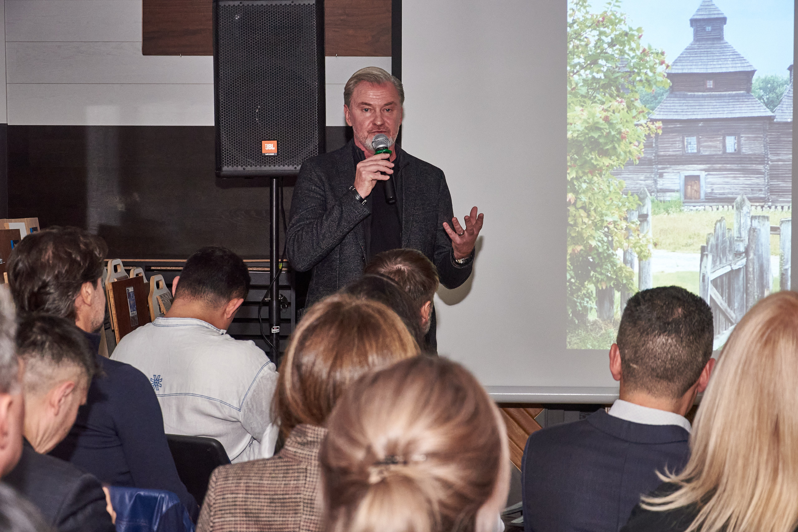 Олег Волосовський розповідає гостям про завершення серії семінарів, що пройшли в «Музеї просто неба»