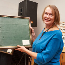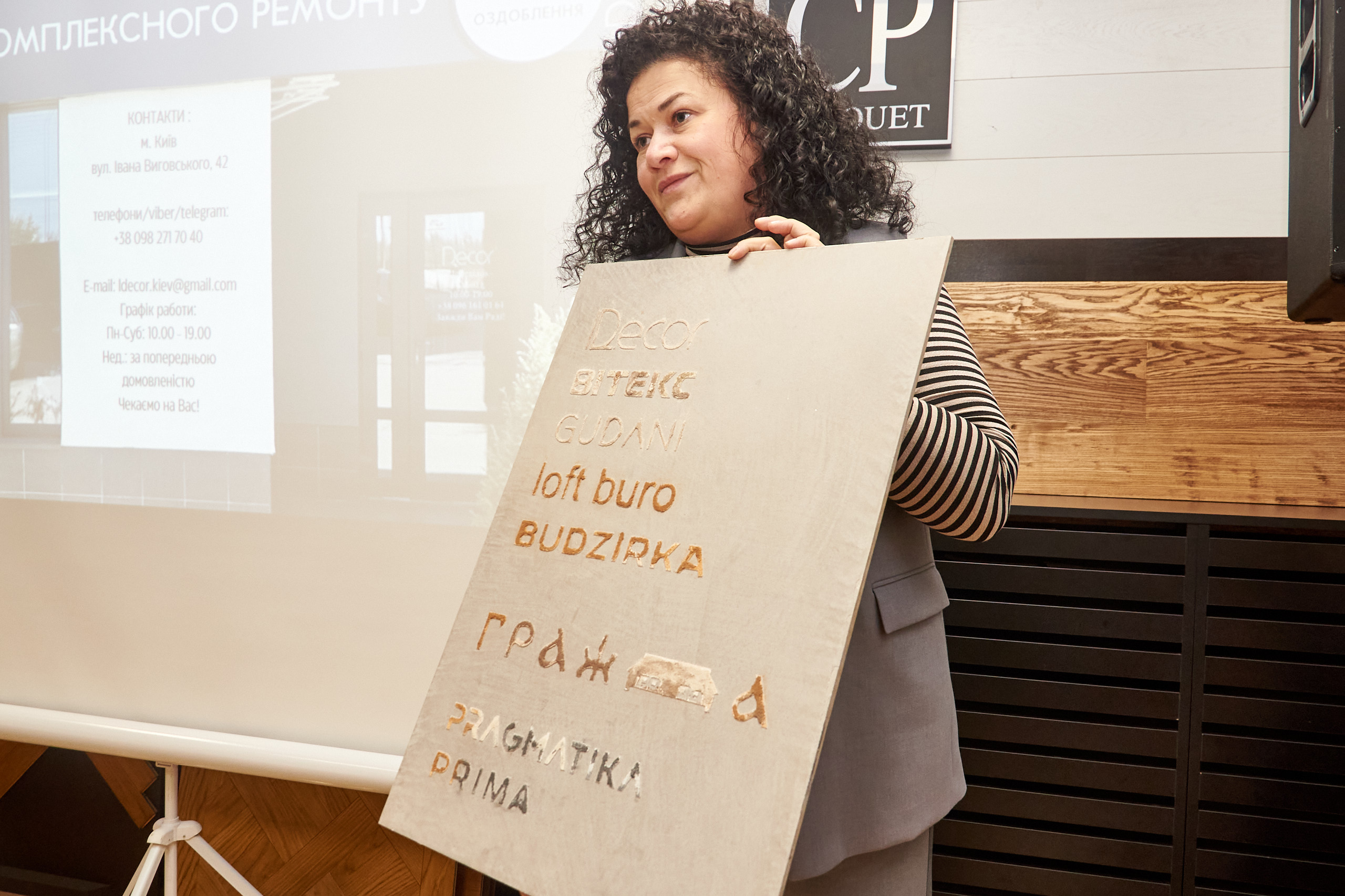 Вікторія Лубенець, співзасновниця компанії L.Decor, теж роздала гостям готові вироби. «Ми провели майстер-клас після семінару про село XX століття. Було дуже круто! Зараз я роздам вам декор для стін, який ви виготовили того дня. Я вам казала, що коли ви побачите результати, то будете здивовані, і зараз доведу, що була права», — пообіцяла вона.