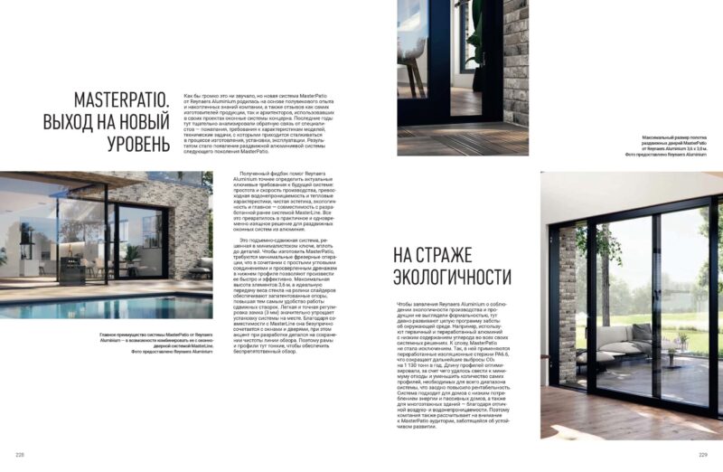 Чтобы заявления Reynaers Aluminium о соблюдении экологичности производства и продукции не выглядели формальностью, тут давно развивают целую программу заботы об окружающей среде. Например, используют первичный и переработанный алюминий с низким содержанием углерода во всех своих системных решениях. К слову, MasterPatio не стала исключением. Так, в ней применяются переработанные изоляционные стержни PA6.6, что сокращает дальнейшие выбросы CO2 на 1 130 тонн в год. Длину профилей оптимизировали, за счет чего удалось свести к минимуму отходы и уменьшить количество самих профилей, необходимых для всего диапазона системы, что заодно повысило рентабельность. Система подходит для домов с низким потреблением энергии и пассивных домов, а также для многоэтажных зданий — благодаря отличной воздухо- и водонепроницаемости. Поэтому компания также рассчитывает на внимание к MasterPatio аудитории, заботящейся об устойчивом развитии.